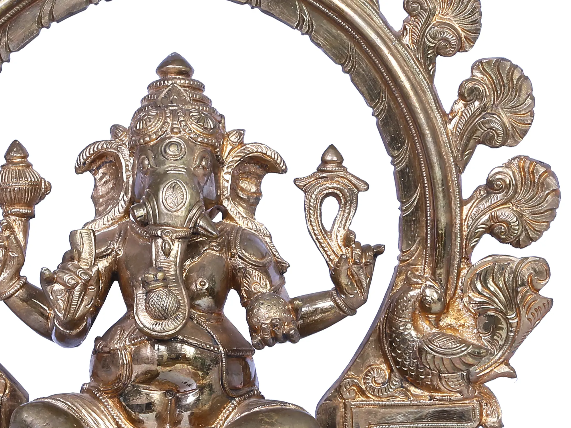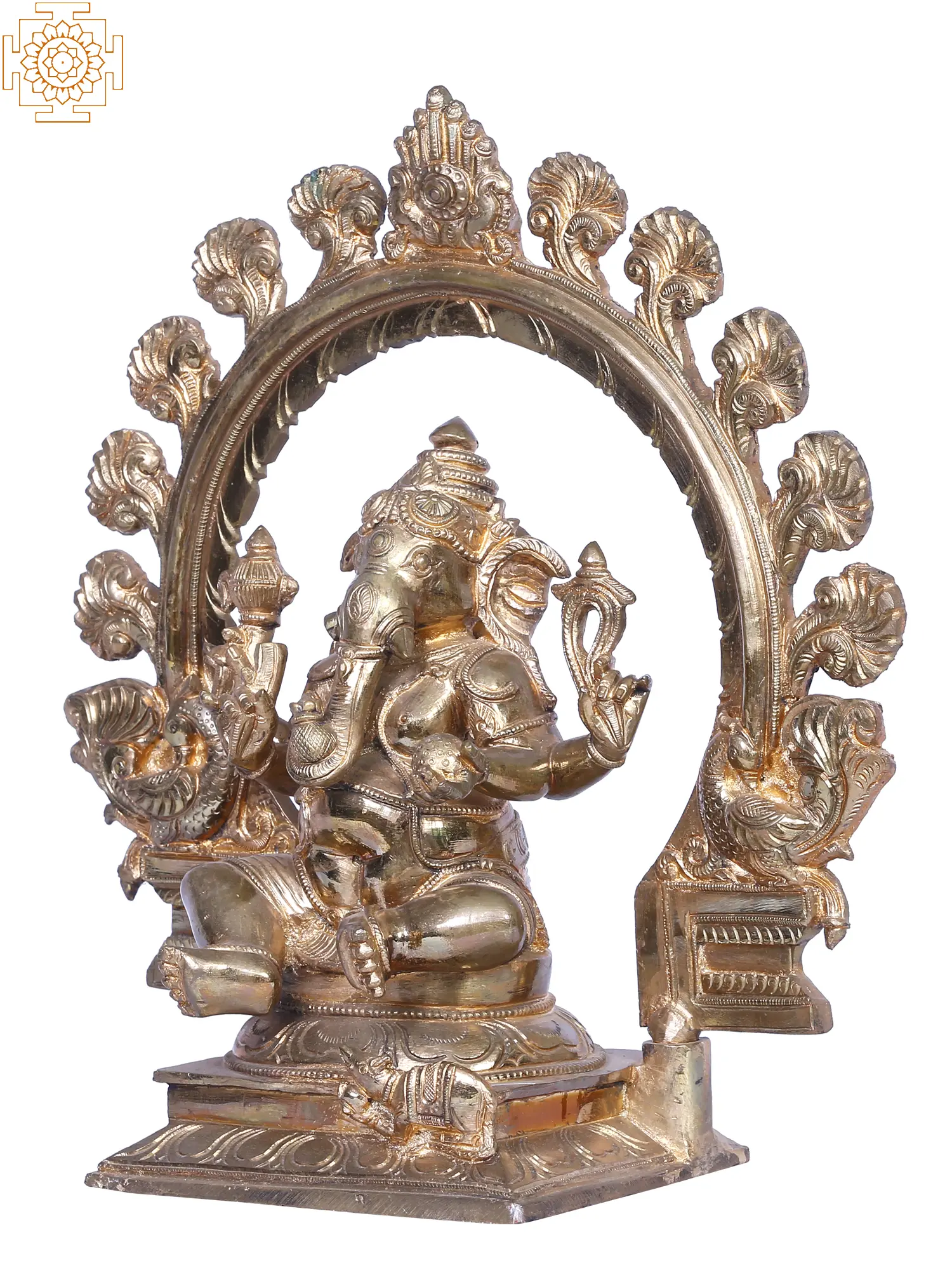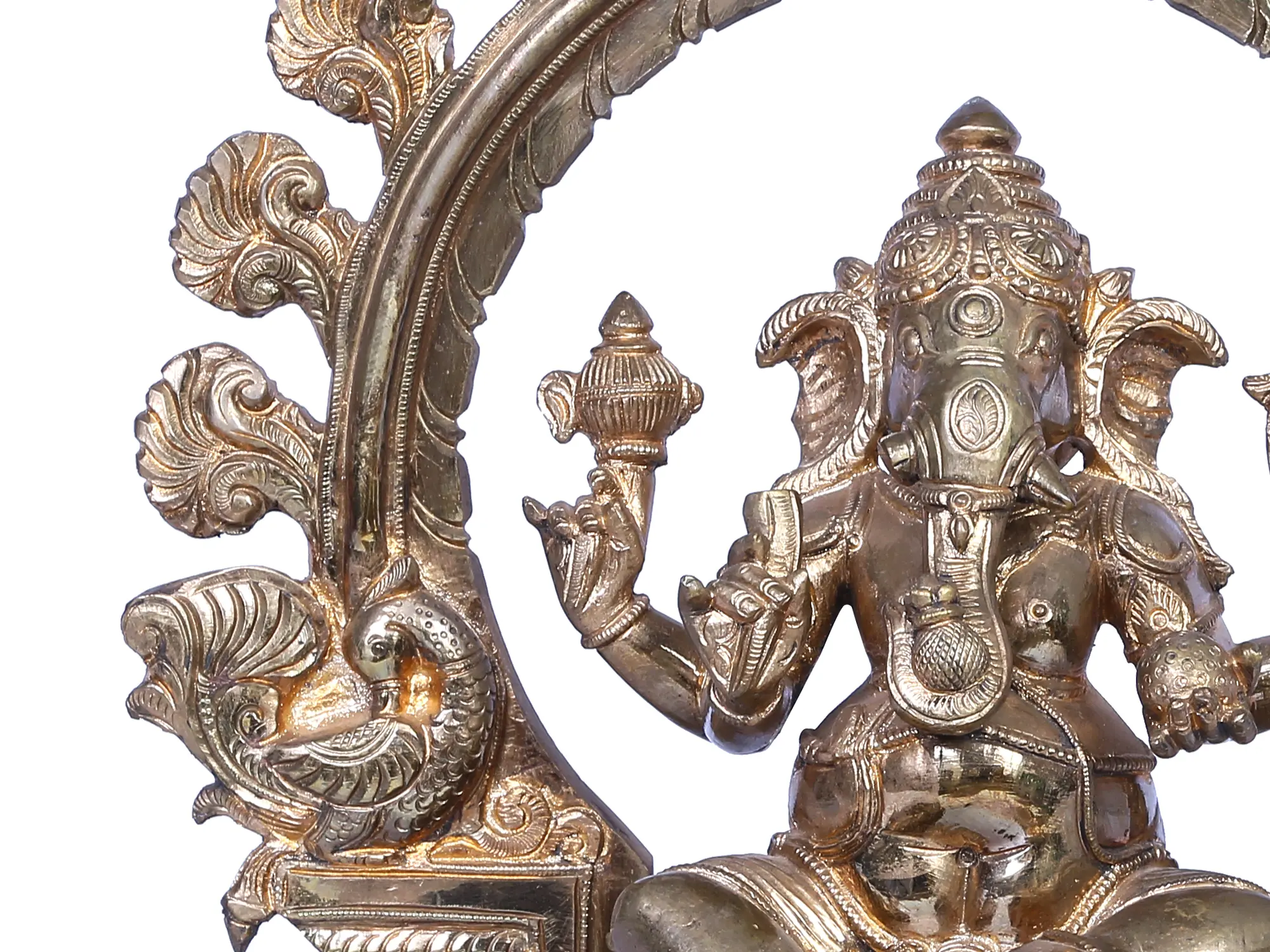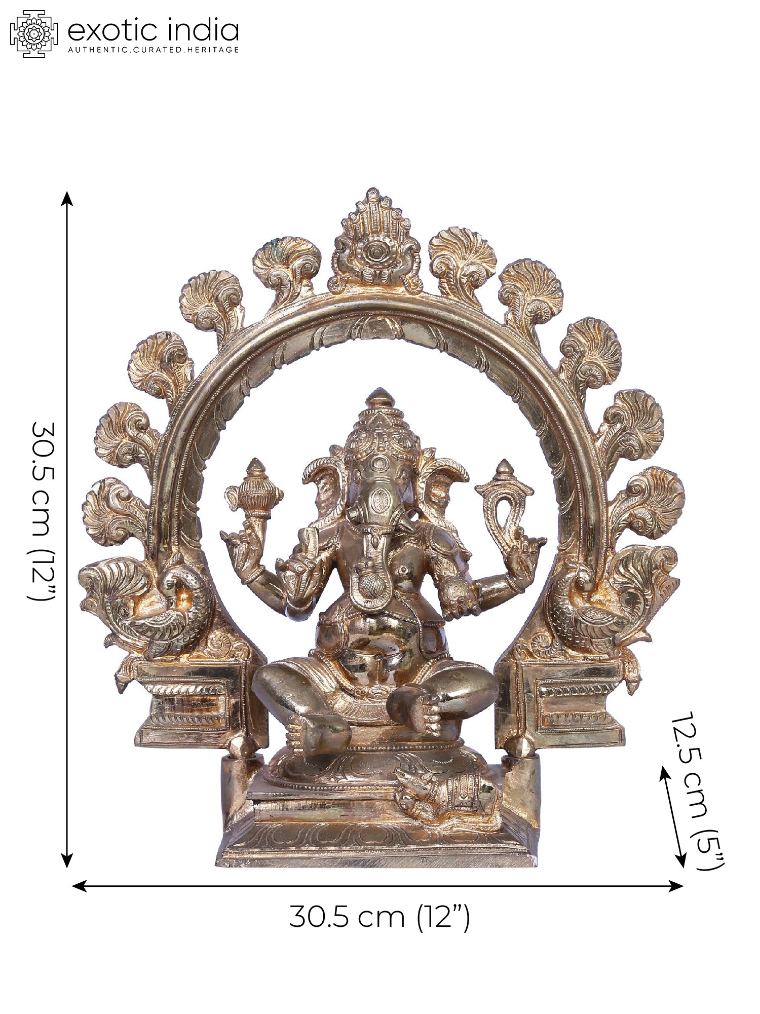 In his left hand, “a Modak”, the sweet offering, epitomises prosperity. His robust belly, a reservoir of cosmic abundance, and his coiled trunk gracefully balance a Modak. “Mushaka”, his loyal mount, bears witness to the lord’s benevolence. Crafted from Panchaloha bronze using the ancient “Madhuchista Vidhana (Lost-Wax) technique”, this divine artwork signifies Ganesha’s omnipotence, wisdom, and unwavering protection, an enchanting ode to cosmic harmony.