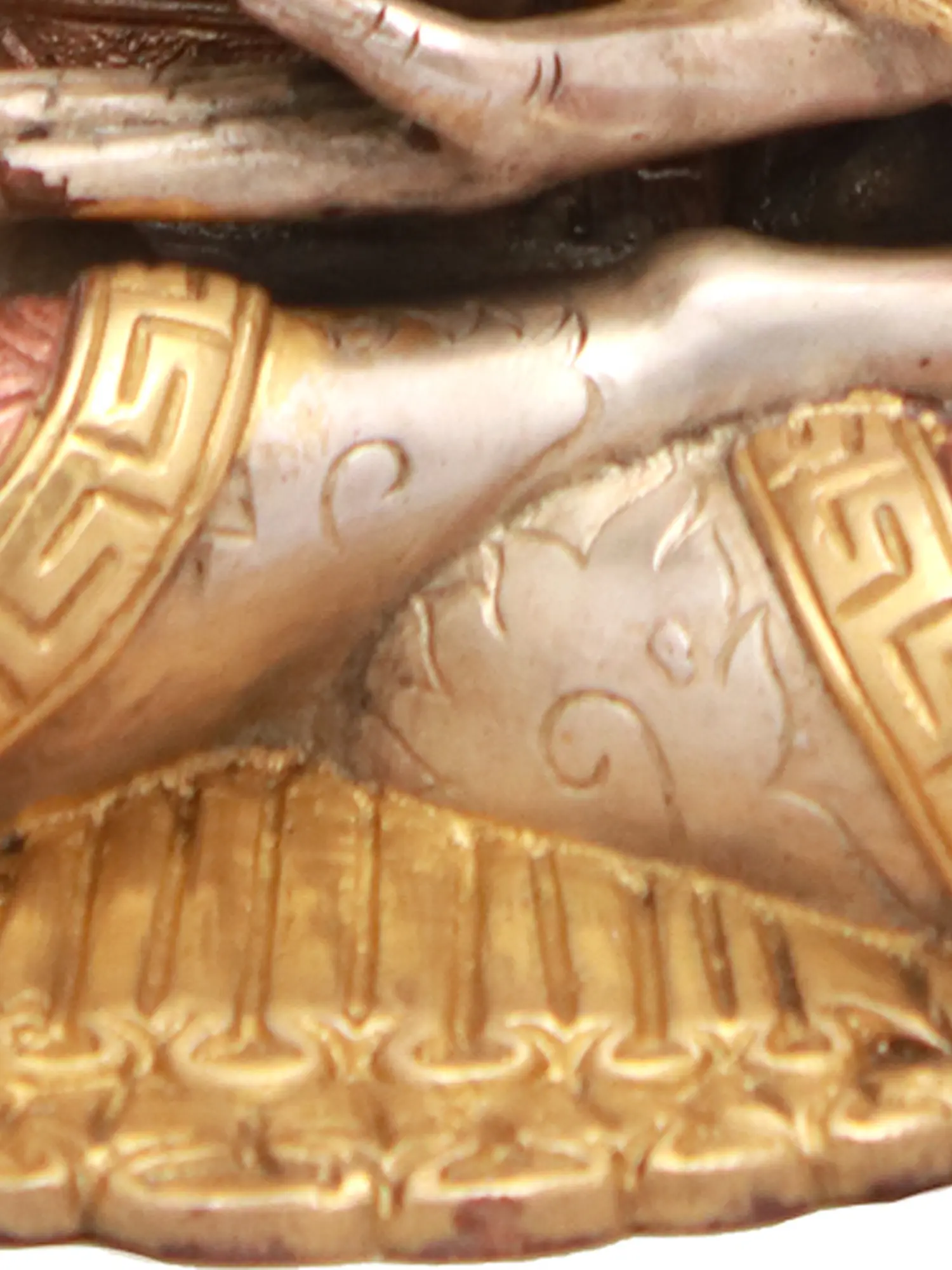 The Buddha's right hand is raised in the Vitark Mudra, a gesture universally recognized as one of teaching, argumentation, and the transmission of knowledge. This mudra symbolizes the Buddha's pivotal role as the Awakened One, who shared his profound insights and wisdom with the world. It represents the continuous flow of spiritual discourse, encouraging debate and understanding. With the thumb and index finger touching, forming a circle, it signifies the perfection of wisdom and the unity of method and wisdom. This gesture invites contemplation and offers a visual representation of the path to enlightenment, as expounded in the ancient teachings.