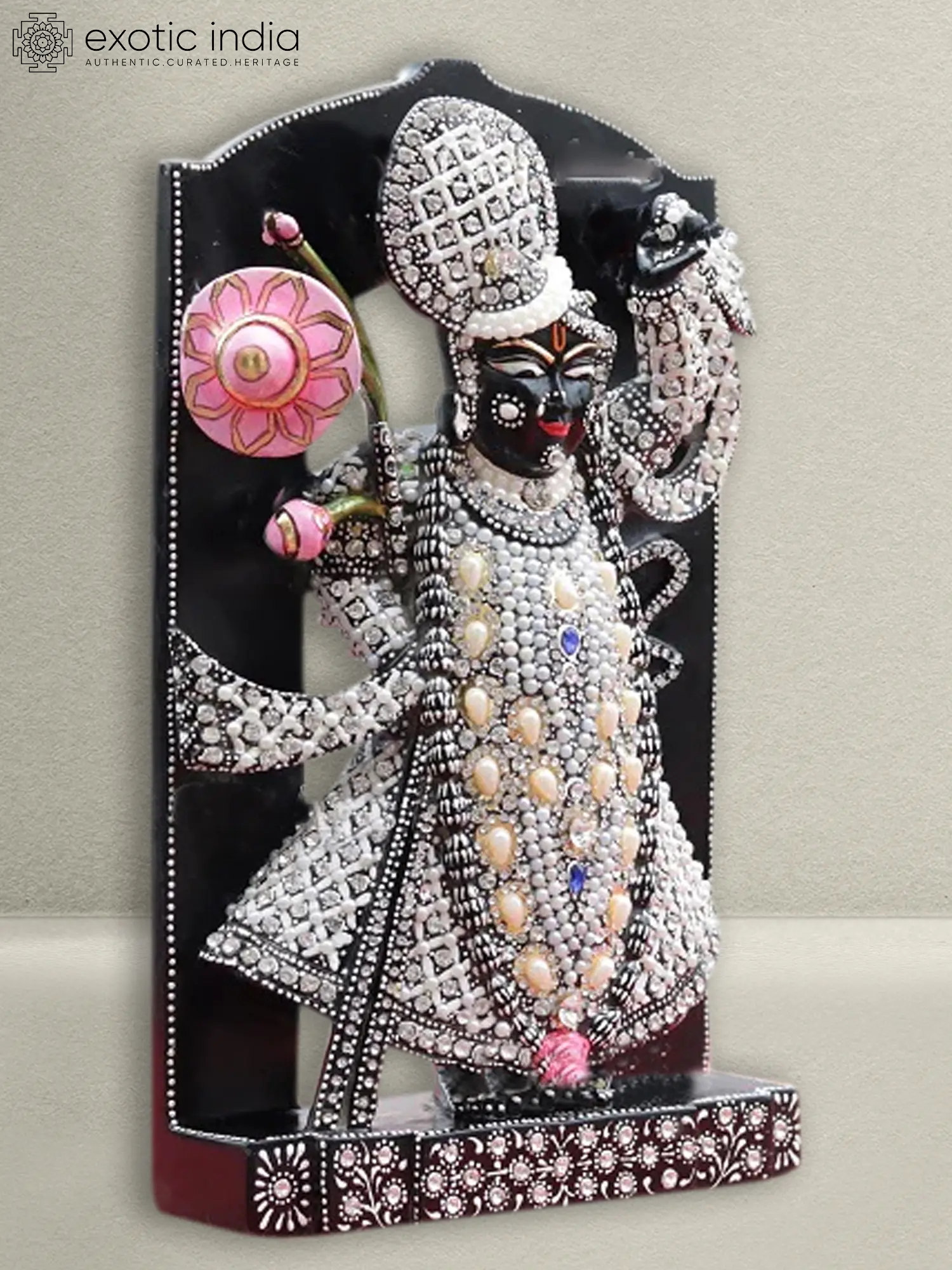The figurine is adorned with a rich tapestry of simulated pearls and sparkling stones, creating a visual spectacle that is both opulent and deeply spiritual. The pearls, reminiscent of the celestial pearls of the Puranas, add a soft luminescence, while the clear stones catch the light, symbolizing the divine effulgence of the deity. The iconic floral motif, rendered in delicate pink, is a recurring element, symbolizing purity, prosperity, and the beauty of divine love. This embellishment is often associated with the offerings made to deities, signifying devotion and reverence. The artistic tradition of Rajasthan is renowned for its rich heritage of miniature paintings and stone carving. This figurine is a testament to that legacy, showcasing a fusion of traditional craftsmanship with contemporary sensibilities. The use of black marble, sourced from the quarries of Rajasthan, adds a unique character to the piece, reflecting the geological wealth of the region and the artistic ingenuity of its people. The intricate patterns on the base and along the edges further enhance the aesthetic appeal, creating a harmonious and visually pleasing composition. Shrinathji’s presence is believed to bring peace, prosperity, and protection to the home. This meticulously crafted figurine serves not only as a beautiful decorative piece but also as a focal point for prayer and meditation, allowing devotees to connect with the divine presence of Shrinathji. The figurine’s presence can evoke the spirit of the ancient tales of Krishna’s childhood in Gokul and Vrindavan, bringing a sense of sacredness and divine grace into any space. It is a piece that resonates with devotional sentiment, celebrating a significant deity in the Hindu pantheon.
