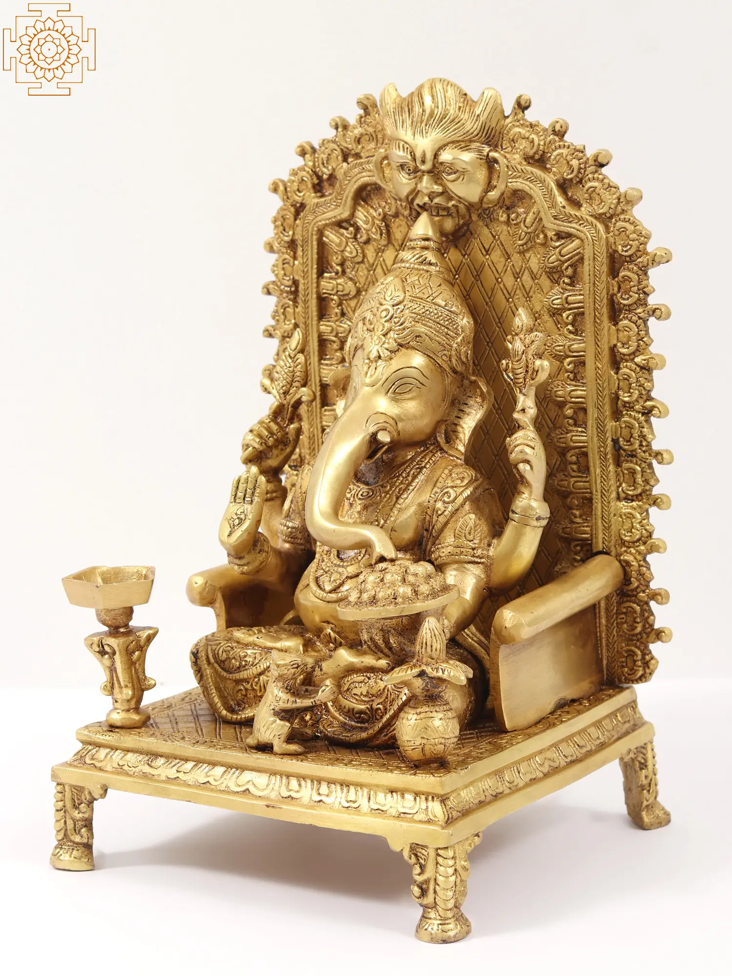 Enthroned on a majestic throne, emanating a divine grandeur, the first-revered Sri Ganesha animates this brass statue with his presence. The Simhasana of Sri Ganesha is sculpted exquisitely, like a royal seat, with the Kirtimukha delineated in a vigorous mood, protecting the sacred aura of Ganesha. Floral motifs and lattice patterns adorn the back of the throne, on which Ganapati sits in a regal posture, accompanied by propitious attributes such as Modak and Purnaghata, and with his Mushaka near his feet, who innocently holds a Modaka in his hand, ardently offering it to the beloved Lord of the Universe.