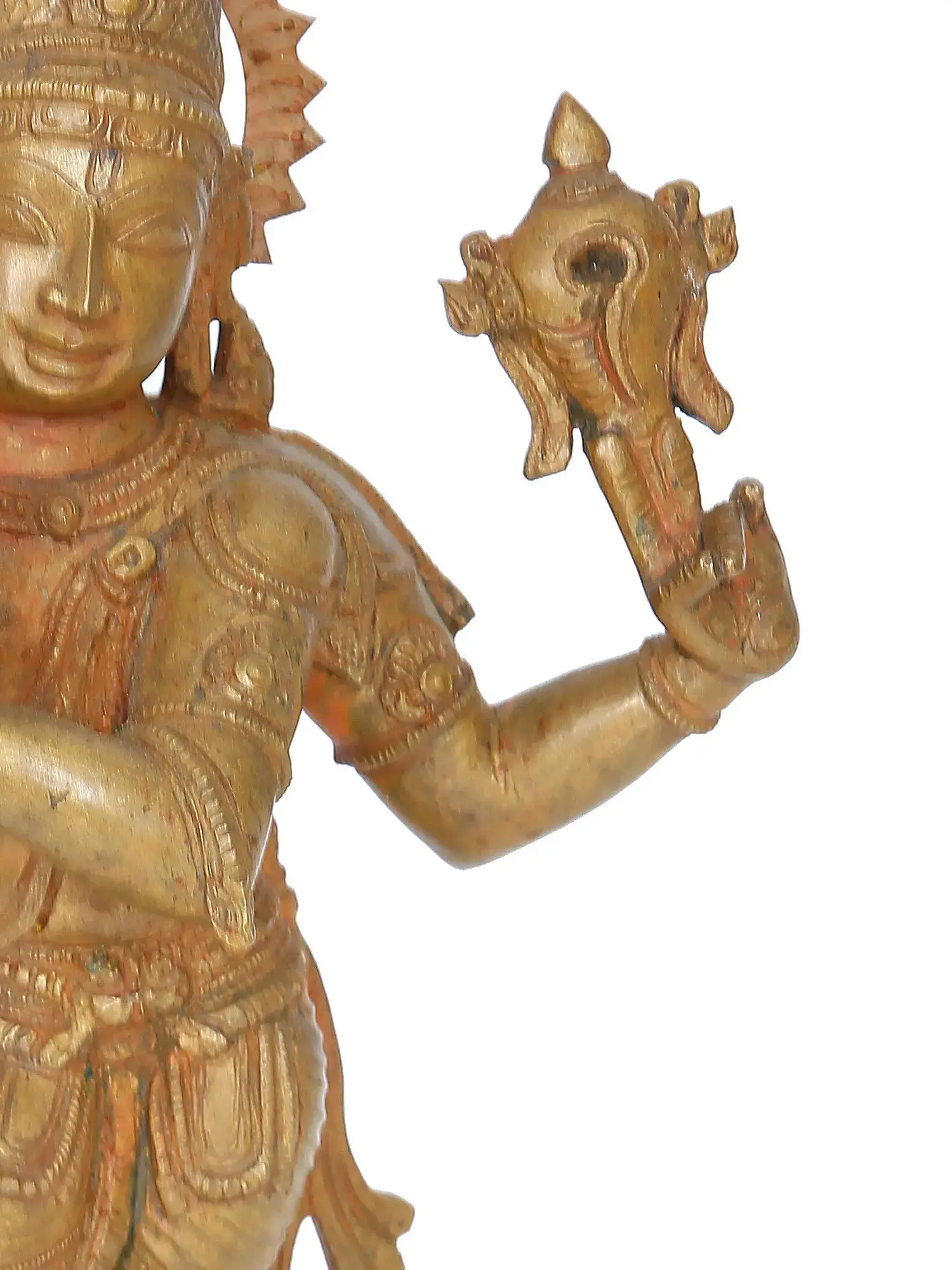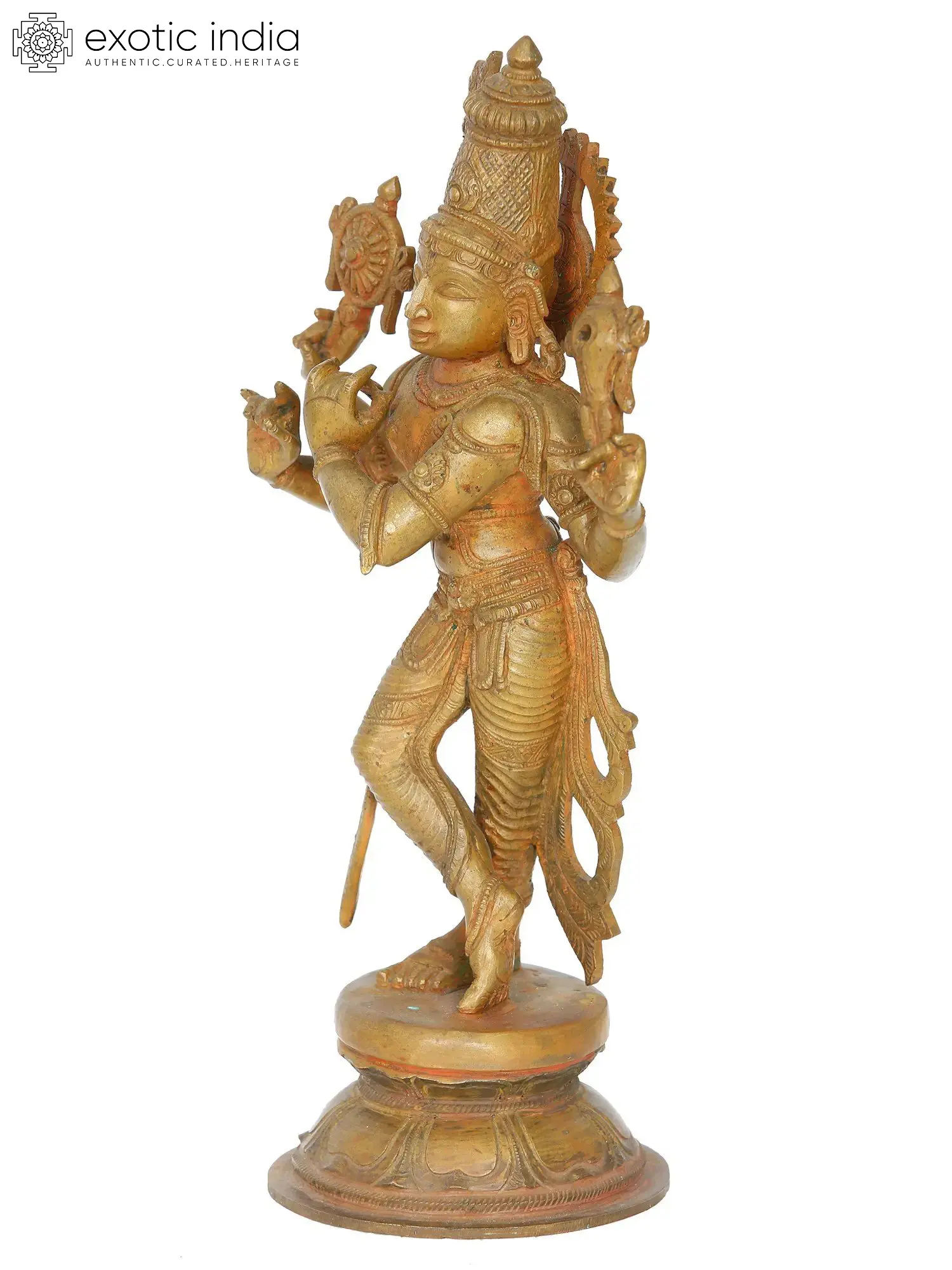 Elevate your spiritual space with the Chaturbhuja Krishna sculpture, a sublime creation using the Madhuchista Vidhanam in Swamimalai's Panchaloha Bronze. The four-armed Krishna, symbolising cosmic energy, embodies the Hindu philosophical concept of 'Dharma.' Each arm signifies righteousness, duty, prosperity, and spiritual liberation. The lost-wax technique captures the intricate details of Krishna's divine form, enhancing the spiritual significance of the sculpture. Immerse yourself in the cosmic dance of Chaturbhuja Krishna, reflecting the eternal interplay of life's essential principles