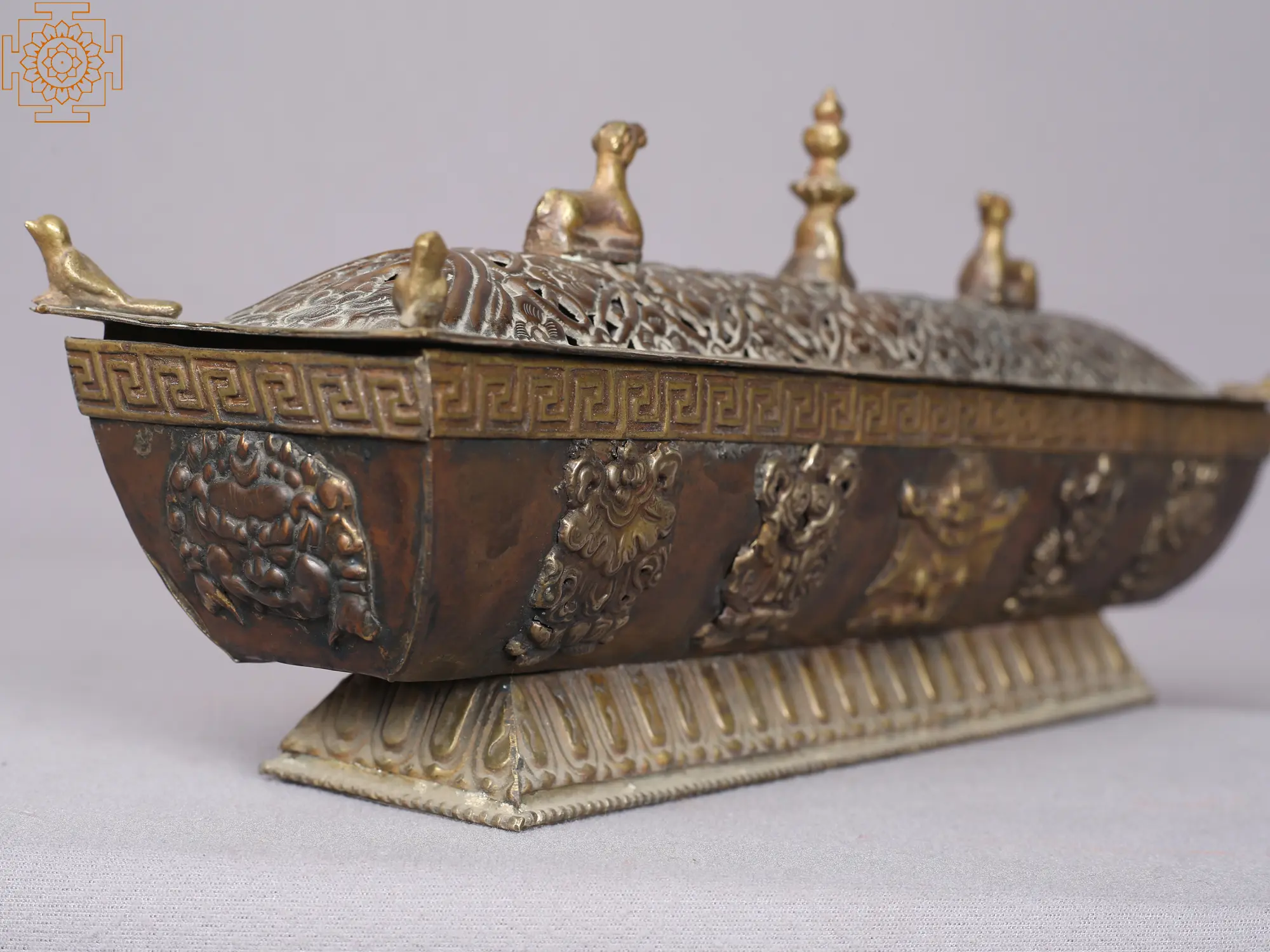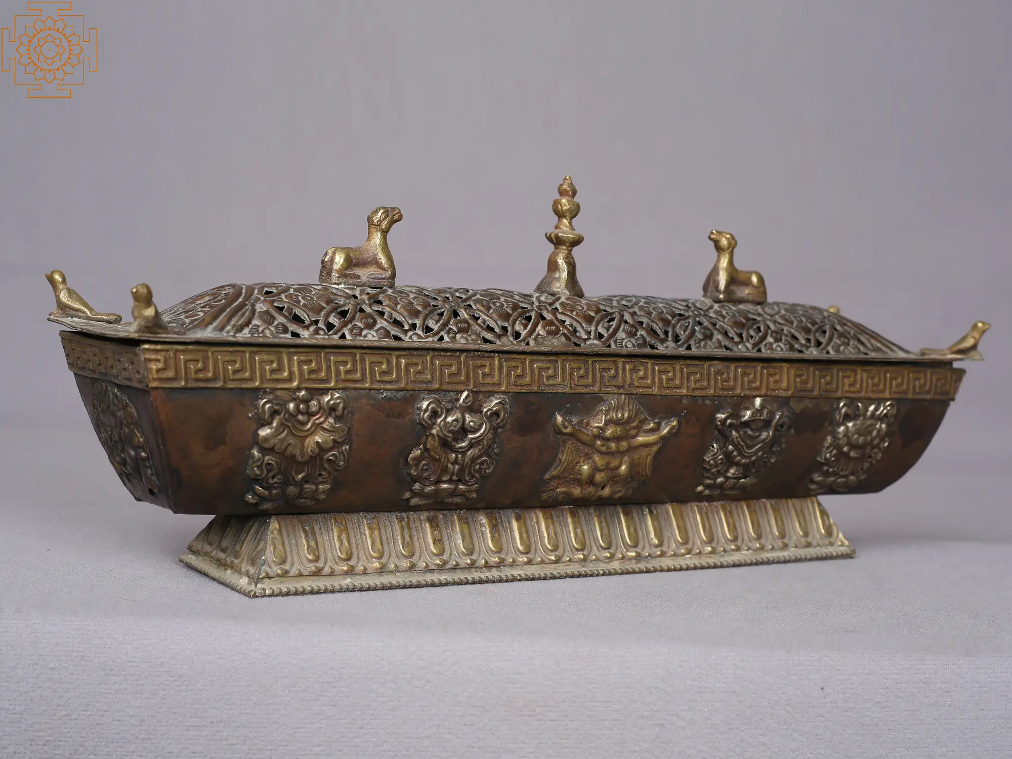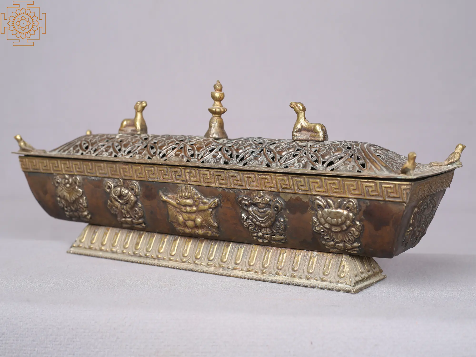 The Pagoda-style Tibetan incense burner is a visually captivating and spiritually significant piece of artistry made in copper. Crafted with intricate details, it emulates the traditional Tibetan pagoda architecture, symbolizing spiritual ascension and elevation of consciousness. This handcrafted and lidded incense burner has two deer on the top of the lid, symbolizing the turning of the dharma wheel in Sarnath, India's deer park. The Buddhist eight fortunate signs are depicted on the incense burner base: the dharma wheel, victory banner, conch shell, fish, parasol, lotus flower, unending knot, and prosperity vase. Smoke wafts through the openings, creating a serene and sacred ambiance during Tibetan rituals and meditation. The pagoda-style incense burner not only serves a functional purpose but also carries a profound symbolic weight, connecting practitioners to the rich spiritual heritage of Tibet.