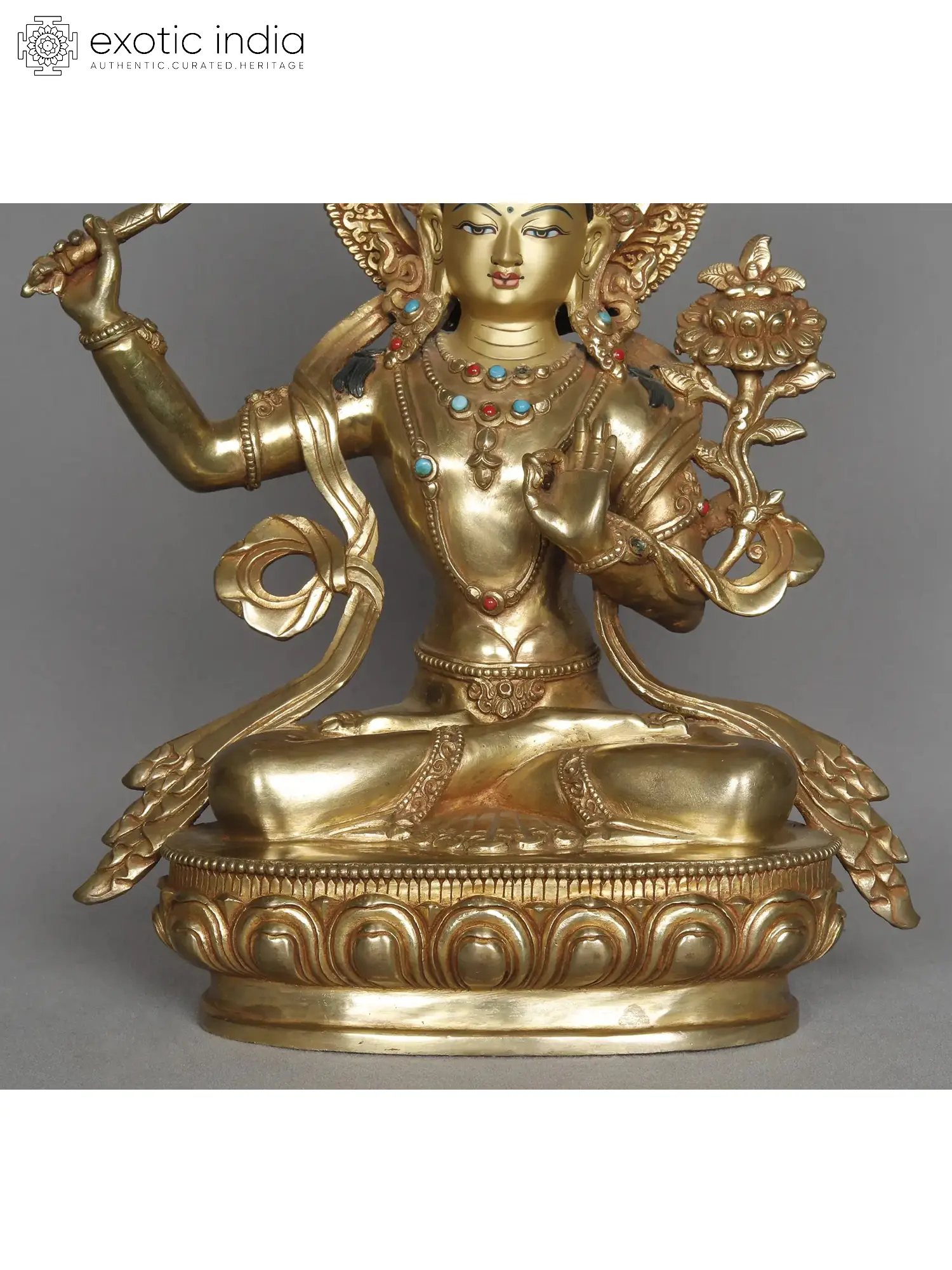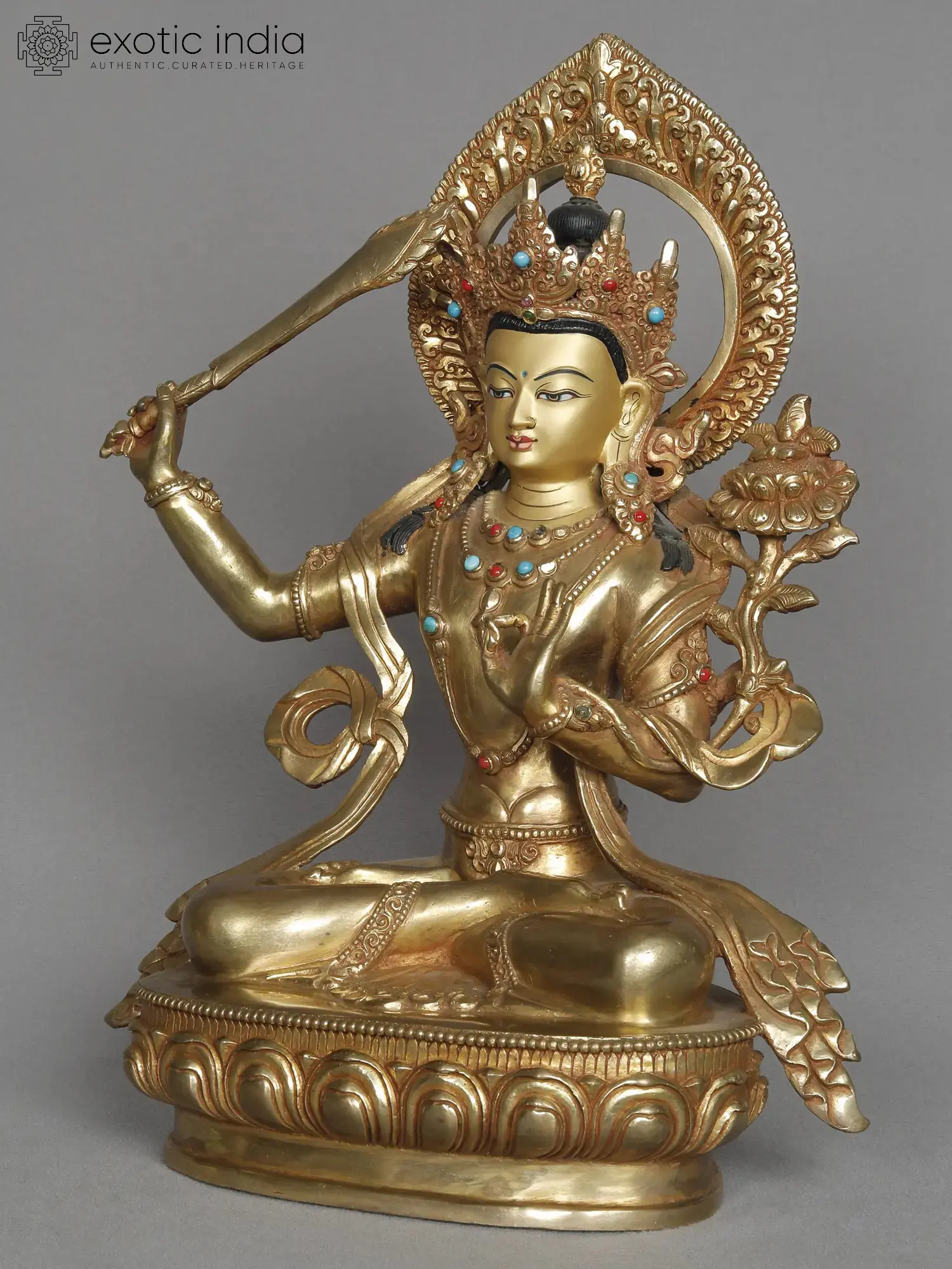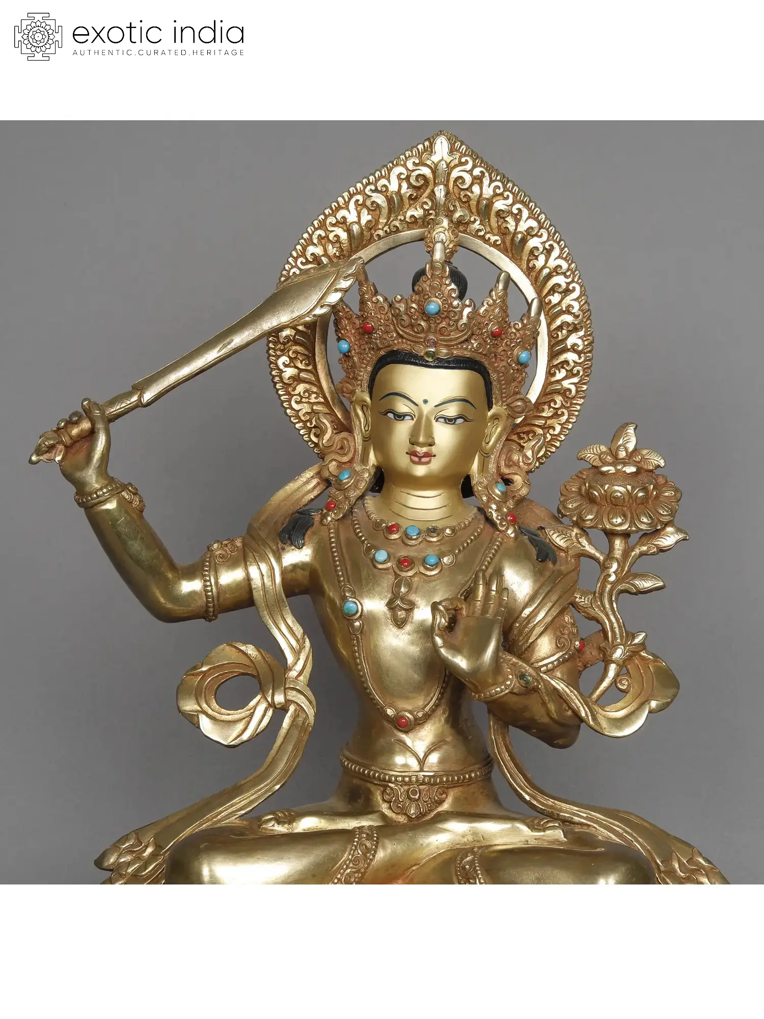 This magnificent statue embodies Manjushri, the Bodhisattva of Wisdom, a revered figure in Mahayana Buddhism. Crafted with exquisite skill in Nepal, this piece is a testament to the enduring artistic traditions of the region. The lustrous copper, accented with gold, radiates a warm, ethereal glow, capturing the divine essence of this enlightened being. Manjushri is often depicted holding a flaming sword, symbolizing the cutting through of ignorance and delusion, and a lotus flower, representing purity and enlightenment. This statue masterfully portrays these iconic attributes, inviting contemplation and spiritual connection. ––––––––––––––––––