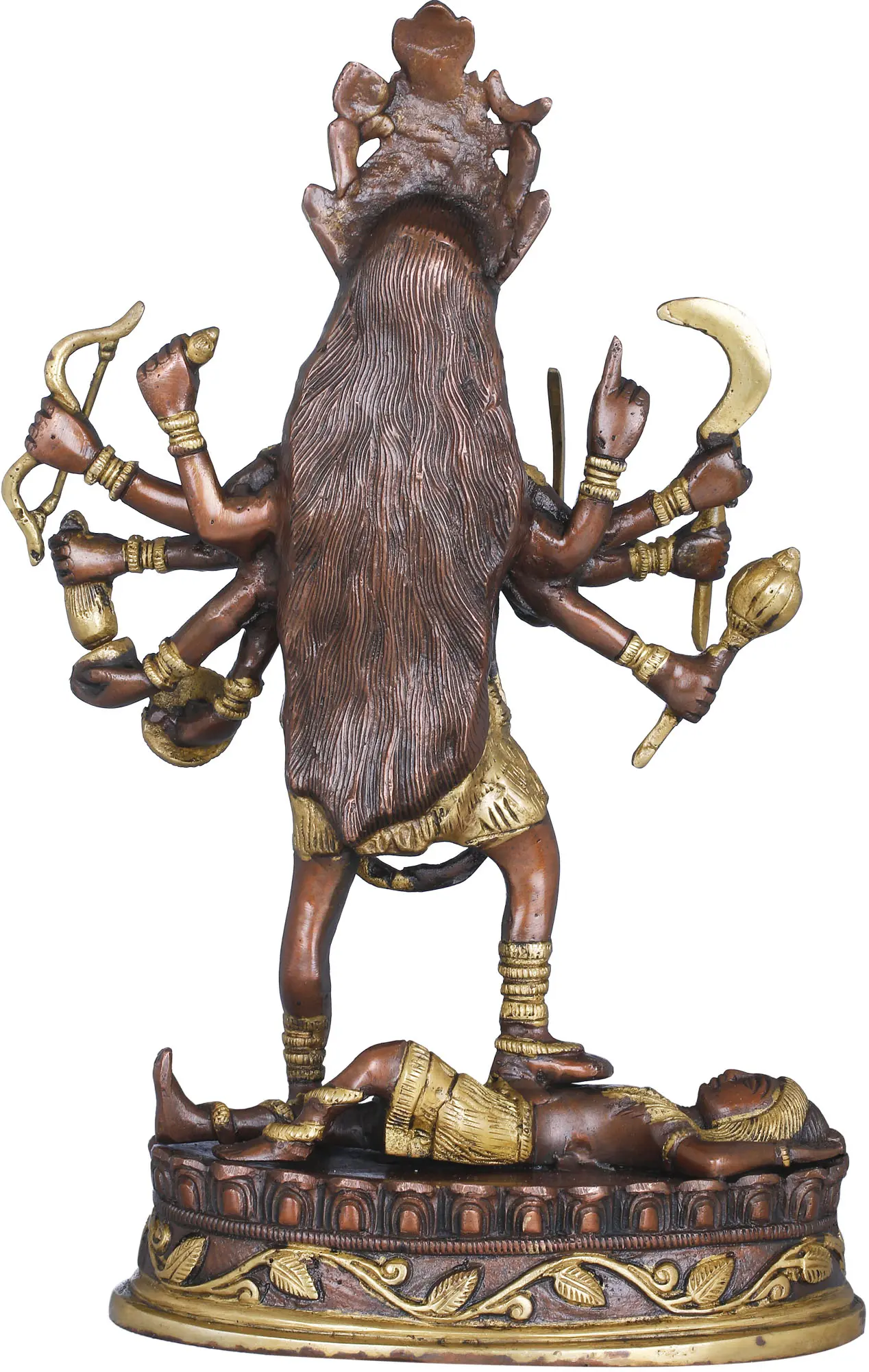 Legend has it that her intoxication with the blood of demons was quelled only when she stepped on Lord Shiva. This intricately crafted brass statue beautifully contrasts her golden jewelry with her dark complexion. Bring home the divine energy and captivating artistry of Maa Kali with this exceptional masterpiece.