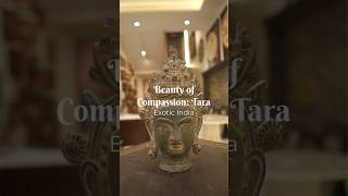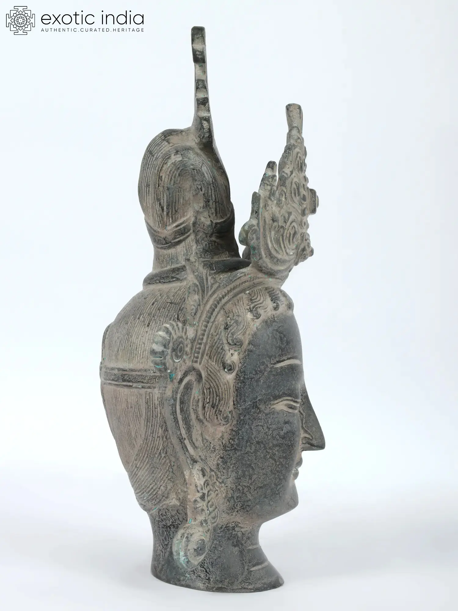 Behold this exquisite brass rendering of the revered Goddess Tara, a figure synonymous with compassion, protection, and the overcoming of obstacles. This striking head, sculpted with remarkable detail, invites contemplation and spiritual connection. The serene expression, with its downcast eyes and gentle lips, speaks of profound wisdom and an unwavering presence of empathy. The intricate crown adorning her head, a symbol of her enlightened status, is a testament to the masterful craftsmanship. Each curve and embellishment of the crown, from the central jewel-like motif to the delicate scrollwork, is meticulously rendered, suggesting the divine radiance of the goddess. ––––––––––––––––––––