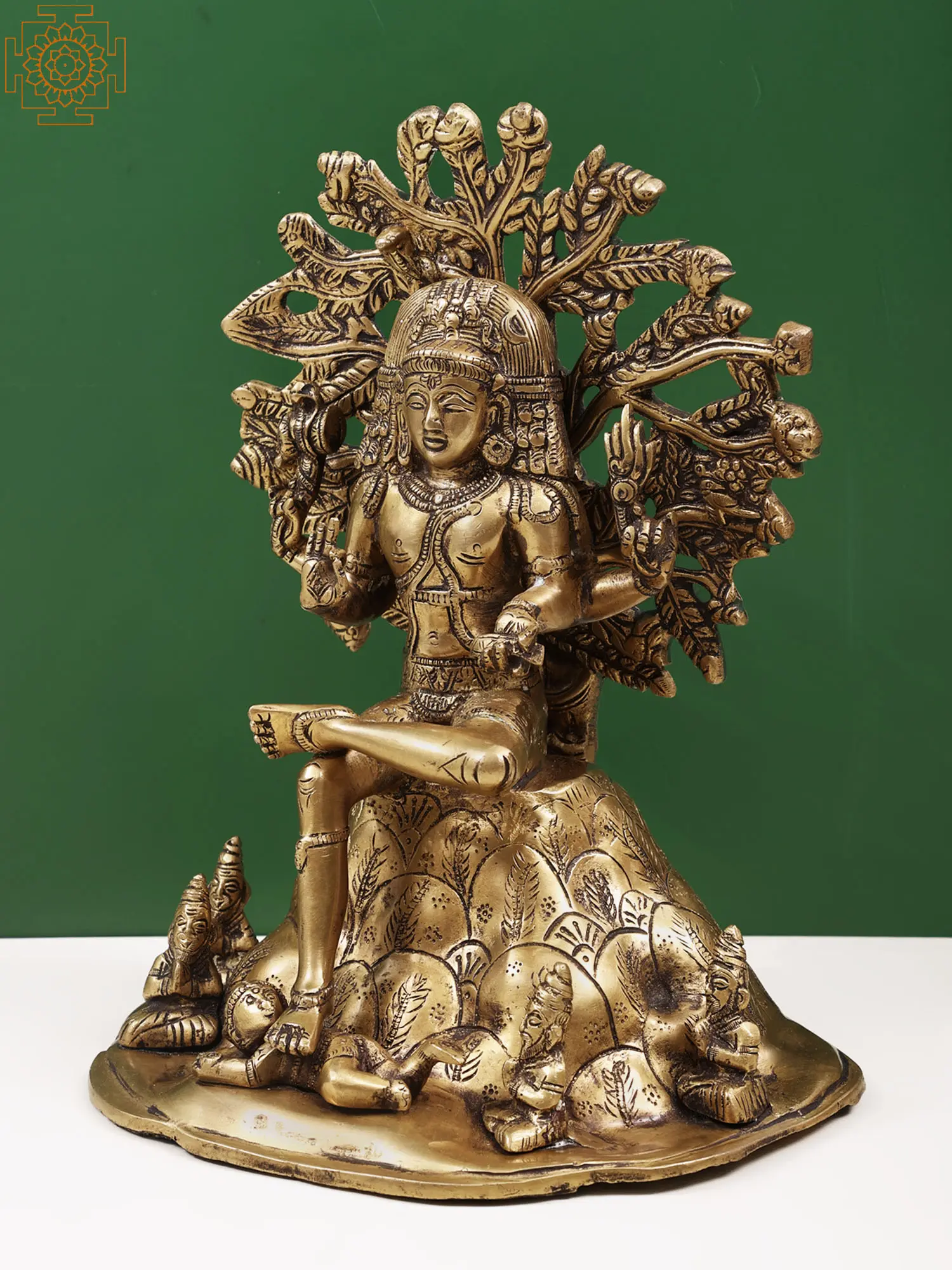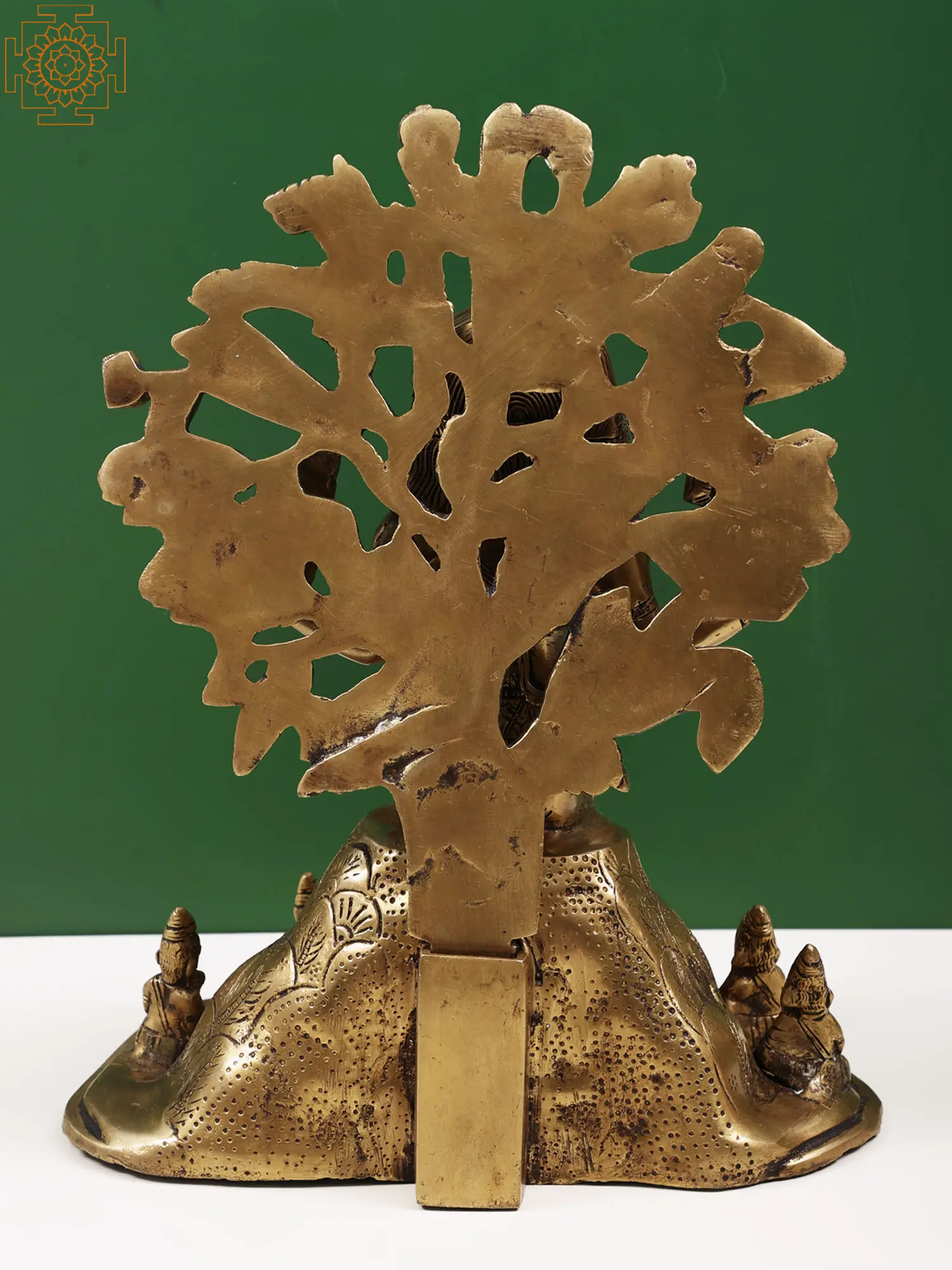 This exquisite brass statue captures the benevolent and profound form of Dakshinamurti, a depiction of Lord Shiva as the divine teacher and master of meditation and the arts. Seated majestically, Shiva, in this sacred guise, is the embodiment of wisdom, understanding, and spiritual knowledge. The posture of the statue, with one leg folded and the other resting upon the knee, signifies deep concentration and the stillness required for profound introspection. Surrounding him, small figures of disciples can be seen, eagerly absorbing the divine teachings, representing the eternal tradition of guru-shishya parampara.