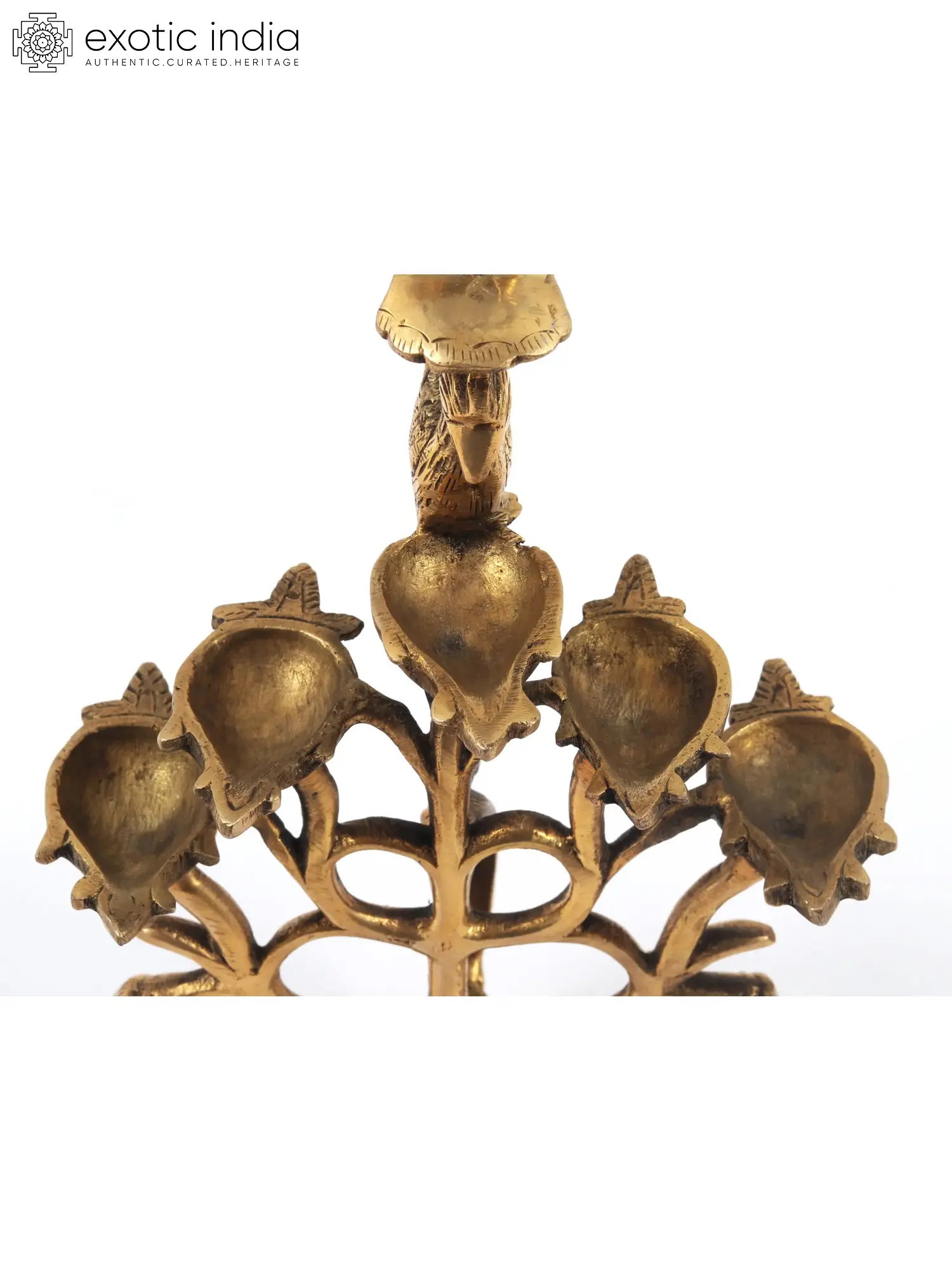 This Dancing Ganesha Hand-Held Oil Lamp emits the vivid spirit of Lord Ganesha, who is the Karta (doer) and Dharta (protector). The maker of this brass lamp has reached the peak of inventiveness by placing Lord Ganesha on a peacock tail hood. Bringing the peacock and Lord Ganesha completes the deities Mayureshwara avatar. With five wicks, technically a Panchadeepam, this lamp adopts a unique design approach, with the wicks arranged hierarchically and fashioned as half-bloomed flowers. When lighted, this lamp will resemble Lord Ganesha dancing on a pyramid of light.