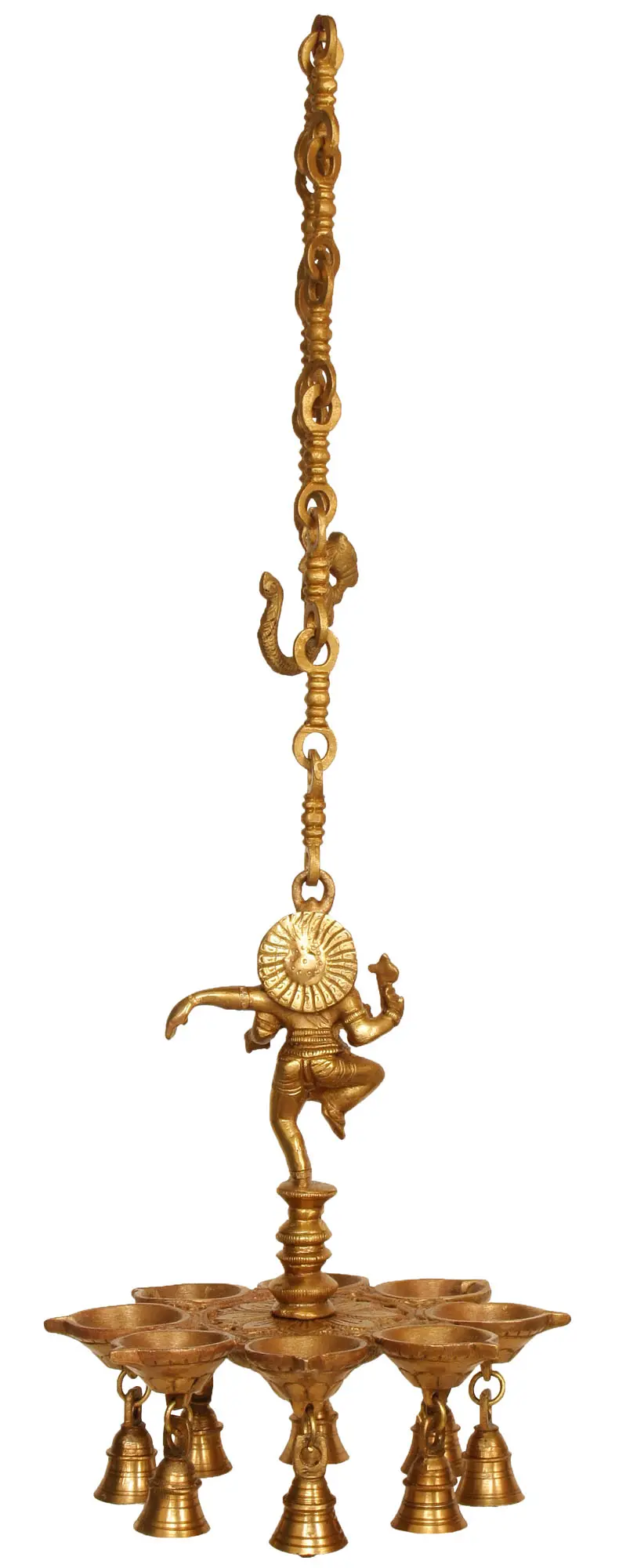 This eight-wick lamp, complete with bells and a sacred figure of Nritya Ganapati, represents everything Shubh (holy). This brass lamp in the traditional Kerala Thooku Vilakku form pays homage to Lord Ganesha's unending strength and understanding. Lord Ganesh, with his curled elephant trunk and huge girth, and a brilliance that outshines billions of suns, eliminates all obstructions to my true endeavors and blesses all living creatures through the warmth of the lamp. Because of the dancing picture of Lord Ganapati, who is also known as the patron of all arts, the lamp serves as a vehicle for lighting and praying to Lord Ganesha with all the utmost sincerity.