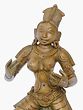 The bronze sculptural image here is akin to the aforementioned examples, with the dancer’s graceful posture hinting to the supple manner in which the Natyashastra, or the Sanskrit treatise of performing arts written by Bharata Muni, details the aesthetic ‘Rasa’ theory. The lady’s gleeful facial expression resembles the ‘Hasyam’ Rasa of laughter, mirth, and comedy. The dancer’s body – from her ears and neck to across her body and legs – is adorned with sumptuous jewellery and the sensuous presence of the woman is due to the classical ‘tribhanga’ nature of the posture – where the body bends in three directions: at the knees, the hips, and the shoulders and neck. The tribhanga posture has had its presence marked for over two thousand years, from the ‘Dancing Girl’ excavated at Mohenjo-Daro to Buddhist representations of ‘yakshinis’ and ‘bodhisattvas.’ The dancer moreover is stylised on top of a raised lotus platform.