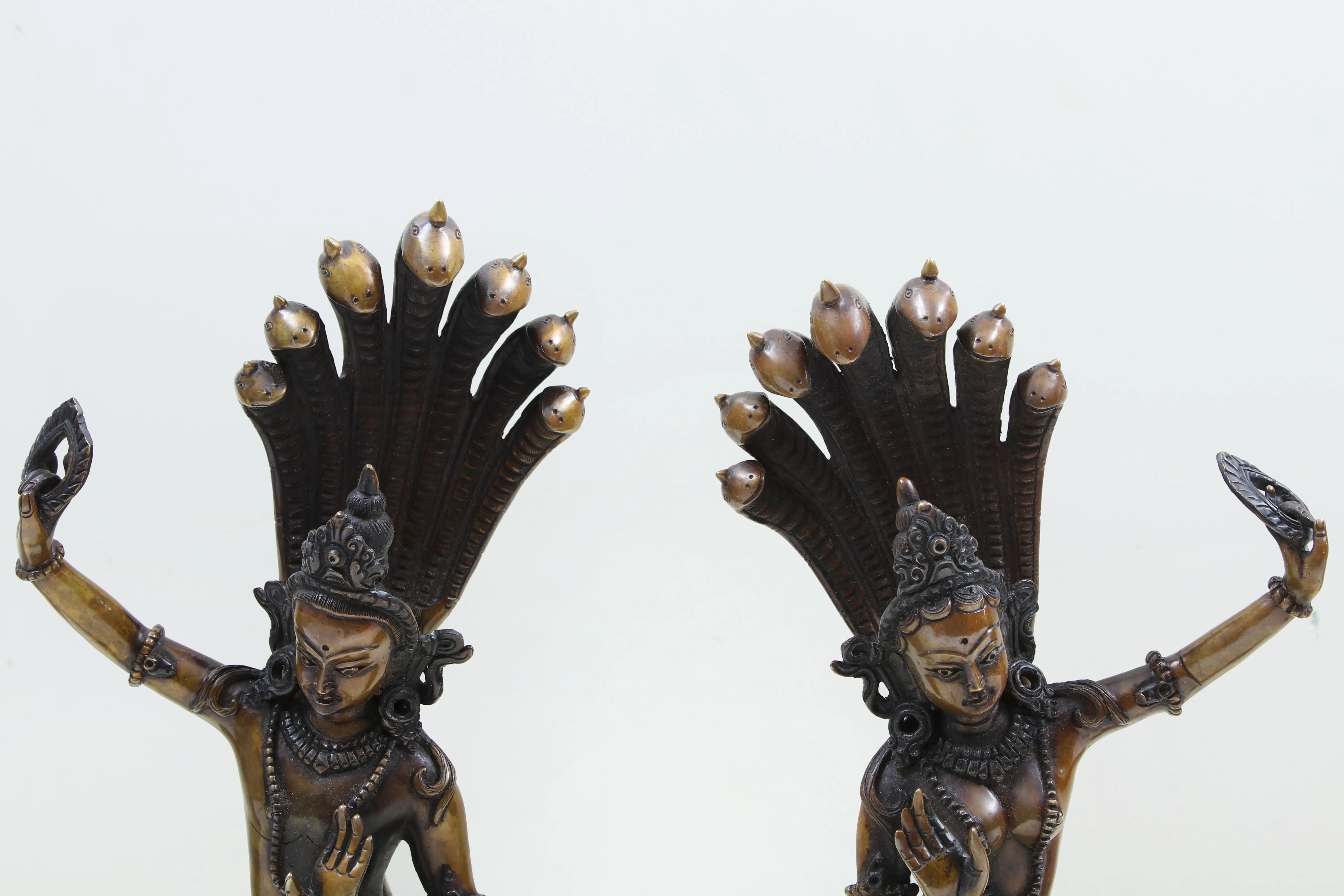 The artisans have masterfully rendered these mythical beings in a dance-like pose, their bodies coiling dynamically. The serpents' tails are intricately scaled, creating a sense of fluid movement and strength. Above their human torsos, a regal cobra hood fans out, its multiple heads uplifted in a posture of awe and power. Each head is adorned with tiny, detailed caps, evoking the imagery of protective canopies. The figures wear ornate crowns and beaded necklaces, further emphasizing their divine status. The posture, with hands raised in a gesture of blessing or offering, invites contemplation and reverence.