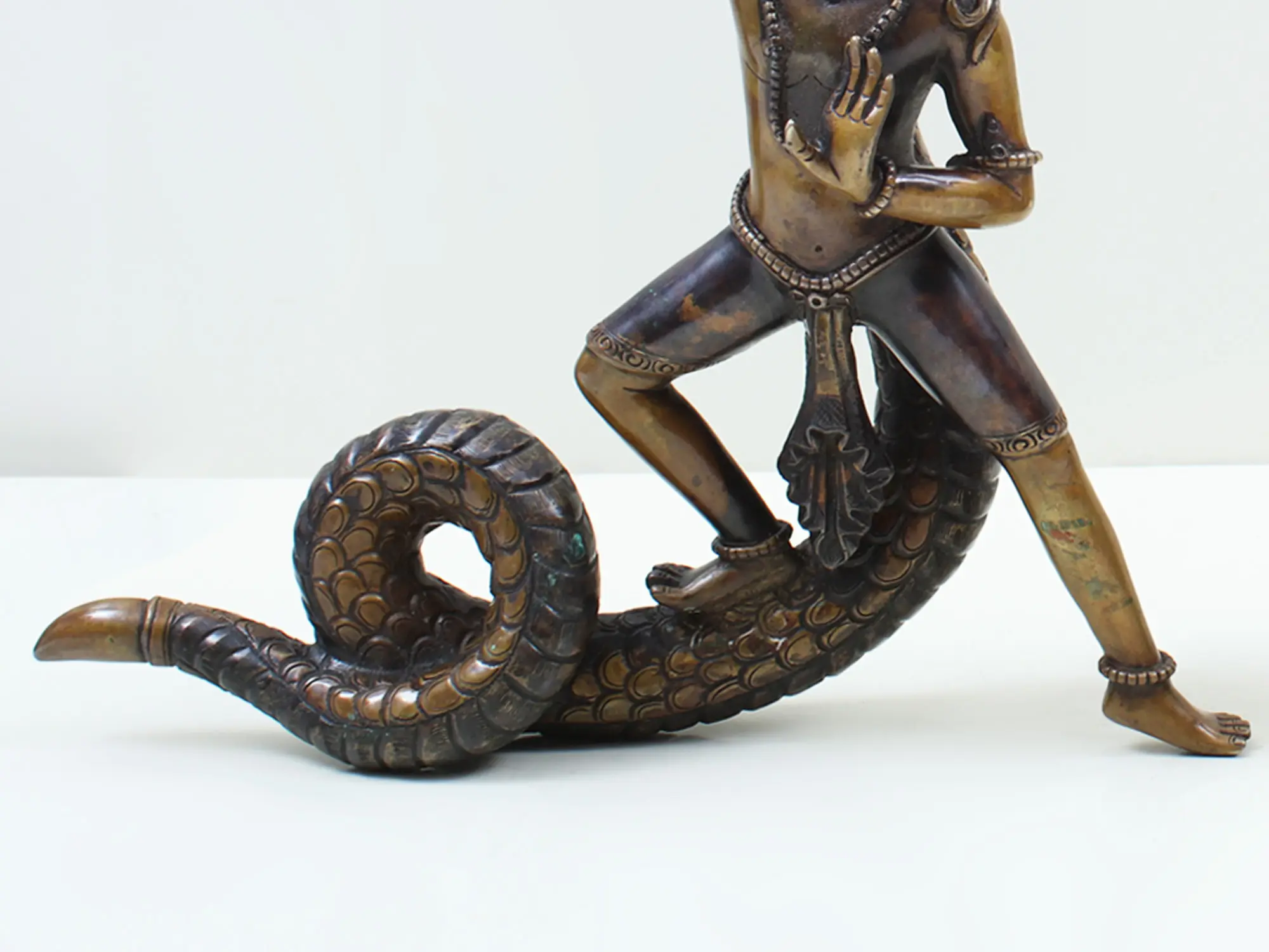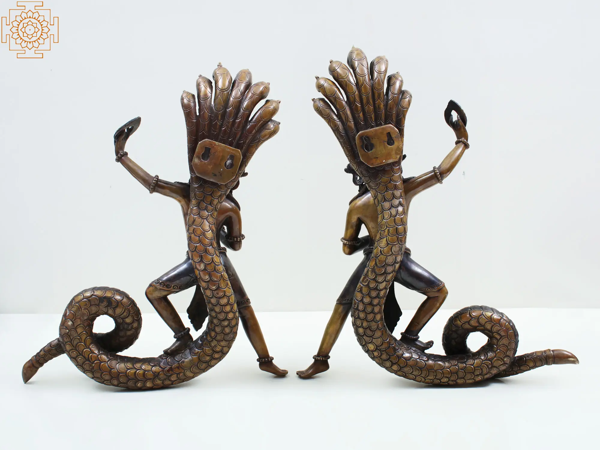 Behold a magnificent pair of copper sculptures, each depicting a dynamic Naag Nagin, a divine serpentine being from Hindu mythology. These striking figures, crafted with meticulous attention to detail, capture the essence of primal energy and spiritual grace. The Naag Nagin, often associated with water, fertility, and hidden knowledge, are powerful entities that play significant roles in ancient narratives. They are believed to be guardians of treasures, both earthly and celestial, and are often depicted as protectors of the cosmos.