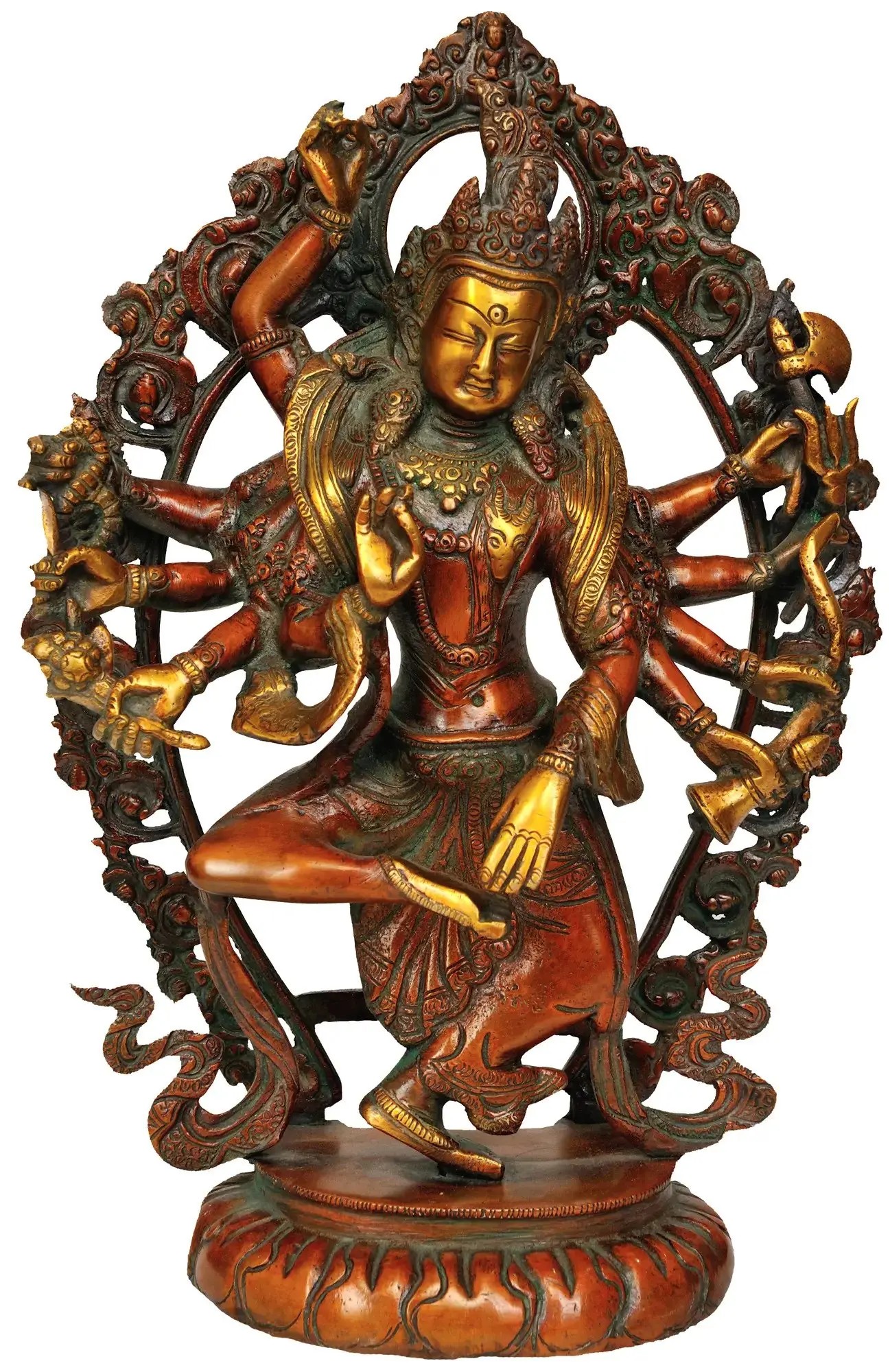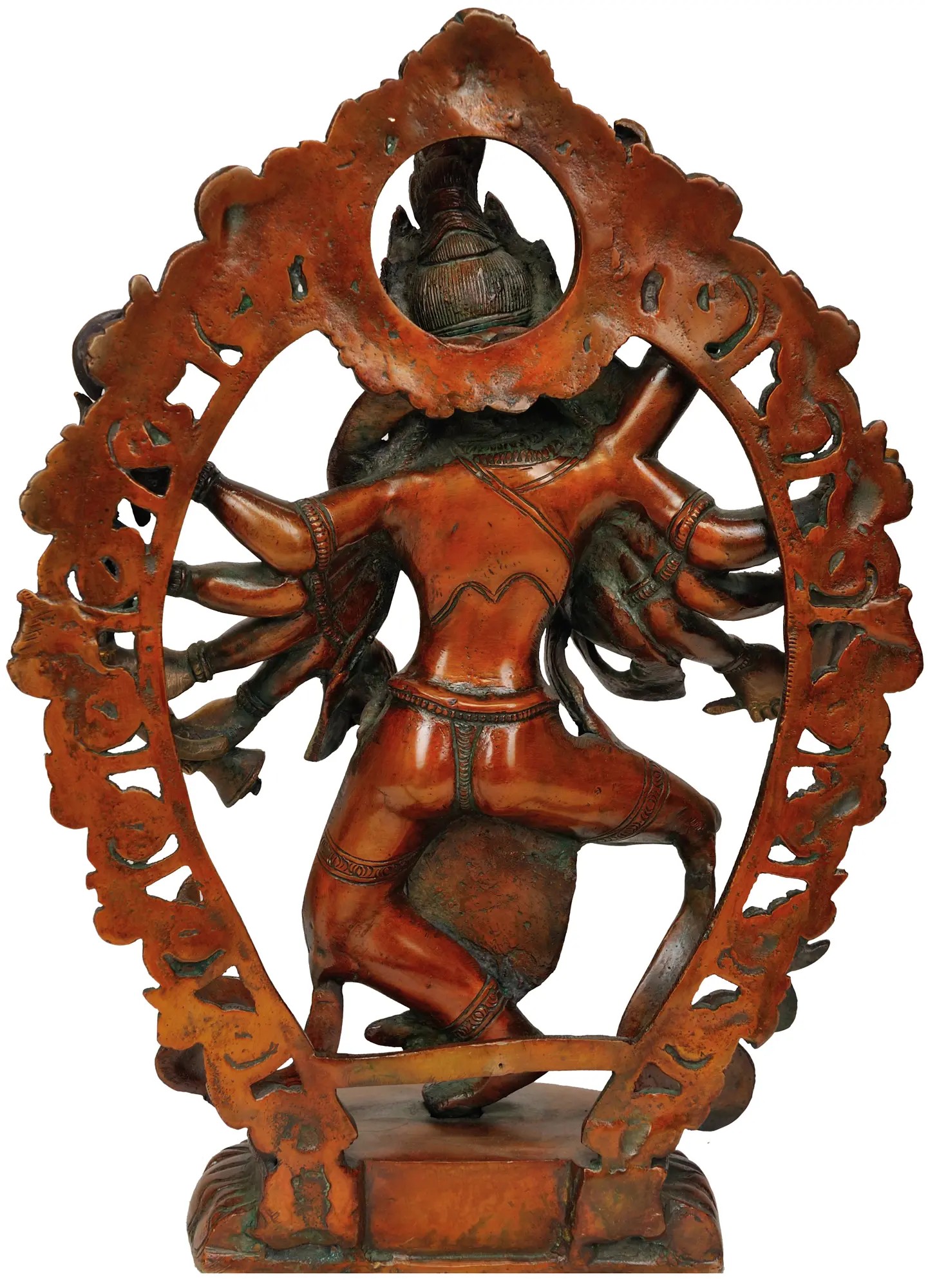 This exquisite 12.5" brass statue of Nataraja, the "King of Dance," Shiva in his cosmic dance form, is a testament to the artistry and spiritual depth of Indian craftsmanship. Handcrafted in India using traditional methods, this piece captures the dynamic energy and profound symbolism of one of Hinduism's most revered deities. The intricate details, from Shiva's multiple arms to the ornate circular frame, showcase the skill and dedication of the artisans who brought this sacred image to life. The deep green patina adds a layer of age and mystique, hinting at the passage of time and the enduring power of the divine. The statue's dimensions of 12.5 x 9.0 x 3.0 inches make it an ideal centerpiece for a meditation space, altar, or any area seeking an infusion of spiritual energy.