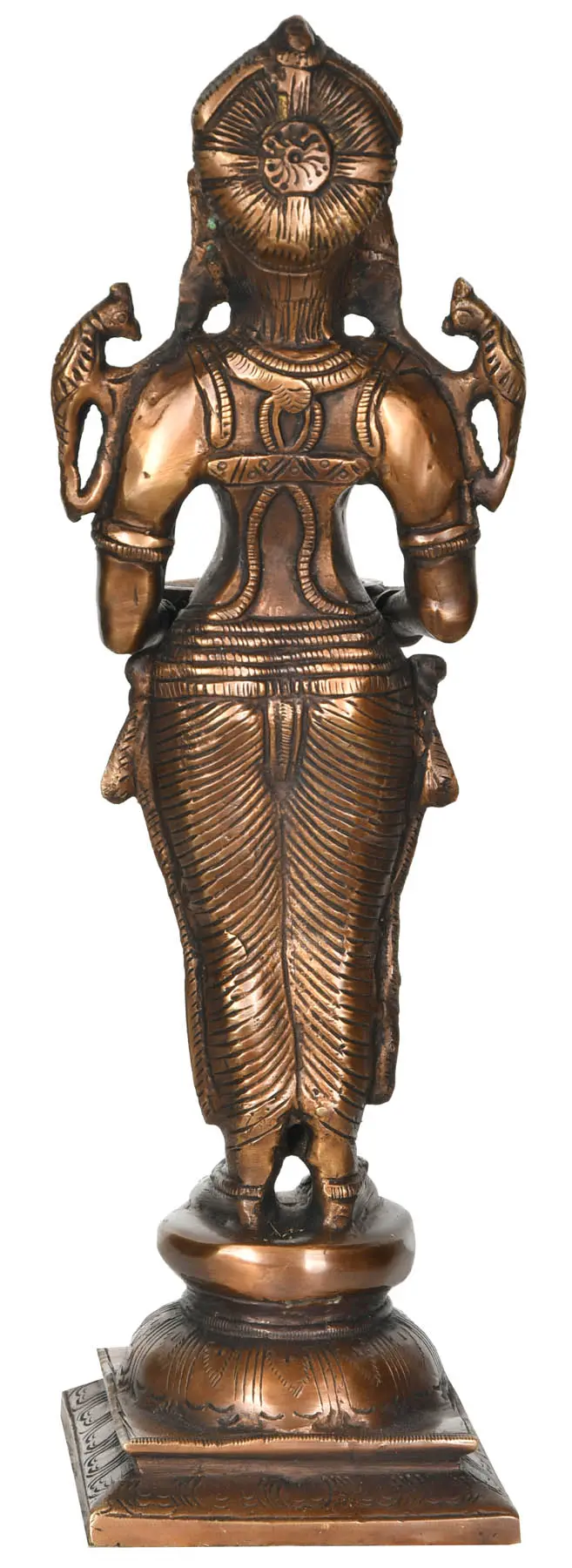 This brass Deeplakshmi represents good fortune and wealth. These Deeplakshmi are frequently placed alongside deities as a source of light and knowledge. This superb grade brass Deeplakshmi contains a leaf-shaped light adorned with royal embellishments. She is standing on a lotus pedestal with two parrots perched on her shoulders. The artisans attempted to achieve an antique finish with the dark brown lacquer.