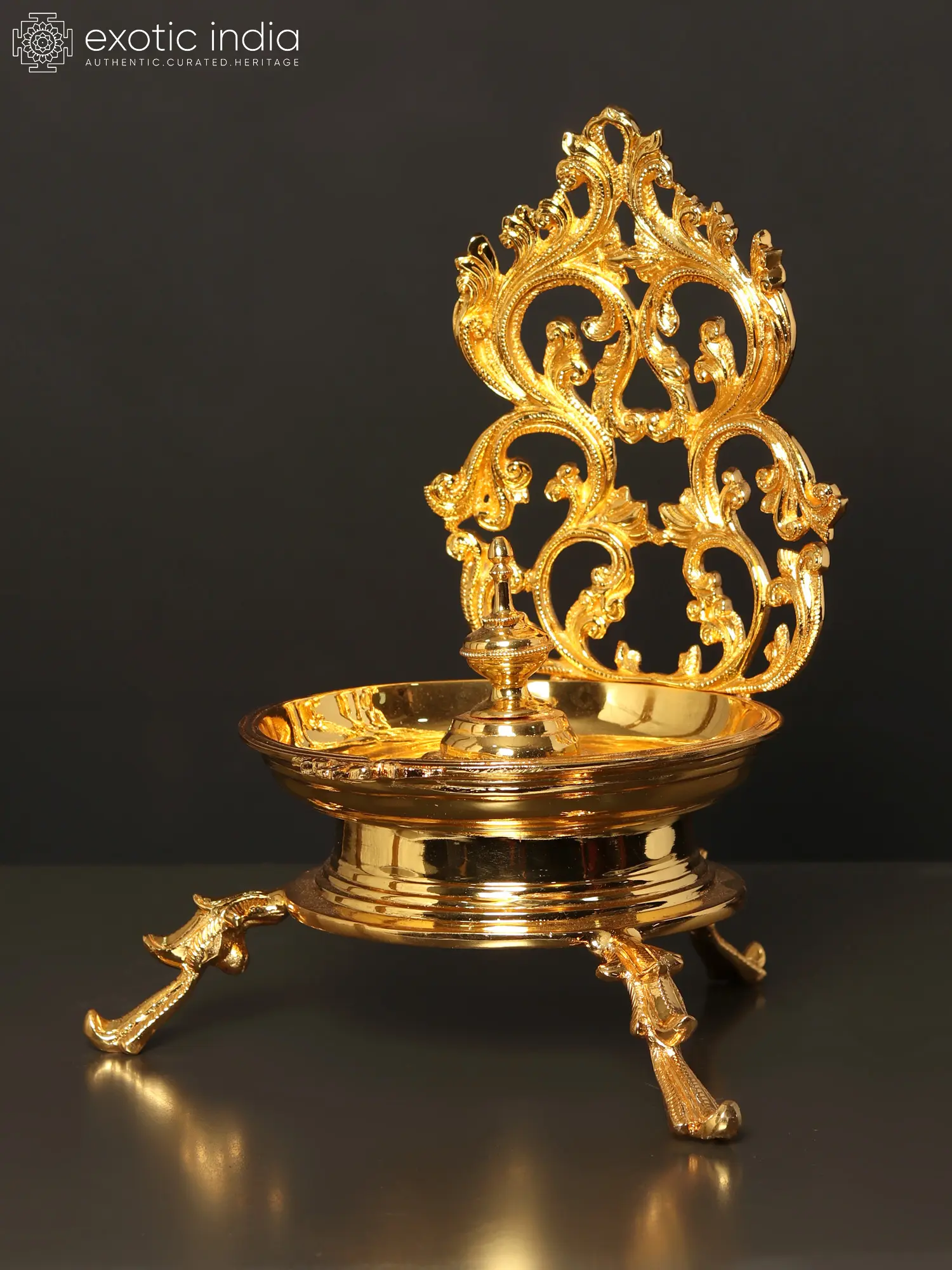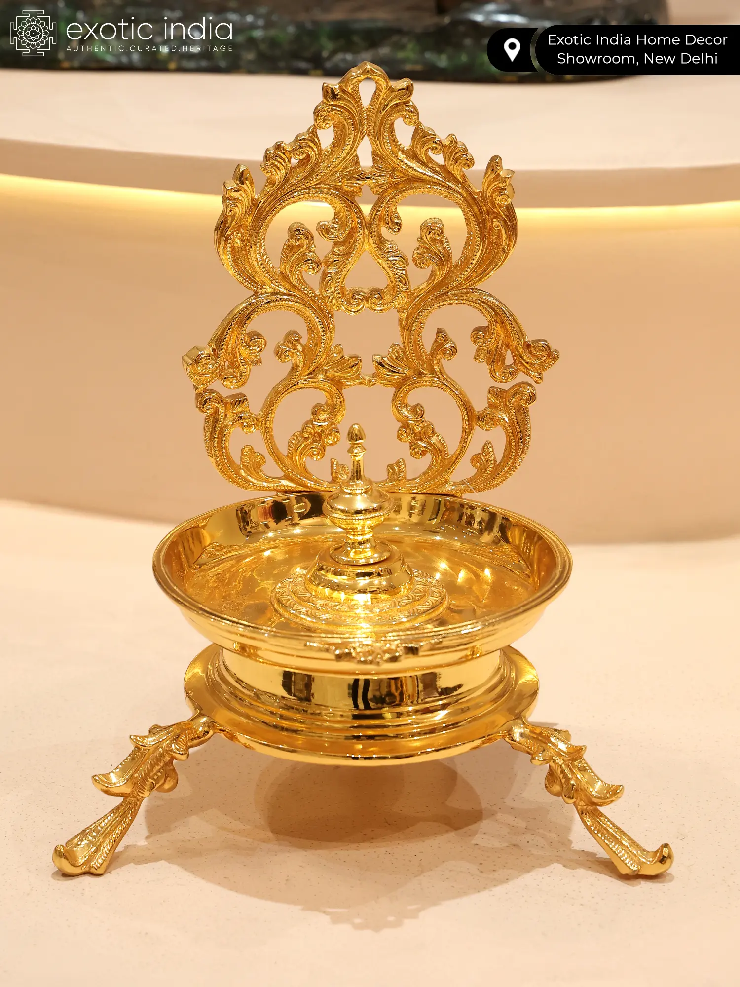 The Hoysala temples of Halebidu and Belur are a testament to the magnificent traditional craftsmanship of India. The temples are decorated with heavenly vines and floral patterns that were eventually used for decorating utility and art pieces later. This Designer Lamp with stand is made of brass and plated with 24 Karat Gold carries the immortal design of Hoysala Vine at the background or crown of the lamp.
