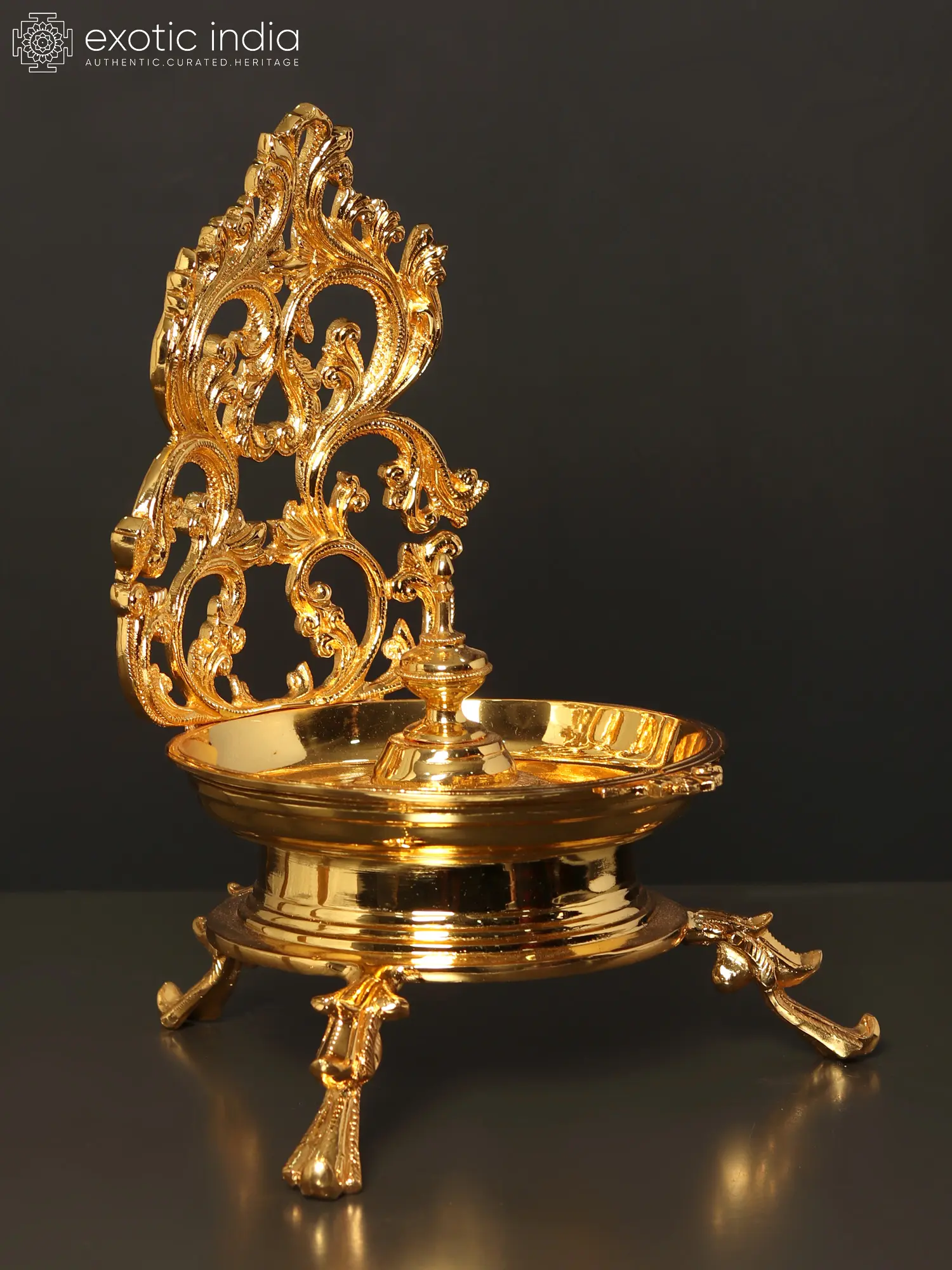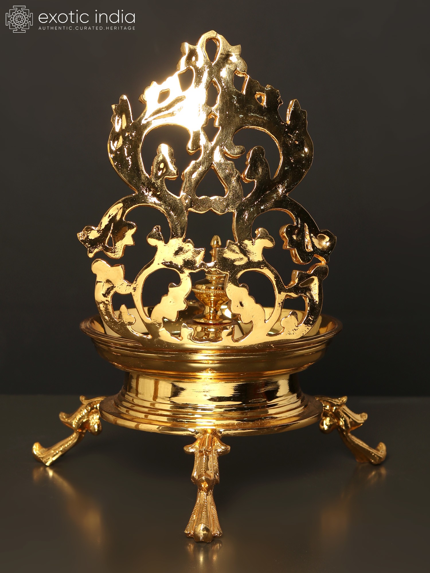 The lamp carries the typical round oil basin structure of lamps. It is further assisted with three stands to keep the lamp at elevated levels. The crown of the lamp is the highlight of this piece making this lamp look like a heavenly piece used for ornamenting the sacred abode of Gods and Goddesses.