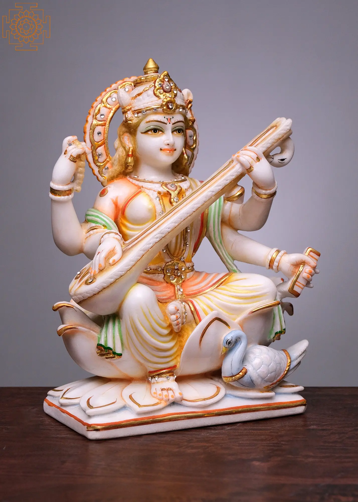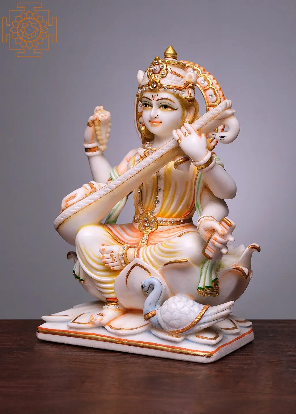 12" Devi Saraswati | Handmade | White Marble Saraswati | Goddess Saraswati Statue | Gayatri |