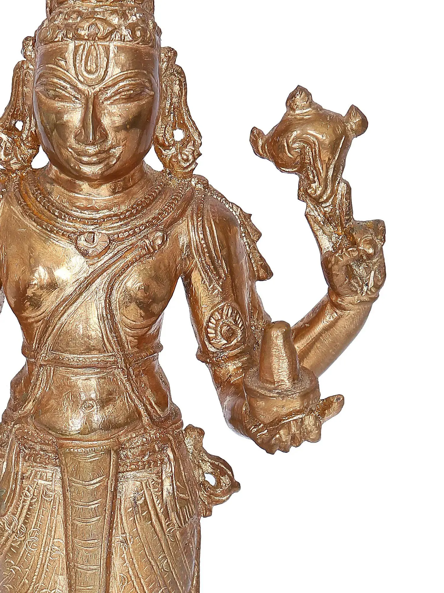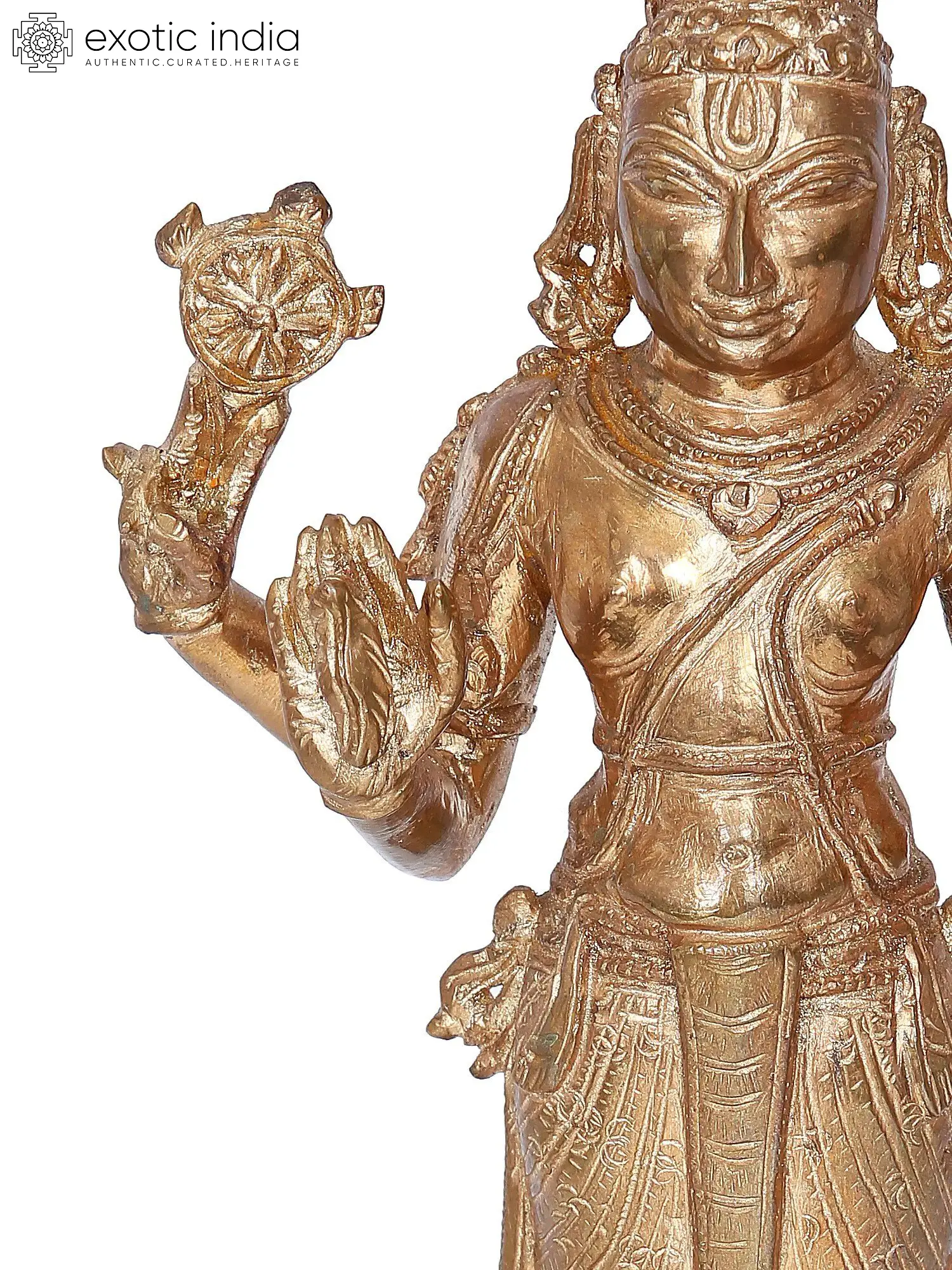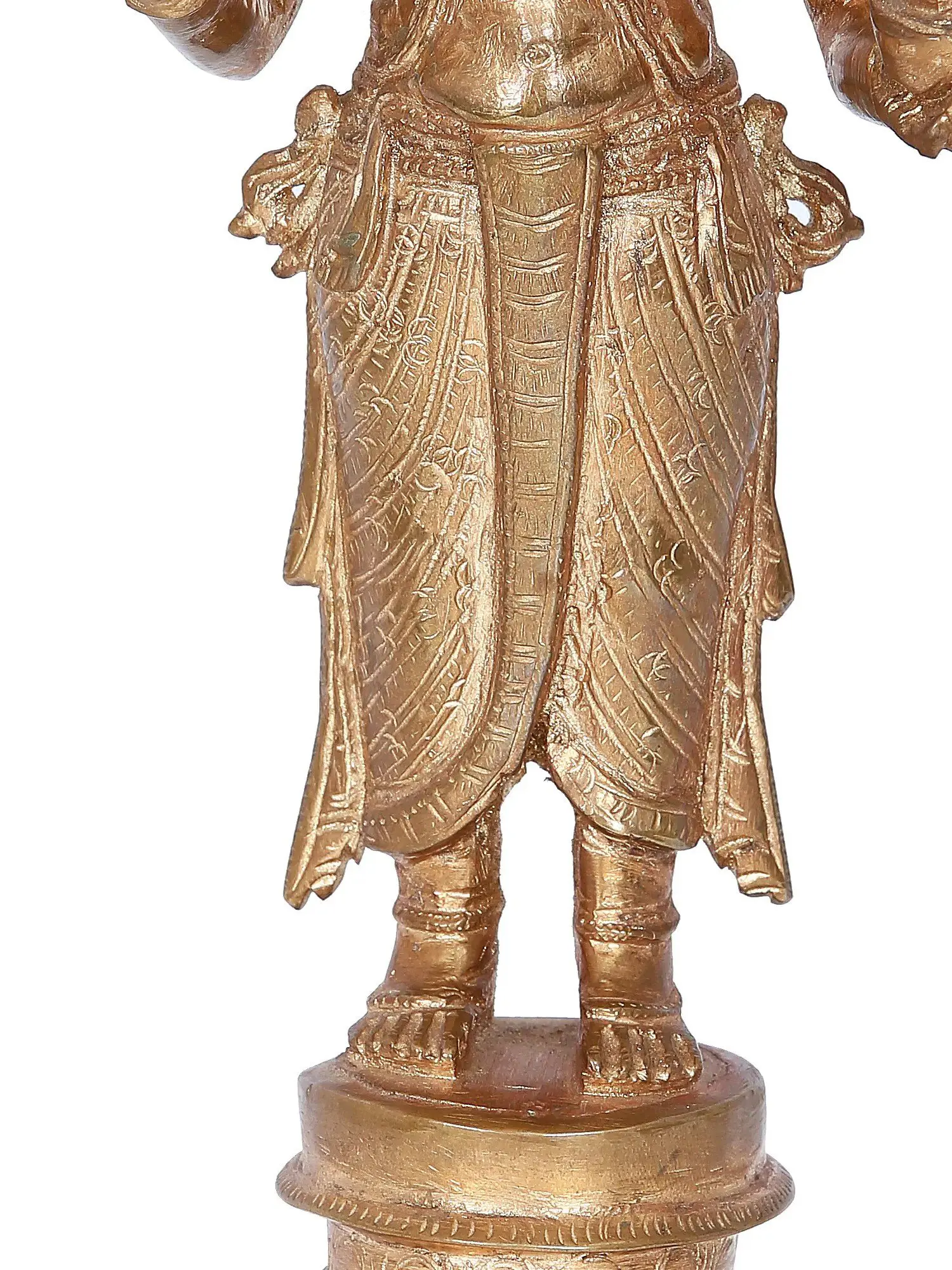 In this bronze creation, Bhagwan Dhanvantari, the divine healer, emerges as a divine manifestation of Lord Vishnu, the cosmic sustainer. Dhanvantari’s sublime form graces the lotus pedestal, an ethereal dance of health and vitality. In his four hands, Bhagwan Dhanvantari wields the Sudarshan Chakra, a symbol of knowledge’s relentless pursuit, the divine Conch (Shankha) echoing cosmic vibrations, a Leech symbolising medicinal wisdom, and a vessel of Amrita, the elixir of immortality. Cloaked in regal attire, his celestial robes whisper of transcendent status, a living manifestation of the sacred trinity—medicine, knowledge, and eternal well-being.