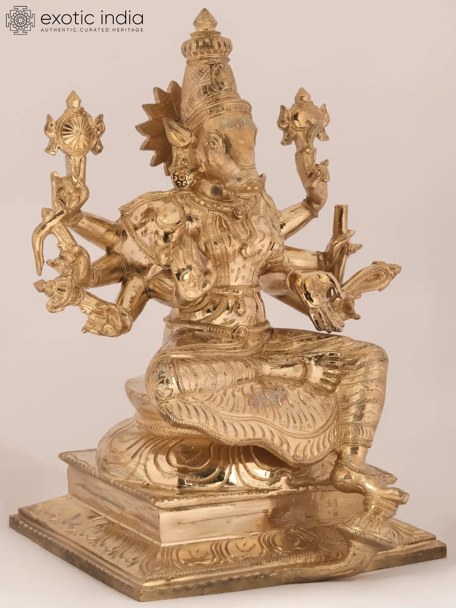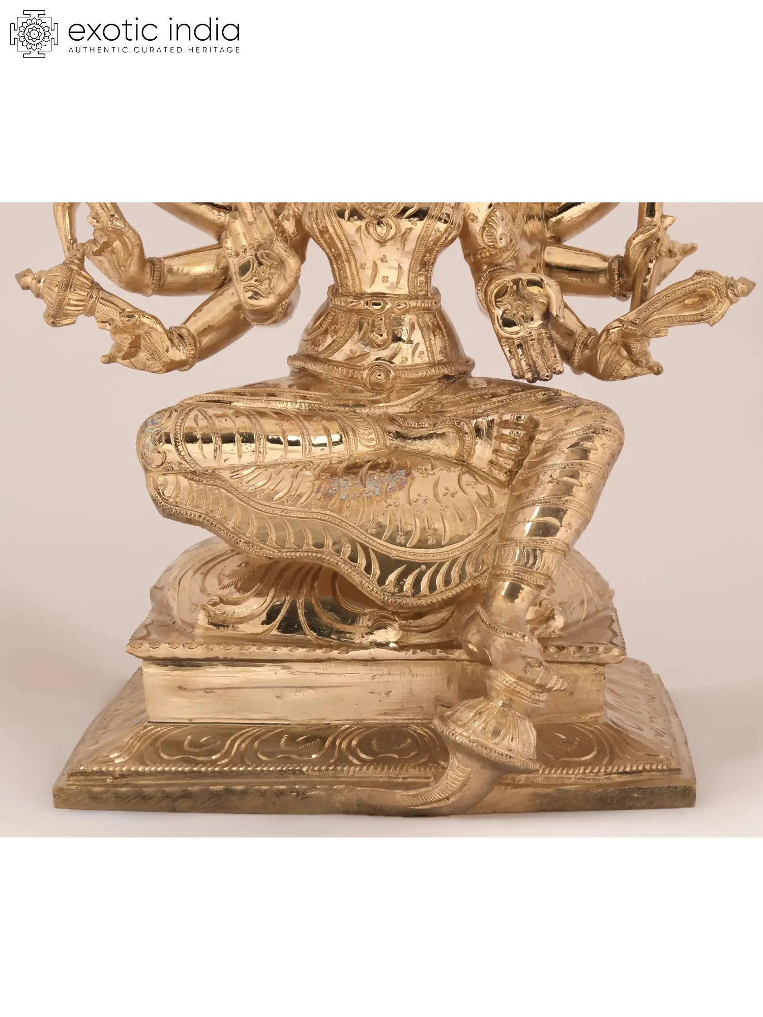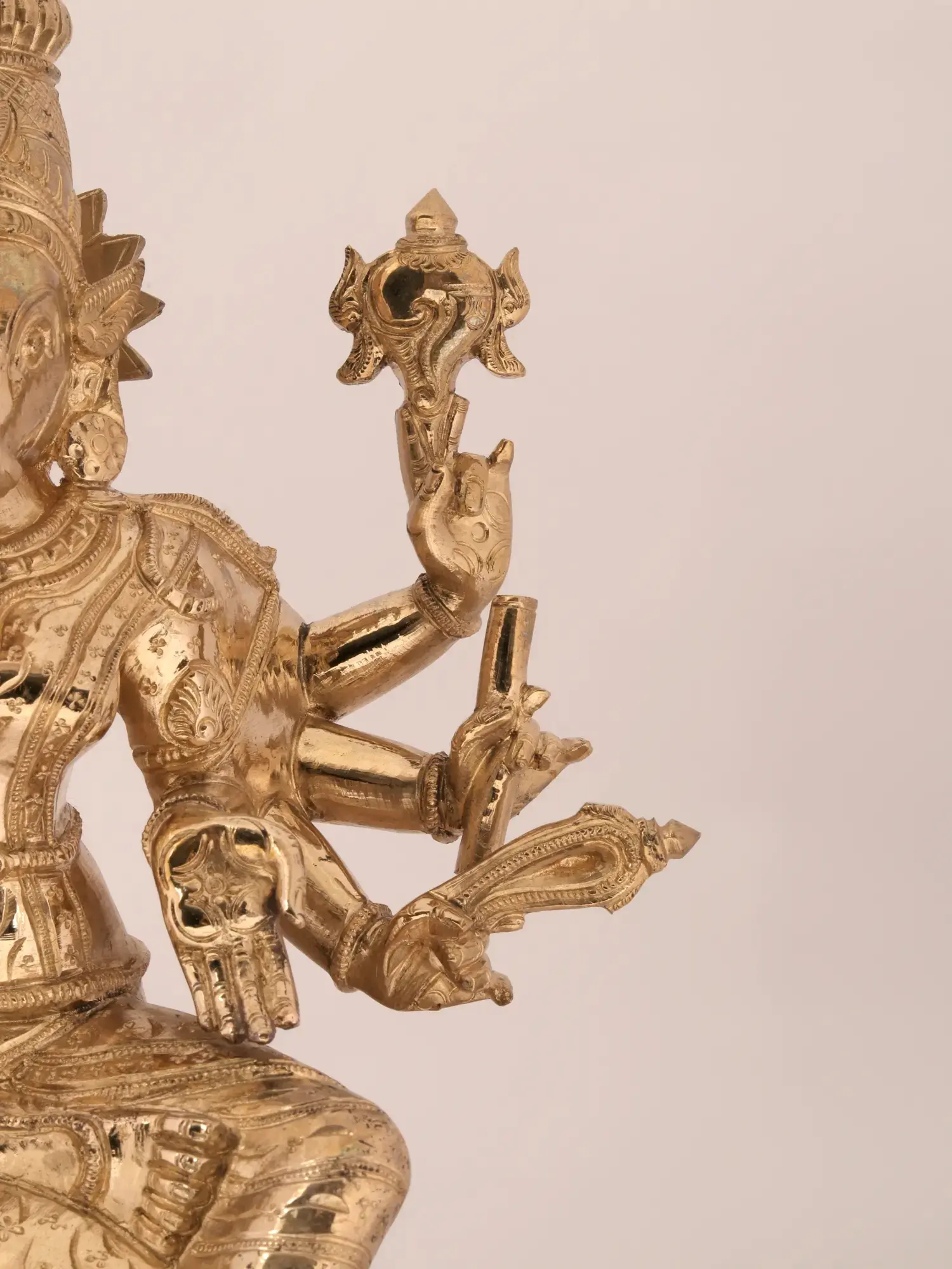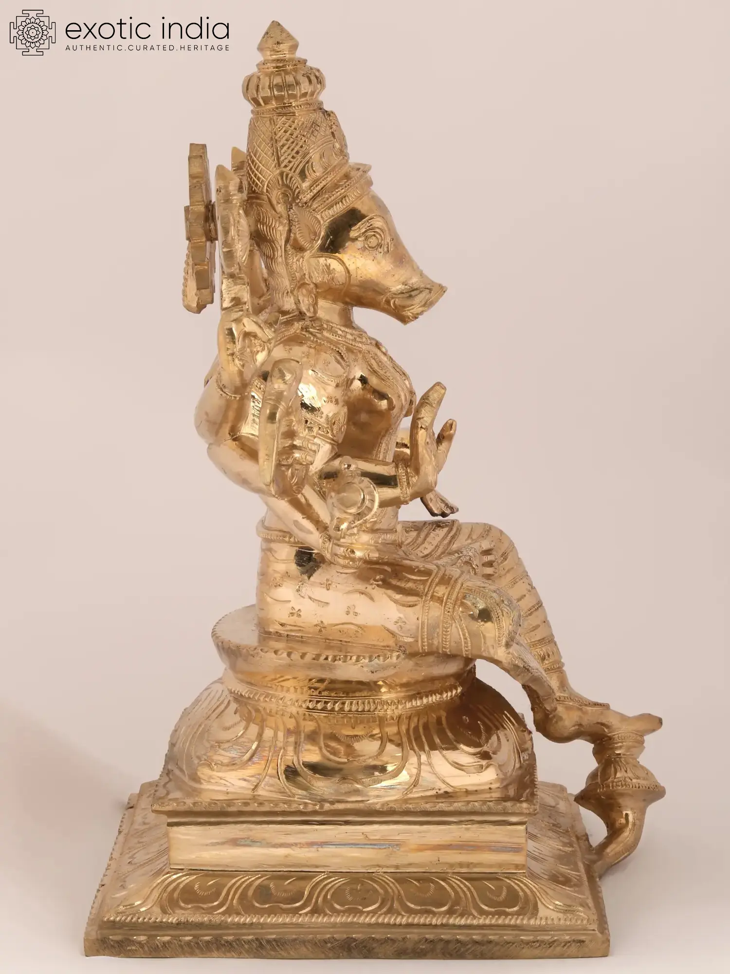 Placed in Ajna Chakra, the focal point of discernment - Varahi is the fierce boar-headed goddess, among the Sapta Matrikas as mentioned in Devi Mahatmyam. Assuming a martial form, this Shakti fought the demons Shumbh and Nishumbh and left their army quelled by her strength. This idol has a Vaishnavite interpretation of Varahi, seated half-crossed - this Ashtabhuja Varahi wears a Karanda Mukuta and is seen holding the Sudarshana Chakra, Panchajayanya, Hala, Musal, Pasa, and Ankusha. Blessing her children, she commands her protection with Abhaya and Varada mudras.