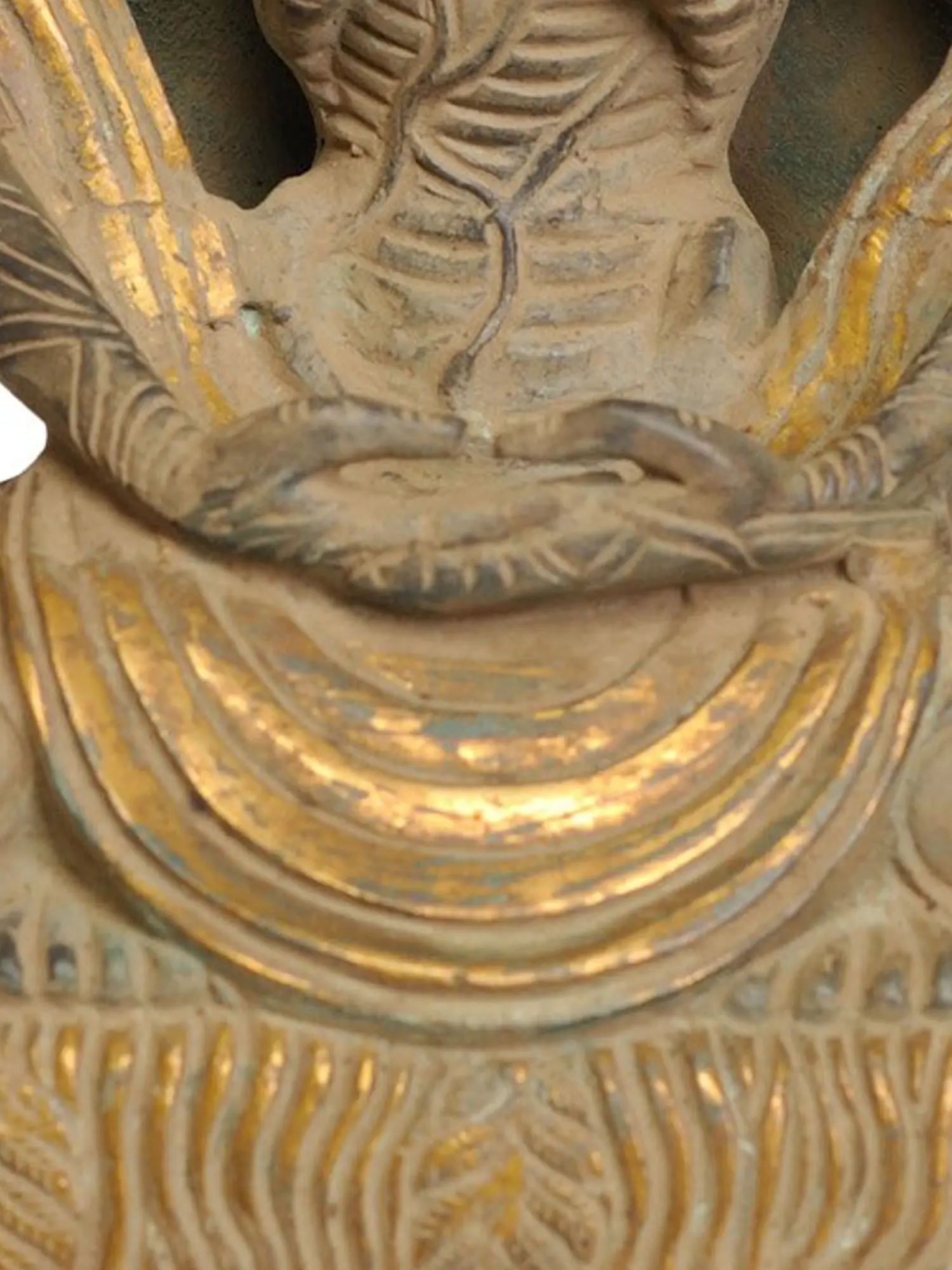 This Emaciated Buddha in a brass statue depicts Siddhartha Gautama during his ascetic phase before attaining enlightenment. The statue portrays a very thin and frail figure with prominent bones and a deeply contemplative expression. This representation symbolizes the Buddha's period of extreme self-denial and meditation in his quest for spiritual realization. The use of brass as a material adds an artistic and enduring quality to the statue. The depiction of the Emaciated Buddha in brass is a powerful and sincere representation of the Buddha's spiritual journey.