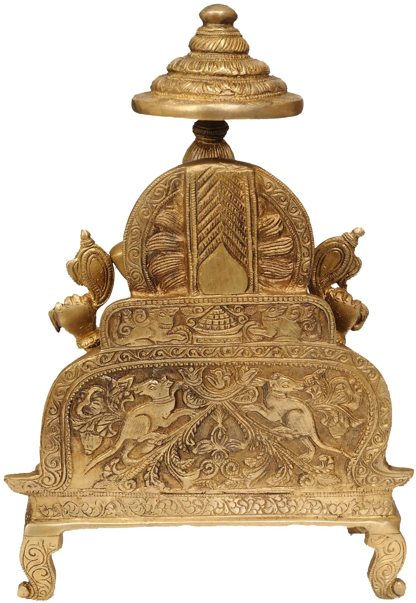 Enthroned in divine splendour, Ganesha, “the Patron of Arts and Sciences”, captivates with his “Utkutakasana pose”. Seated majestically, He exudes benevolence. In his upper hands, Ganesha wields a noose, a symbol of restraint, guiding us away from worldly attachments. The right hand, raised in “Ashirwad Mudra”, imparts blessings and protection. A serpentine (Vasuki) coils around his ample belly, symbolising control over primal desires. His attire is resplendent, bedecked in a sacred “Rudraksha” bead rosary, befitting his divine stature. A modak, the sweet nectar of wisdom, finds a place in his hand. The regal crown and a chattra atop his head proclaim his cosmic authority, uniting the spiritual and earthly realms. Carved in brass, this masterpiece embodies Ganesha’s divine presence, promising protection, wisdom, and the removal of obstacles in our earthly journey.