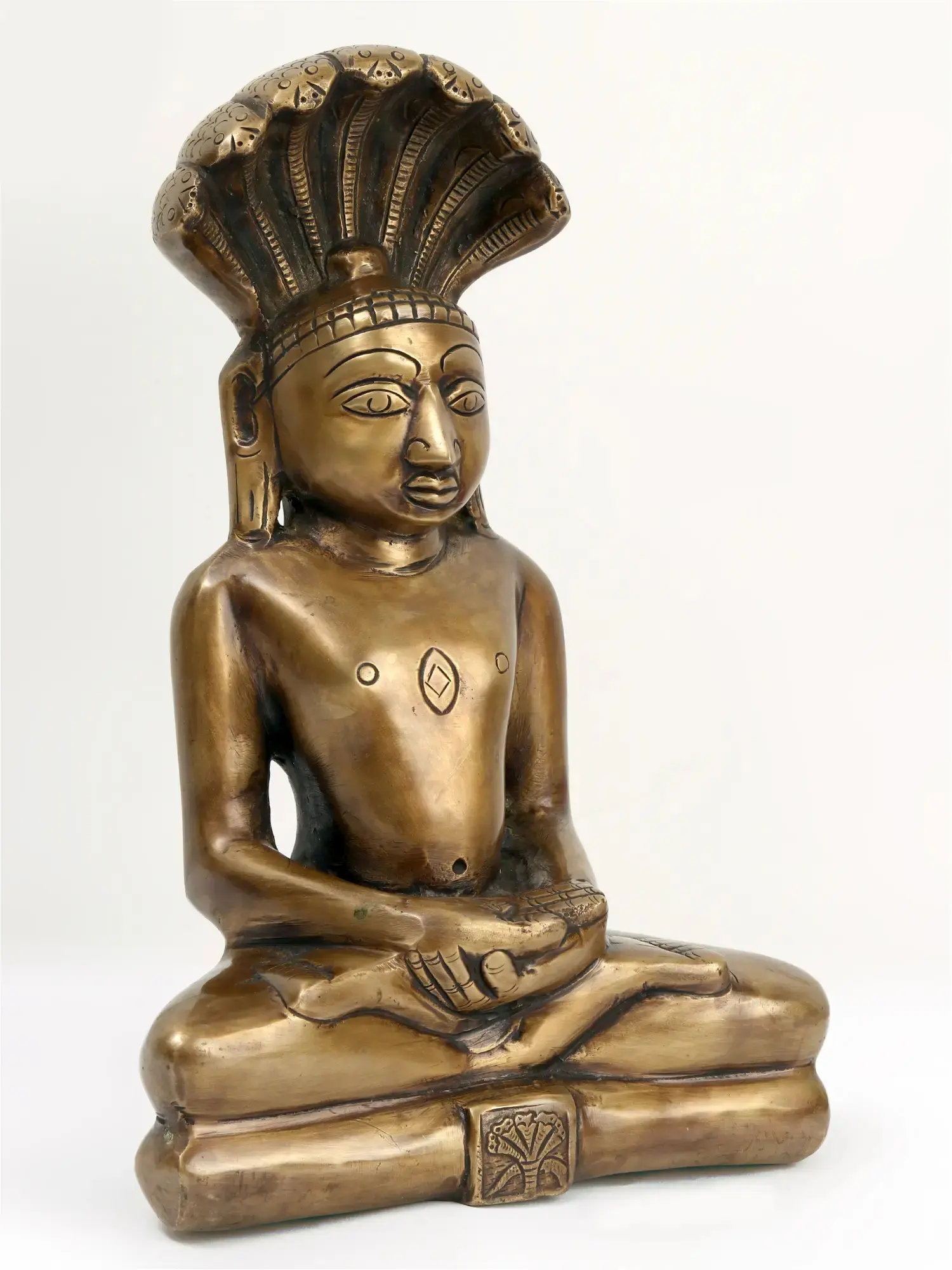 This exquisite brass statue captures the profound presence of Lord Rishabha Deva, the first Tirthankara of Jainism. Lord Rishabha Deva, meaning "Lord Bull," signifies strength, purity, and the commencement of a spiritual journey. Revered as the progenitor of Jainism, he was a prince who renounced worldly pleasures to embrace asceticism and attain enlightenment, setting the path for future Tirthankaras and followers.