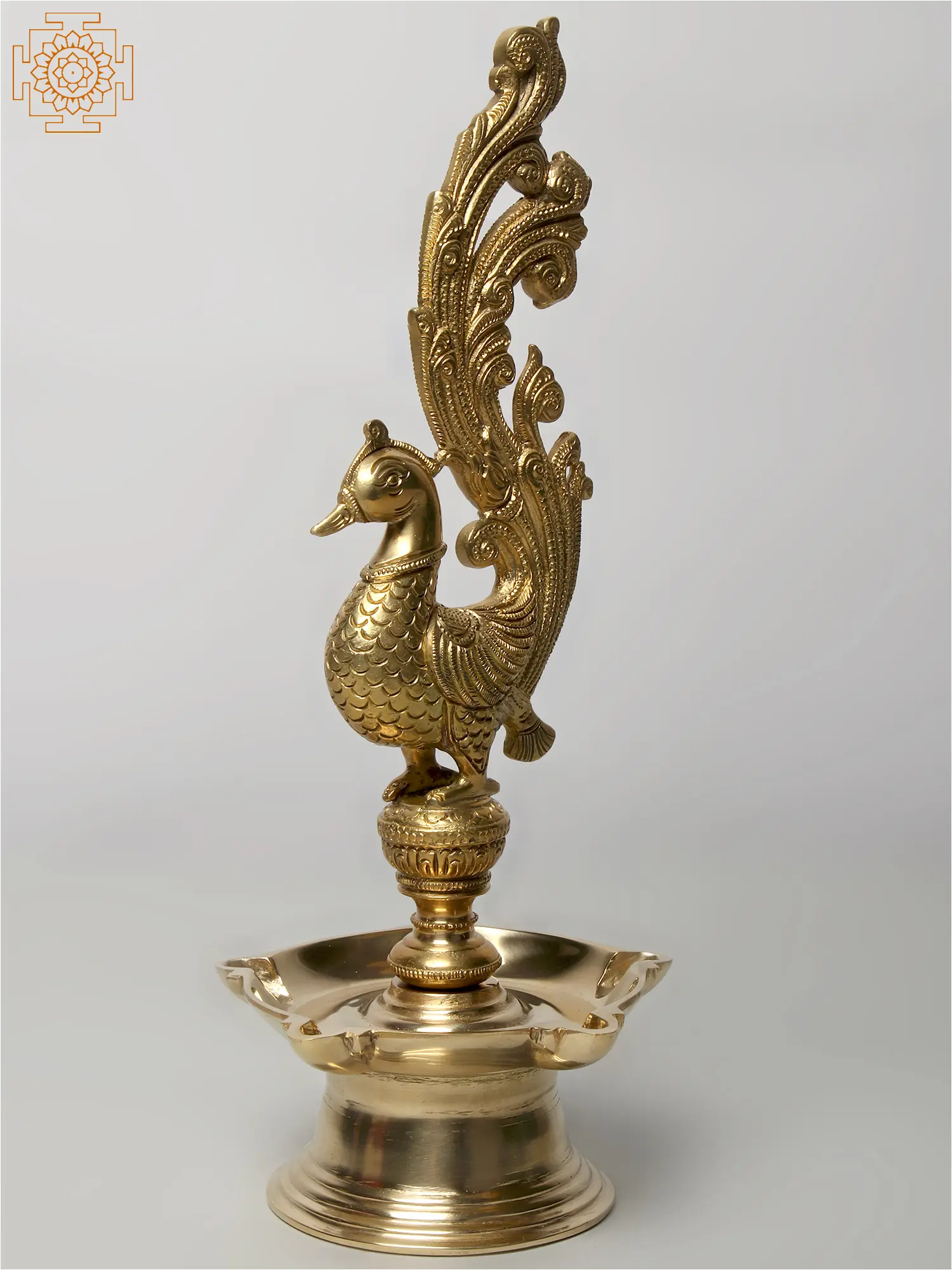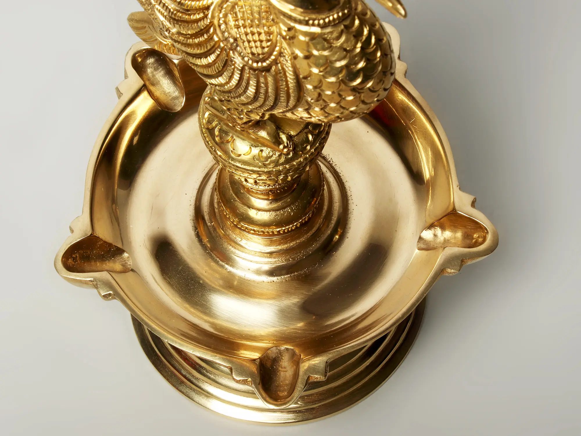 The beauty of the peacock is described in many ancient texts and has been also manifested in many art forms. This lamp rests on a strong spherical base and has a peacock pattern on top and a base of five lights. The lamp is stunning, with intricate carvings on the body and peacock feathers. The lamp's use of high-quality brass ensures that it will last for centuries. This lamp is an auspicious element that will enhance the appearance of the personal worship place.
