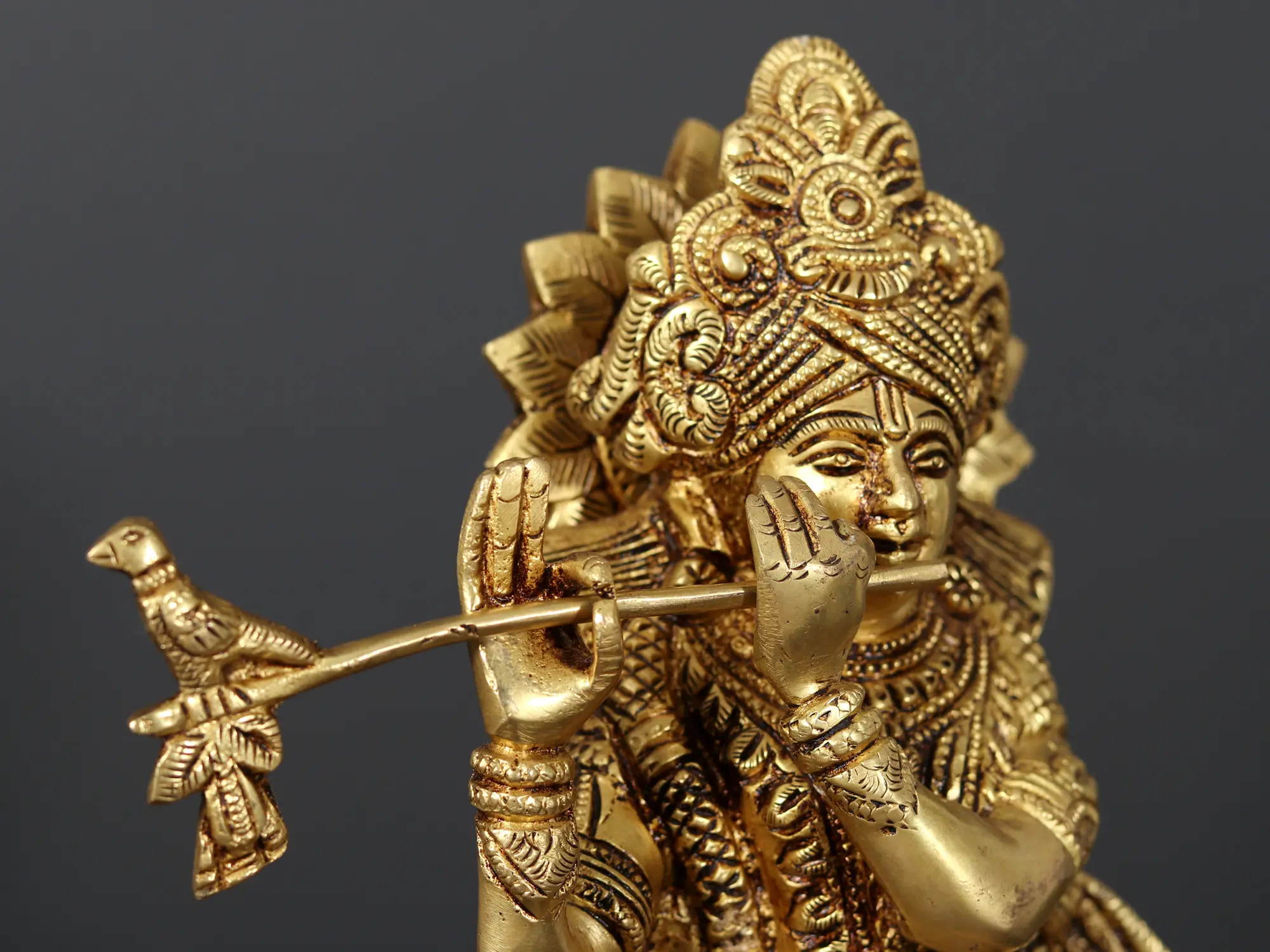 Whether placed in your puja room, meditation space, or as an elegant accent in your living area, this brass statue of Krishna playing his flute will infuse your home with an atmosphere of peace, joy, and spiritual harmony. It serves as a beautiful expression of faith and a cherished heirloom that can be passed down through generations, each piece carrying the resonance of ancient tales and the timeless beauty of divine love. Let the enchanting melody of this sacred image resonate within your soul and elevate your surroundings.