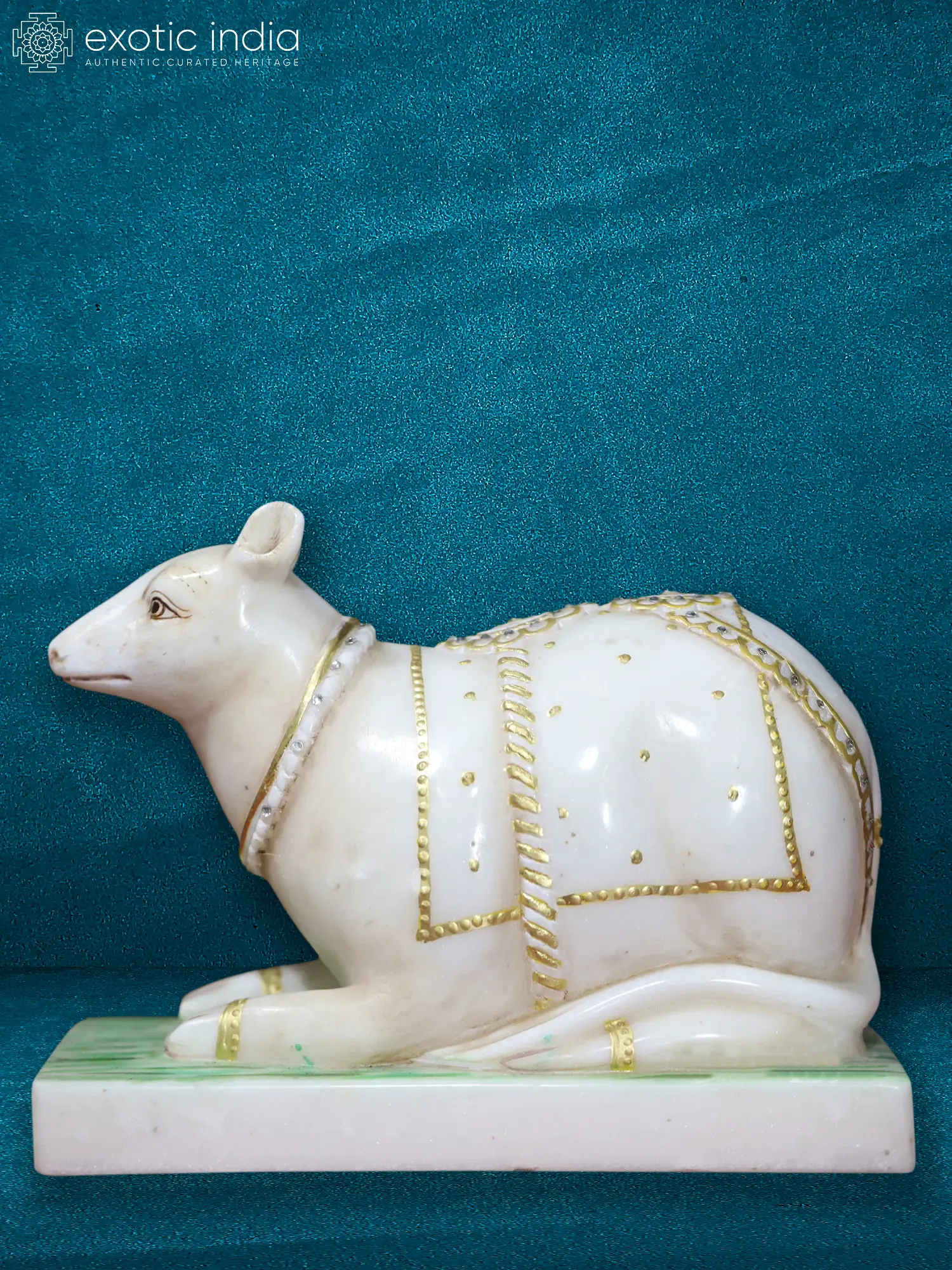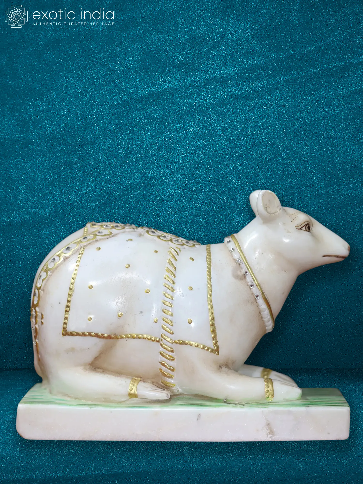 Gaze upon this exquisite statue, a masterful rendition of Mushaka, the beloved vahana (mount) of Lord Ganesha. Carved from the finest Makrana marble, renowned for its purity and luminescence, this piece embodies the grace and devotion of the divine steed. The soft, milky white of the marble, polished to a subtle sheen, lends an ethereal quality to the figure, inviting contemplation and reverence. Mushaka, often depicted as a mouse or rat, holds a significant place in Hindu mythology. Tales abound of how Mushaka, originally a mighty demon or a wise sage cursed into rodent form, became Ganesha's devoted follower. It is said that Mushaka once grew arrogant, challenging Ganesha in a playful but ultimately futile attempt to assert dominance. Defeated, Mushaka offered himself as Ganesha's vehicle, a testament to his humility and unwavering loyalty. As Ganesha's mount, Mushaka symbolizes the overcoming of ego, the mastery of desires, and the importance of humility in the pursuit of spiritual growth. He is the one who carries the Remover of Obstacles, enabling Ganesha to navigate the world and fulfill his cosmic duties. This statue captures the serene and alert posture of Mushaka, poised as if ready to embark on a sacred journey. The delicate detailing of its ears, eyes, and paws speaks to the artisan's skill and deep understanding of the subject matter. The subtle hints of color, particularly around the eyes and the delicate golden band adorning its neck, add a touch of regal elegance to the creature. The base, rendered to suggest a verdant patch of grass, grounds the figure in a naturalistic setting, while also symbolizing the fertile ground of devotion upon which Mushaka serves. The choice of Makrana marble is itself a nod to tradition and quality. Quarried from Makrana in Rajasthan, India, this marble has been the material of choice for iconic structures and sculptures for centuries, including the magnificent Taj Mahal. Its inherent beauty and durability make it an ideal medium for capturing the essence of sacred imagery. Owning this statue is not merely acquiring a decorative piece, but inviting a powerful symbol of loyalty, humility, and divine companionship into your home. It serves as a constant reminder that even the smallest among us, when aligned with purpose and devotion, can achieve the greatest feats and be instrumental in the journey of the divine. This representation of Mushaka is a testament to the artistry that transforms raw stone into a conduit of spiritual meaning and aesthetic delight.
