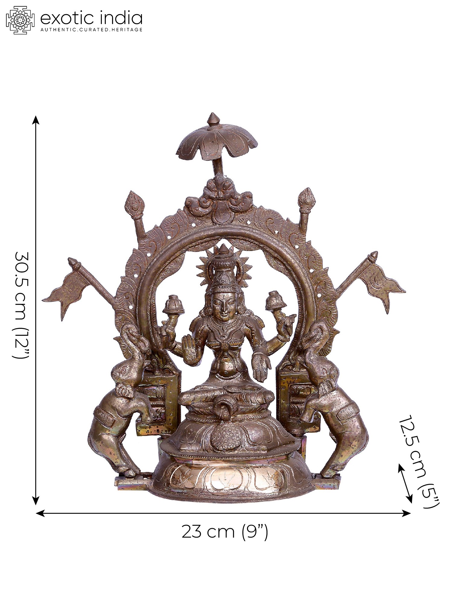 The glories of Goddess Lakshmi in Hindu culture are unending. Her powers sustain the universe, her blessings allow humans to fulfill their Dharma and Karma and her benevolence can transform anyone into Indra. This exquisite bronze statue presents the prowess of goddess Lakshmi, by combining the iconography of her form as Gajalakshmi (revered by Gaja or elephants), Dhana-Lakshmi (showering wealth), and Vijaya Lakshmi (represented with the flags of victory).