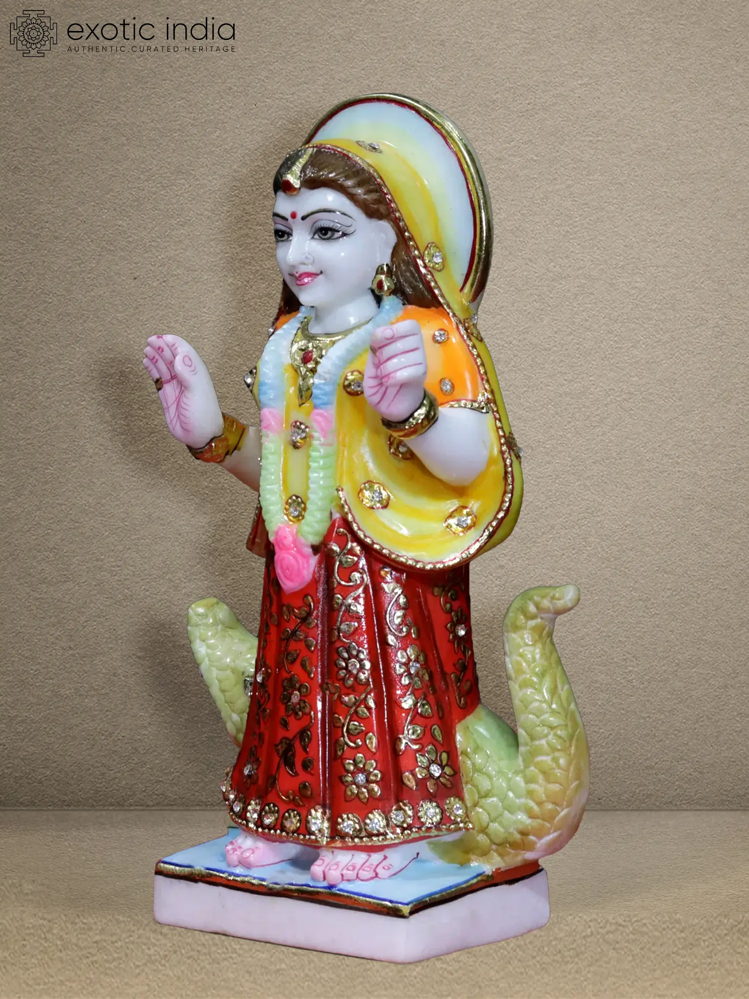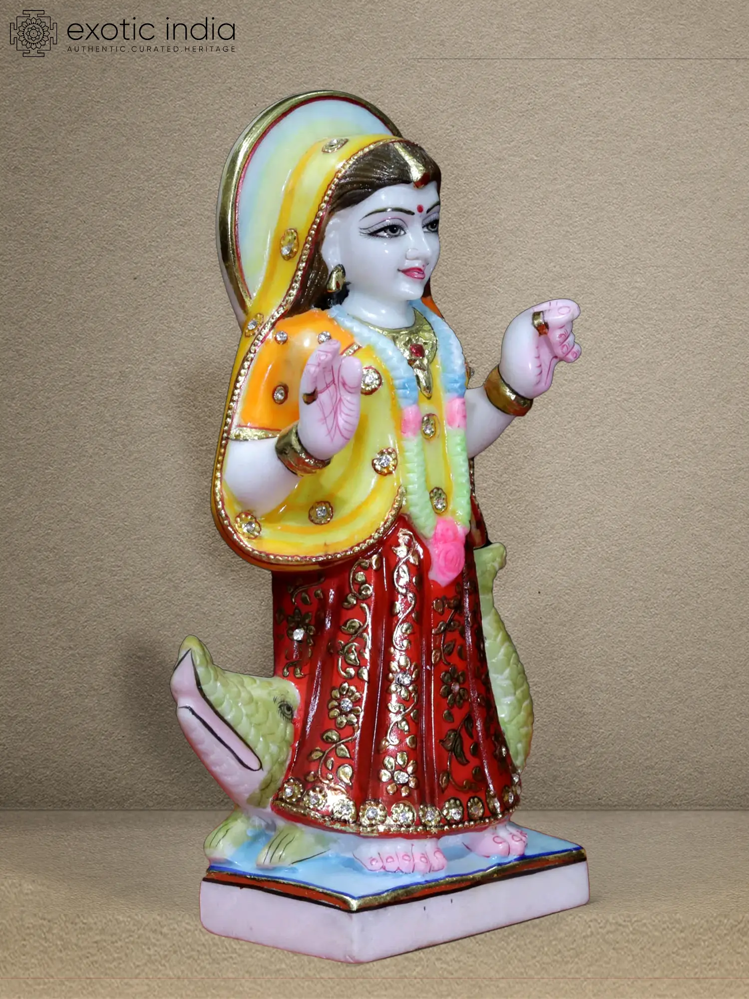 15" Khodiyar Mata With Angry Crocodile | White Makrana Marble Statue