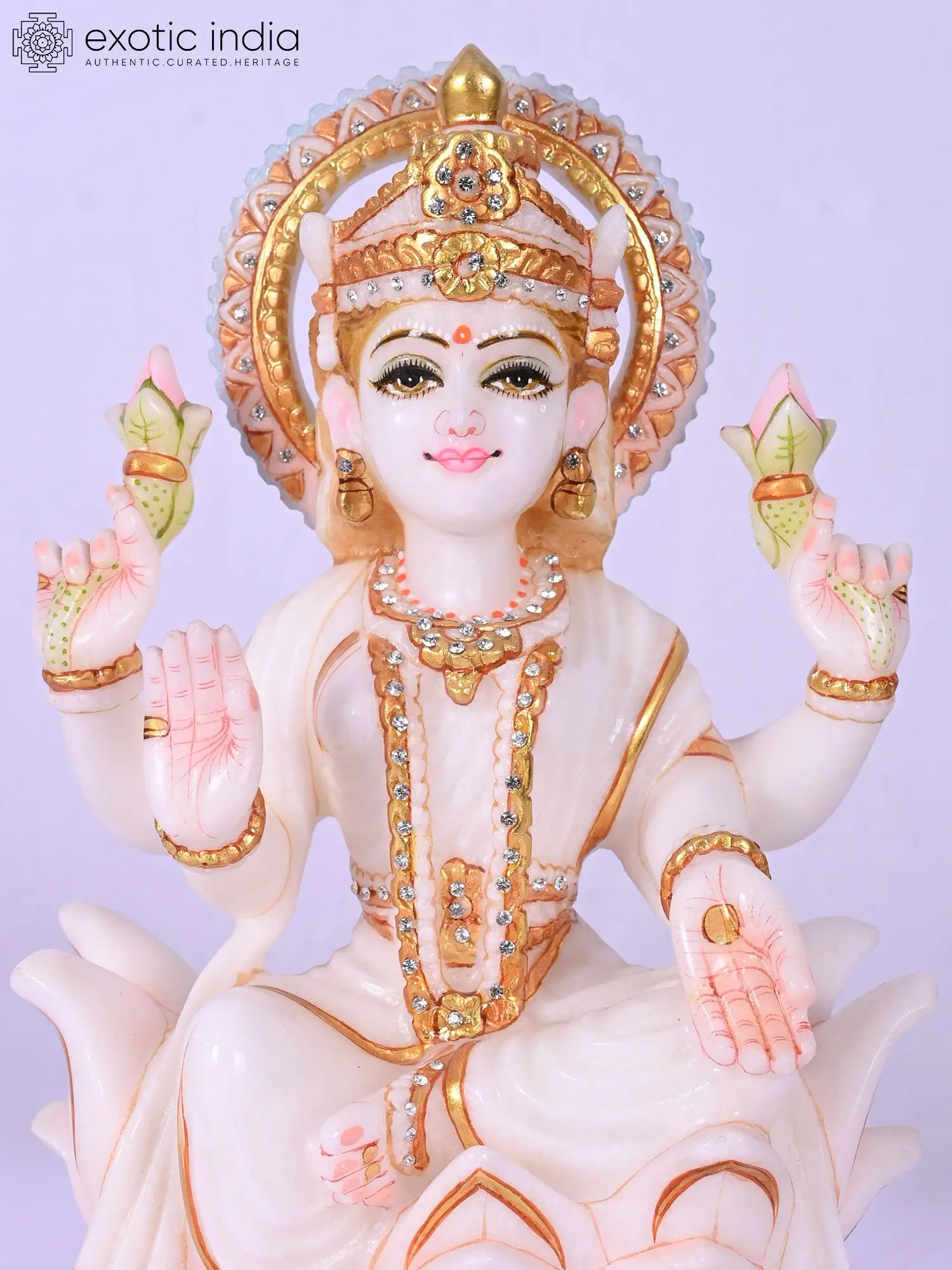 Carved from the finest marble, this sculpture is a testament to centuries-old artistic traditions and meticulous craftsmanship. Each detail, from the delicate folds of the garments to the gentle curve of the lotus seat, is rendered with profound skill. The artisans have painstakingly brought forth the inherent beauty of the stone, imbuing it with a lifelike presence that captivates the eye.
