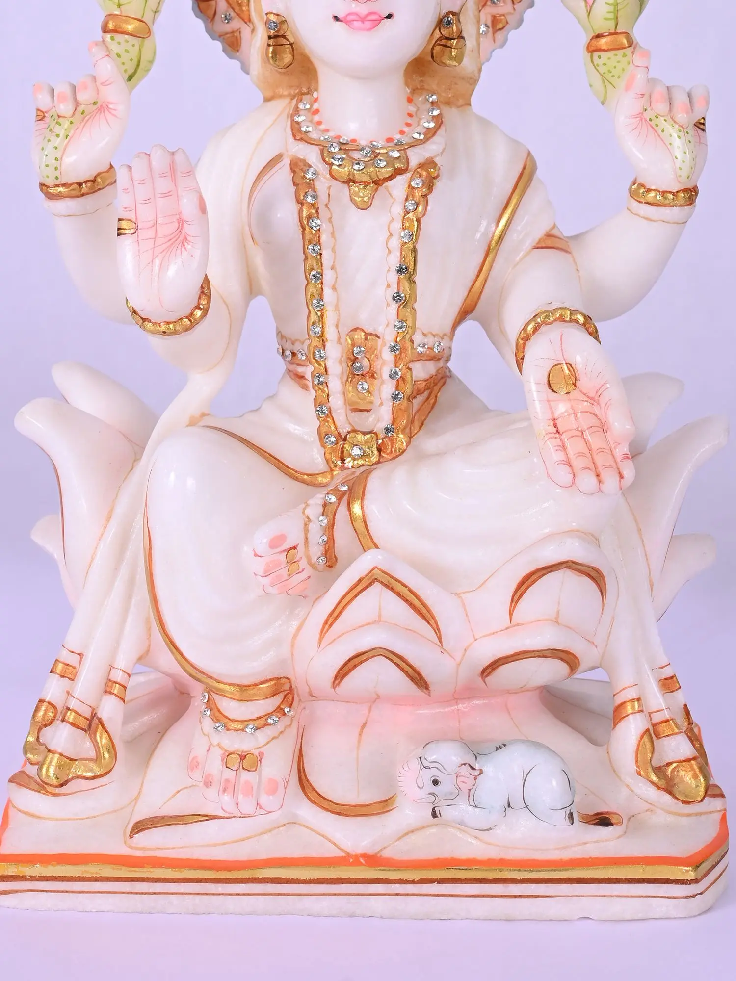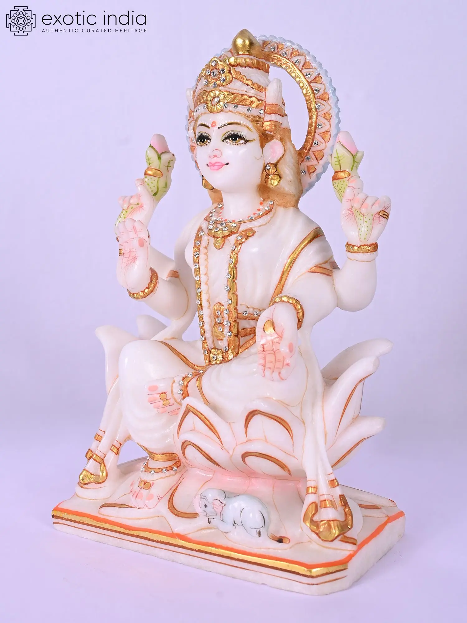 The serene countenance, adorned with finely painted eyes and subtle adornments, speaks of profound wisdom and gentle benevolence. You'll appreciate the traditional iconography, with lotus blossoms held in divine hands, symbolizing purity and spiritual enlightenment. The opulent embellishments, meticulously applied, highlight the radiant nature of the deity. The inclusion of the sacred mouse, the vahana or mount, at the base, further deepens the symbolic narrative.