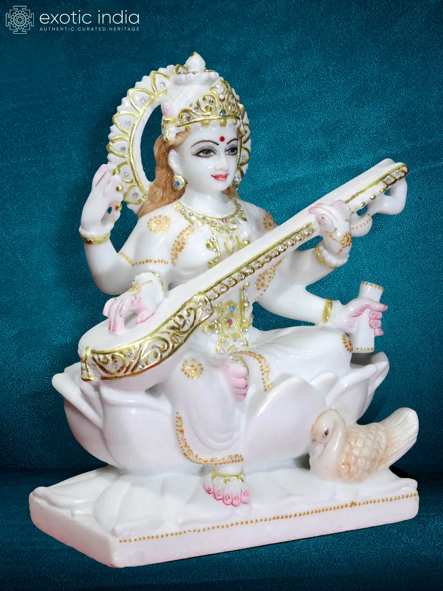 12" Seated Goddess Saraswati Sculpture | White Makrana Marble Idol