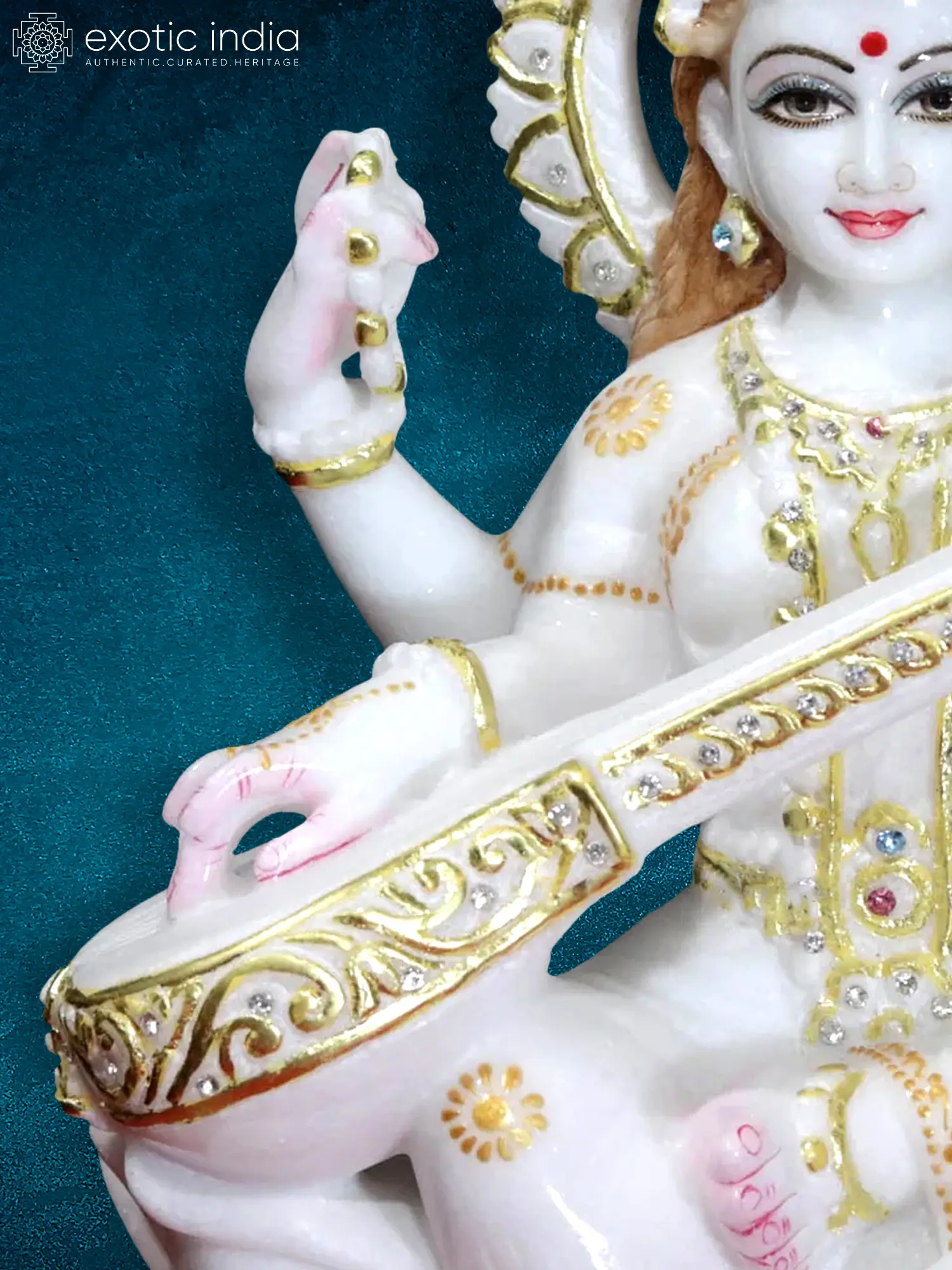 9" Statue Of Goddess Saraswati Holding Sitar | Super White Makrana Marble Statue