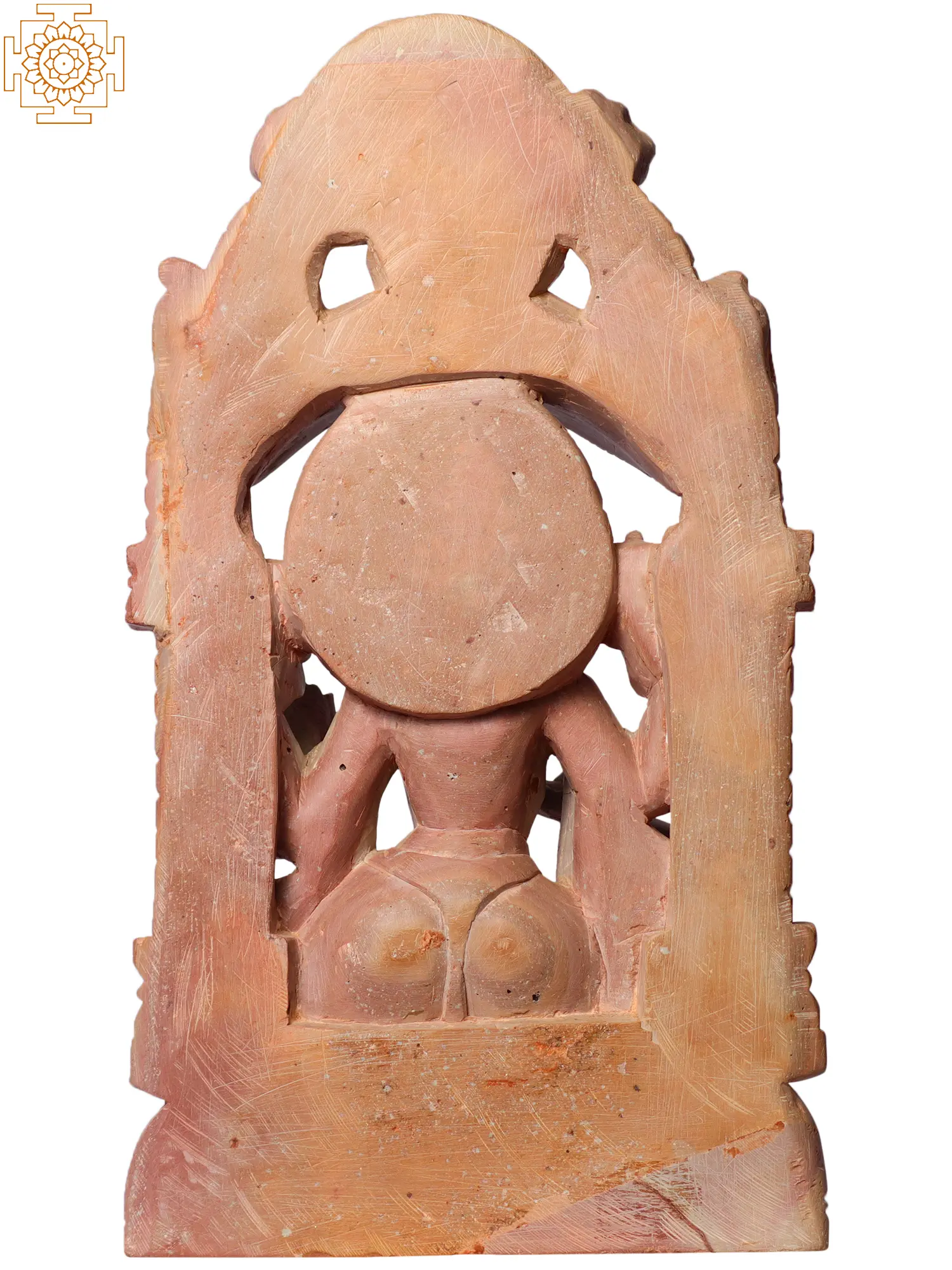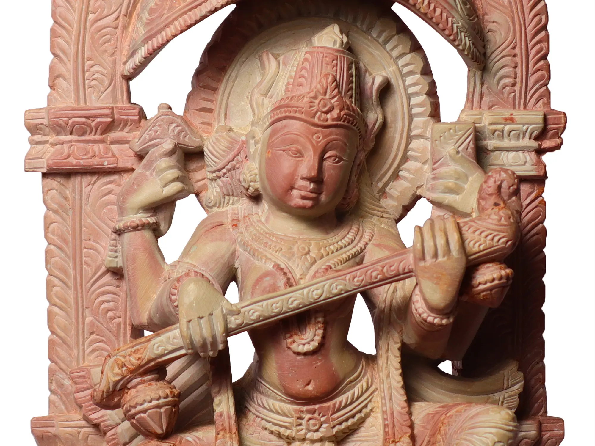 Saraswati is often invoked by students, artists, musicians, and scholars seeking inspiration and clarity. She is depicted with four arms, each symbolizing different aspects of her divine power. In this rendition, her hands are intricately sculpted, with one pair typically holding a book (representing knowledge) and the other a stringed musical instrument like the veena (symbolizing creativity and art). Her presence is said to dispel ignorance and bring forth understanding, much like the dawn dispels the darkness. The detailed carving on the throne and the surrounding archway, possibly depicting auspicious motifs or mythical creatures, further accentuates the divine narrative and the skill of the artisan. The floral and geometric patterns etched into the stone are characteristic of classical Indian iconography, adding layers of cultural significance to this piece. ––––––––––––––––––––