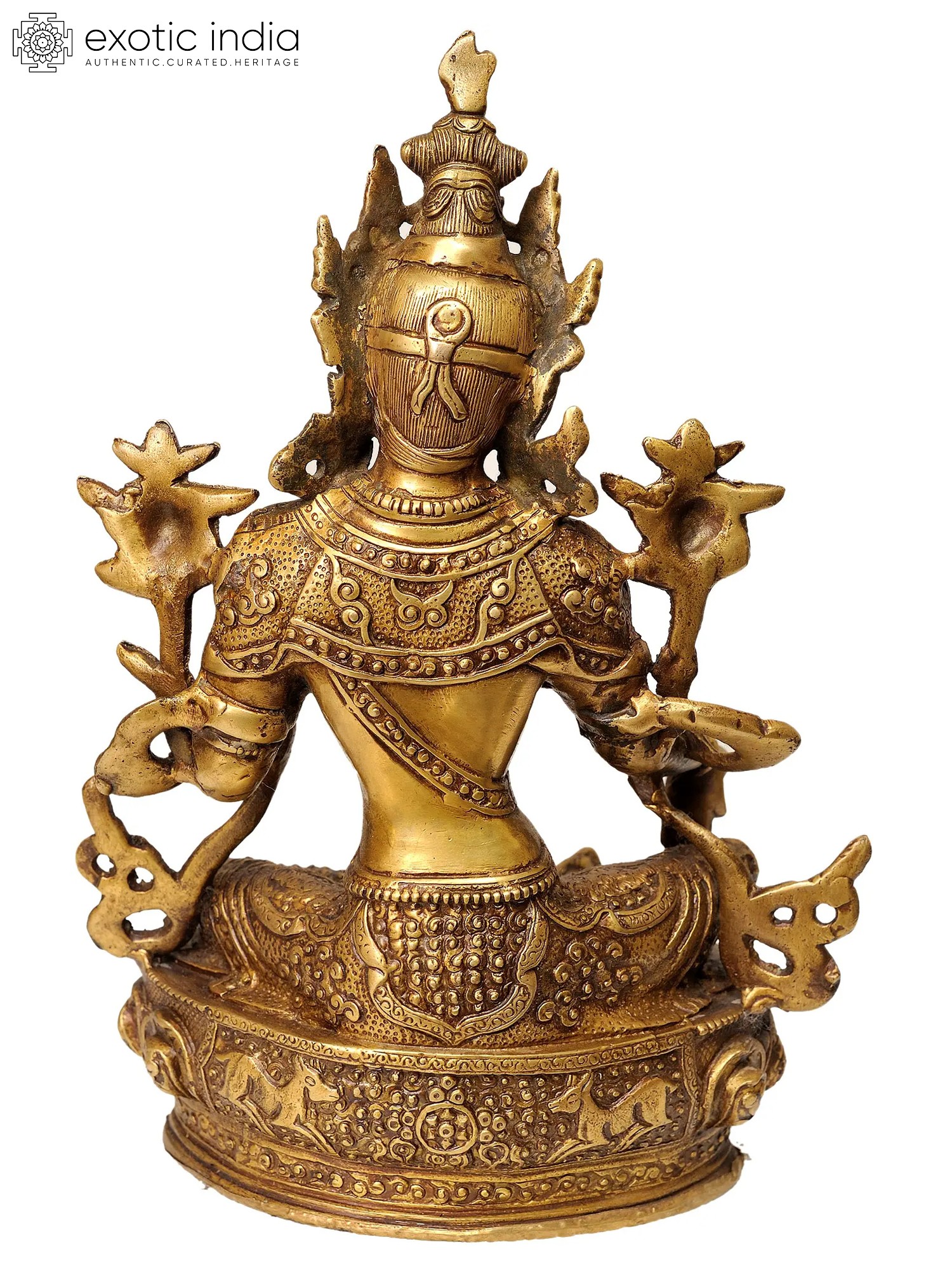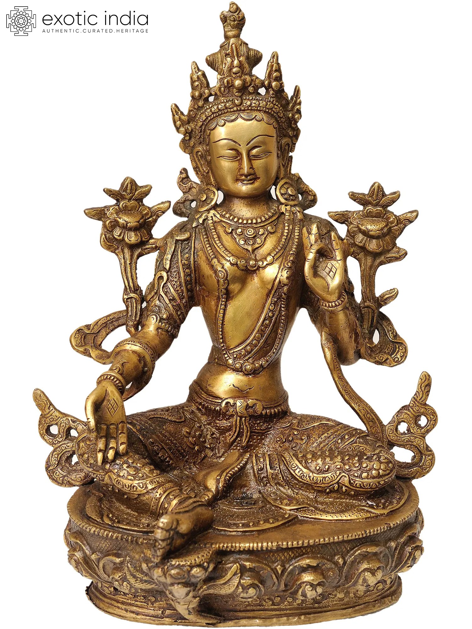 Embrace the serenity of Tibetan Buddhist philosophy with this handmade brass statue of Green Tara. Seated gracefully on a lotus, she embodies compassion and protection. In Tibetan Buddhism, Green Tara is revered as a source of boundless love and a refuge from suffering. This exquisite piece, handcrafted in India, is a symbol of enlightenment and a reminder of the path to inner peace. Place it in your sacred space to inspire a sense of grace and compassion in your daily life.