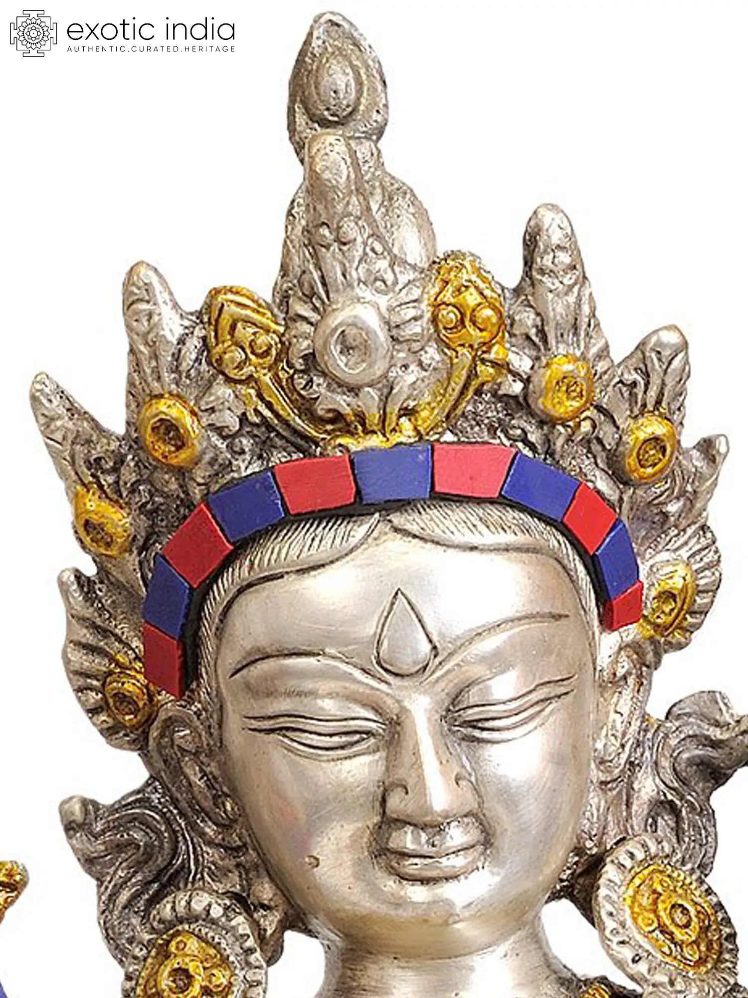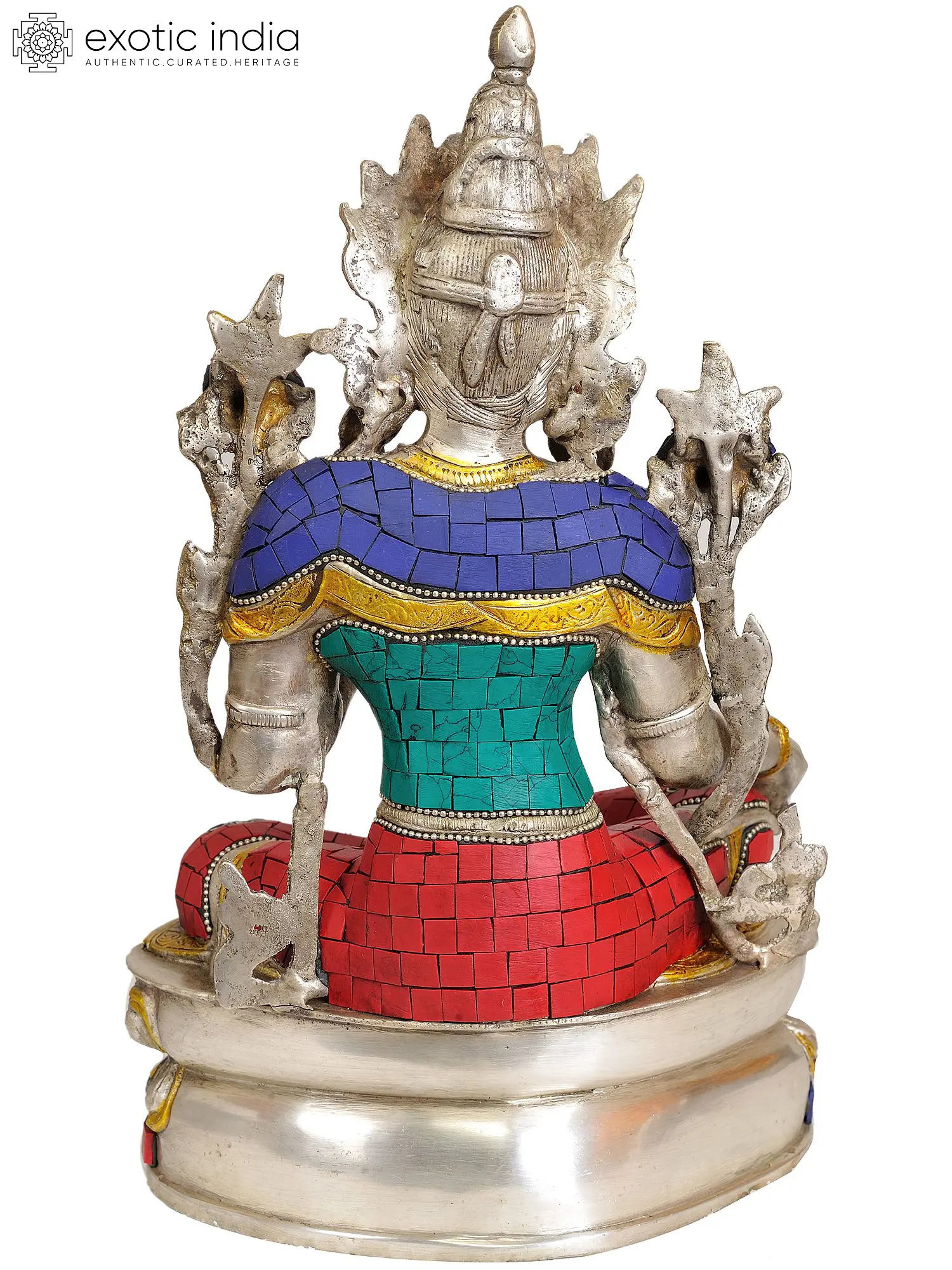 Crafted with exceptional skill in India, this statue is fashioned from brass and adorned with intricate inlay work. The vibrant hues of the inlaid stones – deep blues, striking reds, and calming greens – represent the multifaceted nature of Tara's enlightened activities. Her posture, seated in the meditative lotus position, signifies her deep spiritual practice and inner peace. One leg is bent, while the other is extended, symbolizing her readiness to descend and assist those in need at any moment. She holds a lotus flower in her left hand, a symbol of purity and spiritual unfolding, while her right hand is raised in the gesture of *abhaya mudra*, bestowing fearlessness and protection upon devotees. The elaborate crown and adornments reflect her regal status as a celestial goddess, while the intricate detailing on her garments showcases the meticulous craftsmanship involved.