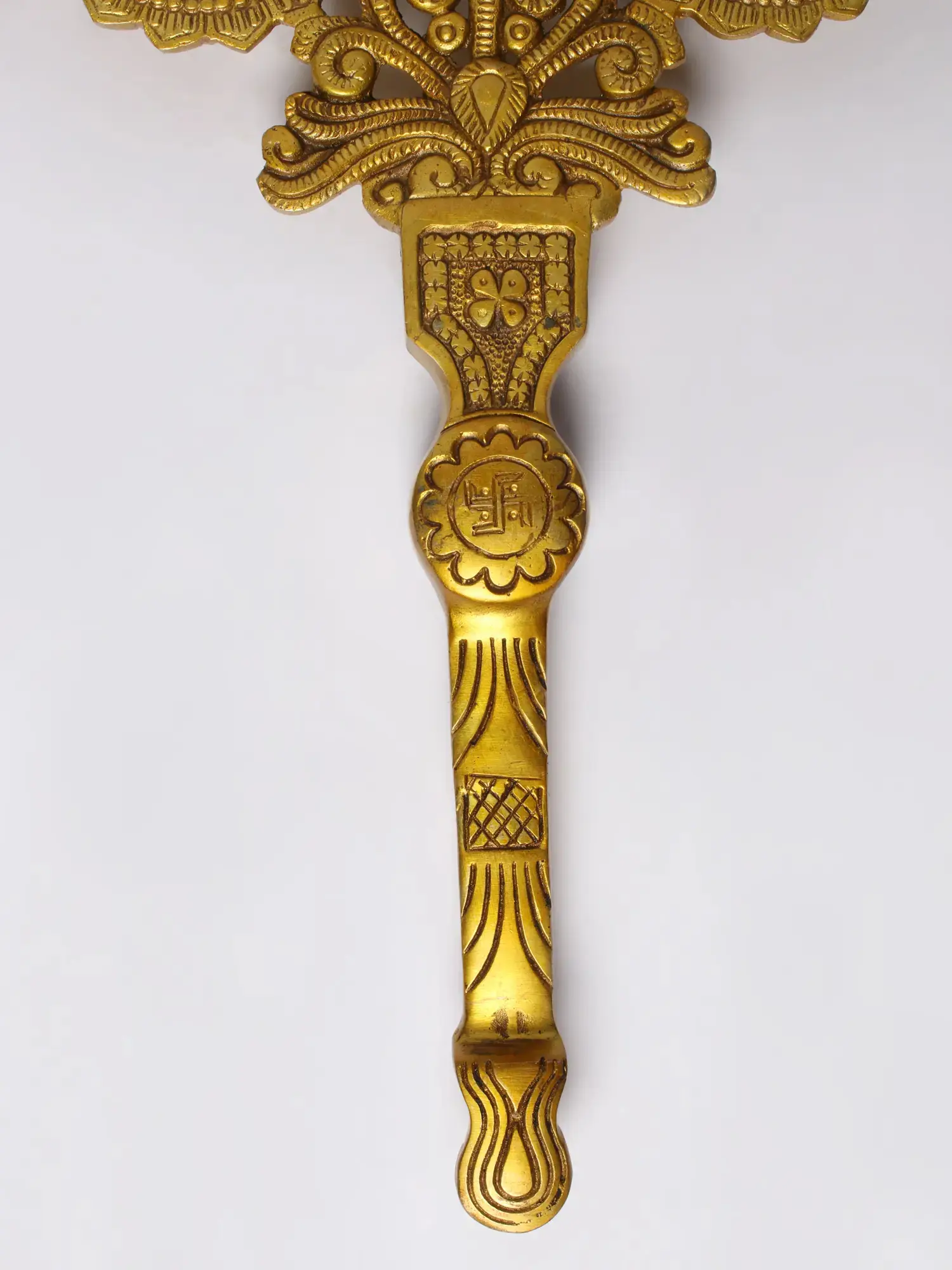 Breathtakingly beautiful, this arti lamp made in brass is assisted with a symbol of the swastika. This hand-held brass Aarti Diya is painstakingly designed and manufactured to deliver a small yet soothing flame of Karpora or Camphor wicks. It contains three compartments for the placement of the Camphor balls. All traditional Hindu celebrations include Aarti or the practice of showing devotion to the deities via the use of fire or incense. The Diya is made of brass, a valuable metal that lends gravitas to the event. Because of the combination of a brass container and a sturdy grip, the devotee may offer devotion in a pleasant manner. Including this component in daily worship services will guarantee that the respect process proceeds well.