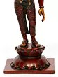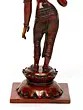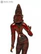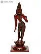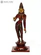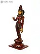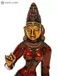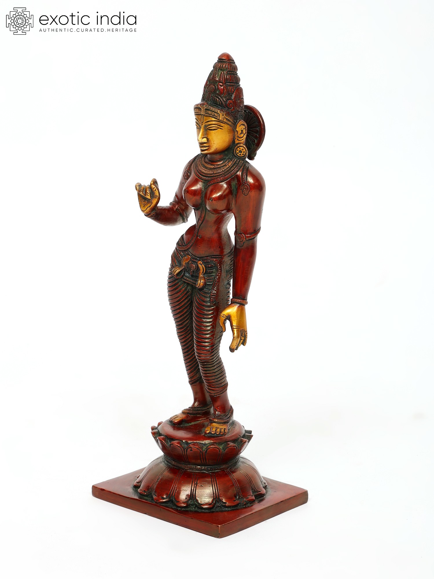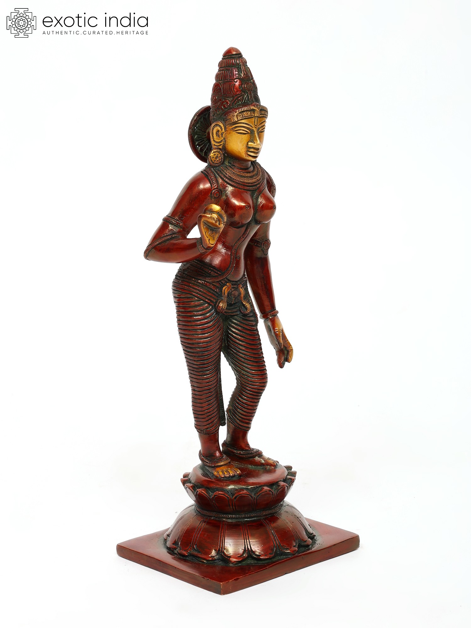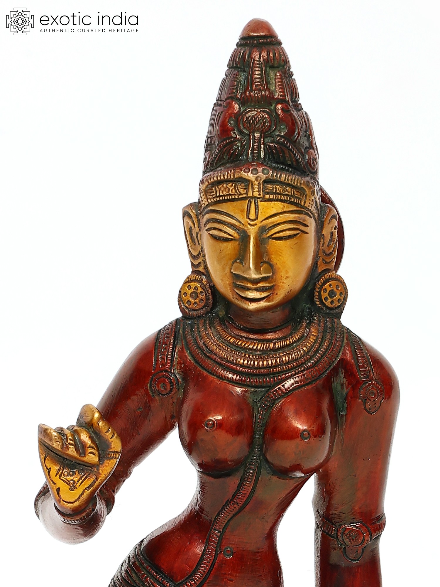 Goddess Parvati here stands at ease in the triple bent posture on a square lotus base. The left arm extends in lolahasta, whereas the right is bent at the elbow with the hand displaying the katakamukha gesture, intended to hold a flower. The goddess is depicted with a narrow waist, smooth flat stomach and a long dhoti clinging to her limbs, held at the waist by an elaborate waistband. She wears a towering crown and numerous ornaments including bangles, armlets and necklaces.
