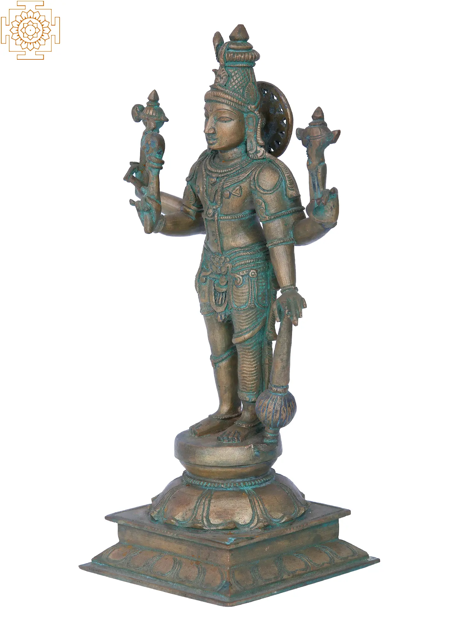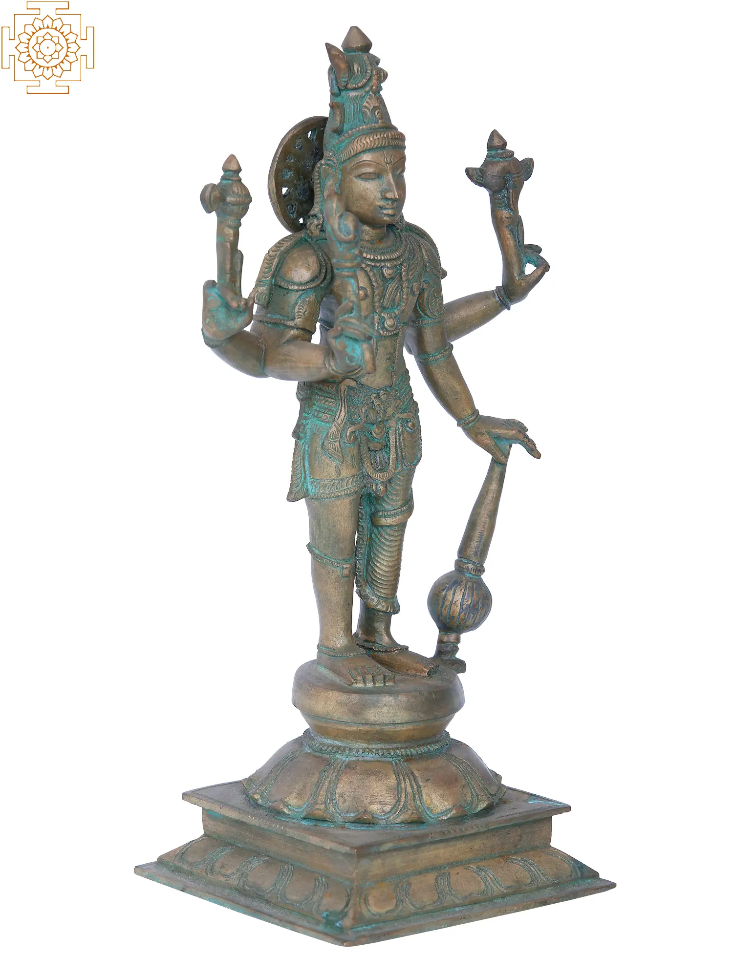 This exquisite bronze sculpture captures the benevolent form of Hariharan, a divine representation embodying the essence of Vishnu, the preserver of the cosmos. Crafted using the ancient Madhuchista Vidhana (lost-wax) technique, this piece is an homage to traditional South Indian metal casting, a craft perfected in the sacred town of Swamimalai. The Panchaloha composition, a sacred alloy of five metals, imbues the deity with a unique luster and enduring strength, mirroring the eternal nature of the divine. The artistic mastery evident in this statue speaks volumes of the skill of the artisans. Hariharan stands gracefully, adorned with intricate jewelry and a flowing dhoti that accentuates his divine form. The patina, a testament to the passage of time and the rich history of the bronze, adds a layer of depth and character, evoking a sense of antiquity and spiritual resonance. Each detail, from the serene expression on his face to the delicate rendering of his adornments, is meticulously shaped to bring forth a palpable sense of divine presence.