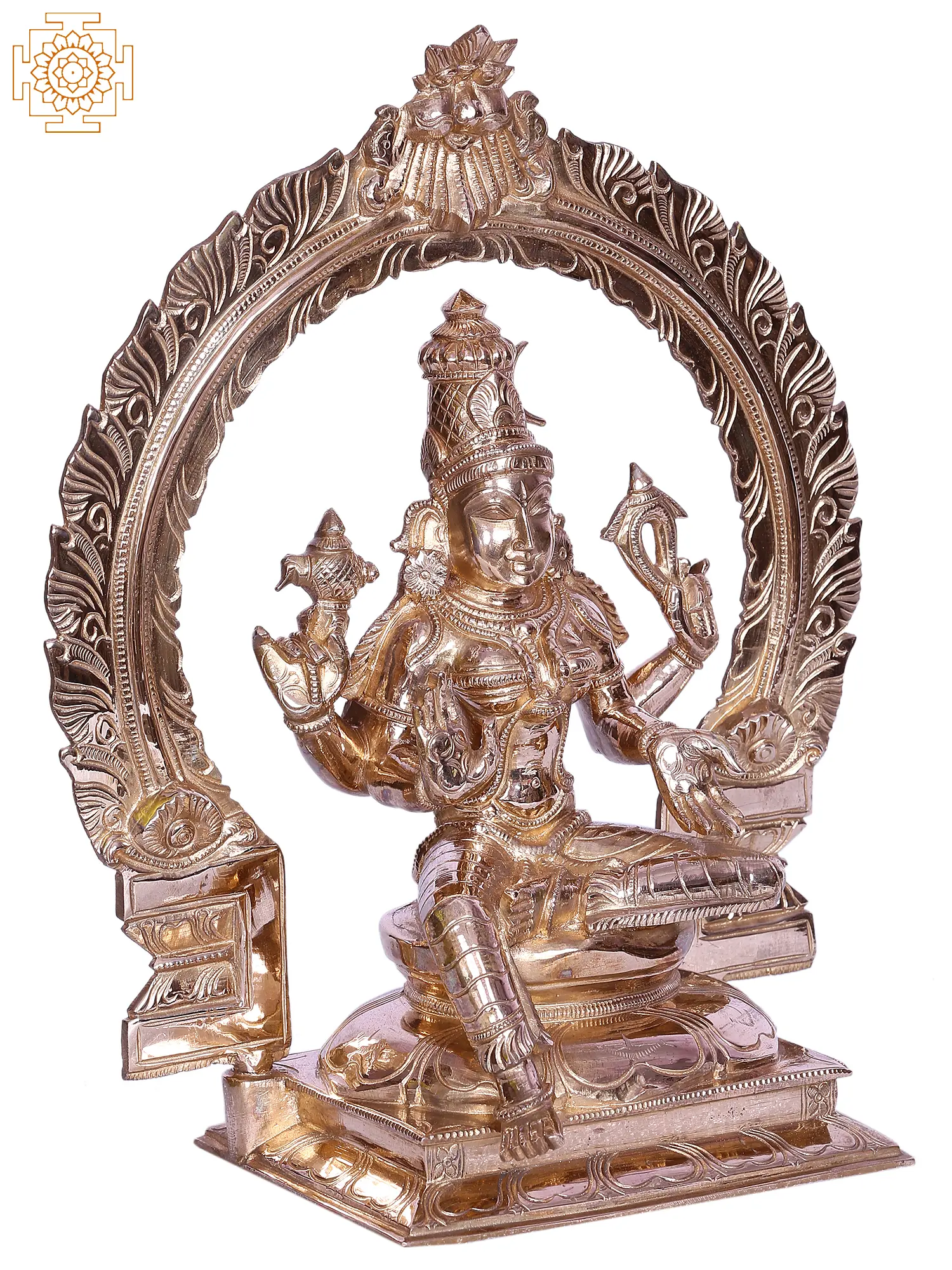 Poised in Lalitasana, Goddess Bhuvaneshwari emanates grace upon a lotus pedestal embraced by a “Prabhavali Arch”. Bronze tendrils breathe life into her divine form, where her upper hands delicately clasp a goad and a noose, signifying her ability to eliminate hurdles. The right hand, a beacon of fearlessness in “Abhaya Mudra”, contrasts the left, open in “Varada Mudra”, bestowing benevolence. Adorned regally, Goddess Bhuvaneshwari sits as the “fourth Mahavidya”, an embodiment of Mahadevi’s supreme aspects. This celestial manifestation of beauty and power signifies cosmic sovereignty, where the goddess reigns over the universe with compassion and authority.