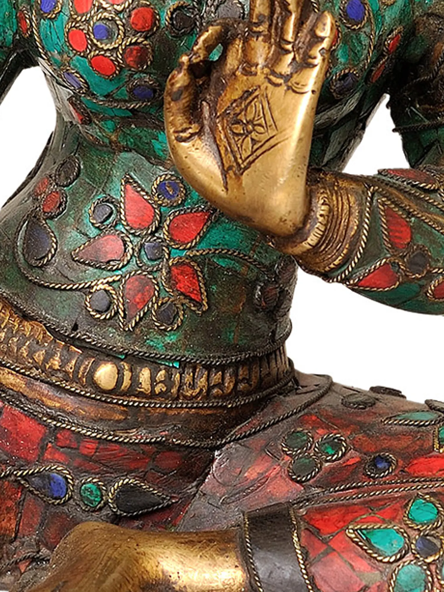The statuary is a testament to traditional Indian craftsmanship. The polished brass provides a warm, enduring foundation, while the inlaid stones – in hues of vibrant green, red, and deep blue – add a captivating depth and richness. These inlays are not merely decorative; they are often symbolic, with specific colors holding significance within Buddhist cosmology. The rich green evokes the fertility and abundance of nature, while red symbolizes compassion and life force, and blue represents wisdom and the vastness of the sky. The elaborate crown and jewelry further accentuate Tara's divine status, signifying her regal presence and her attainment of enlightened qualities. The meticulous inlay work, likely using techniques passed down through generations, transforms the brass into a masterpiece of devotional art.