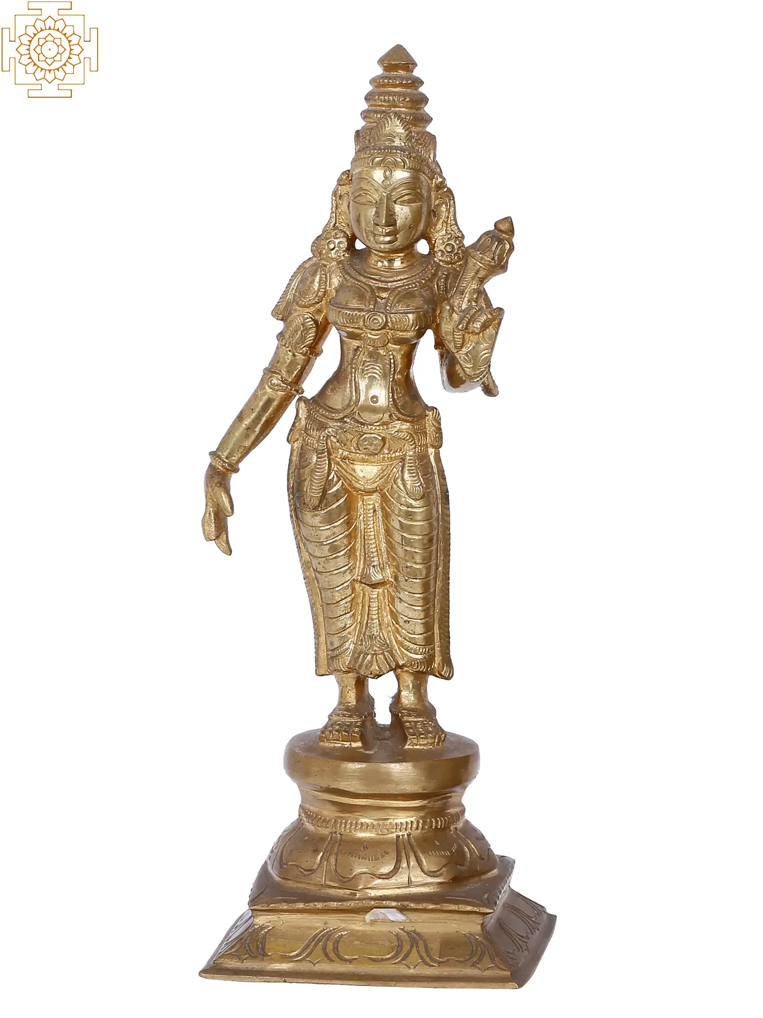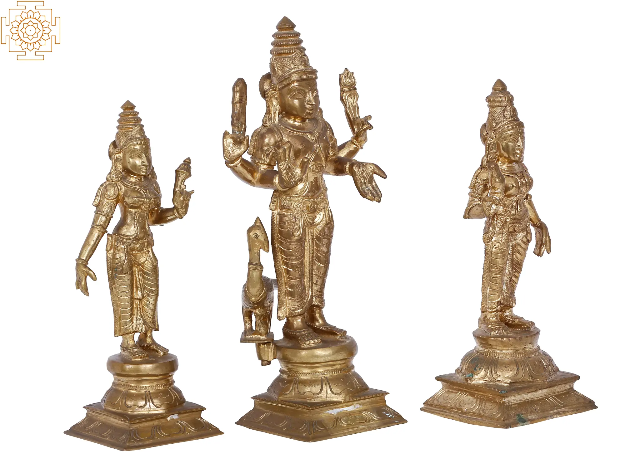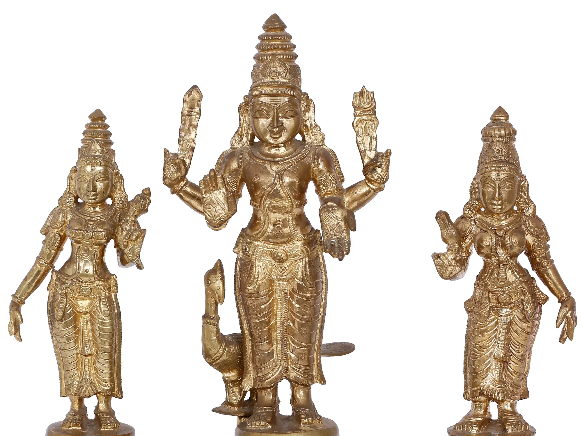 In this bronze rendition, Lord Murugan, the God of War, stands, an embodiment of divine grace, upon a lotus pedestal, flanked by his celestial consorts, Devasena and Valli. His form radiates majesty as He wields the “Soola Kathi”, “a diamond-shaped spear”, and the trident (Trishul), a symbol of cosmic authority. Murugan’s right hand extends in the reassuring “Abhaya Mudra”, symbolising fearlessness and courage while his left graciously offers blessings in Varada Mudra. To his right, Valli, “the enchanting tribal princess”, clutches a lotus bud, representing purity, while on his left, Devasena, “the daughter of Indira”, cradles a lotus, symbolising purity, prosperity and spiritual enlightenment. Together, they symbolise harmony, power, and the union of diverse cosmic forces in a celestial dance of cosmic balance.