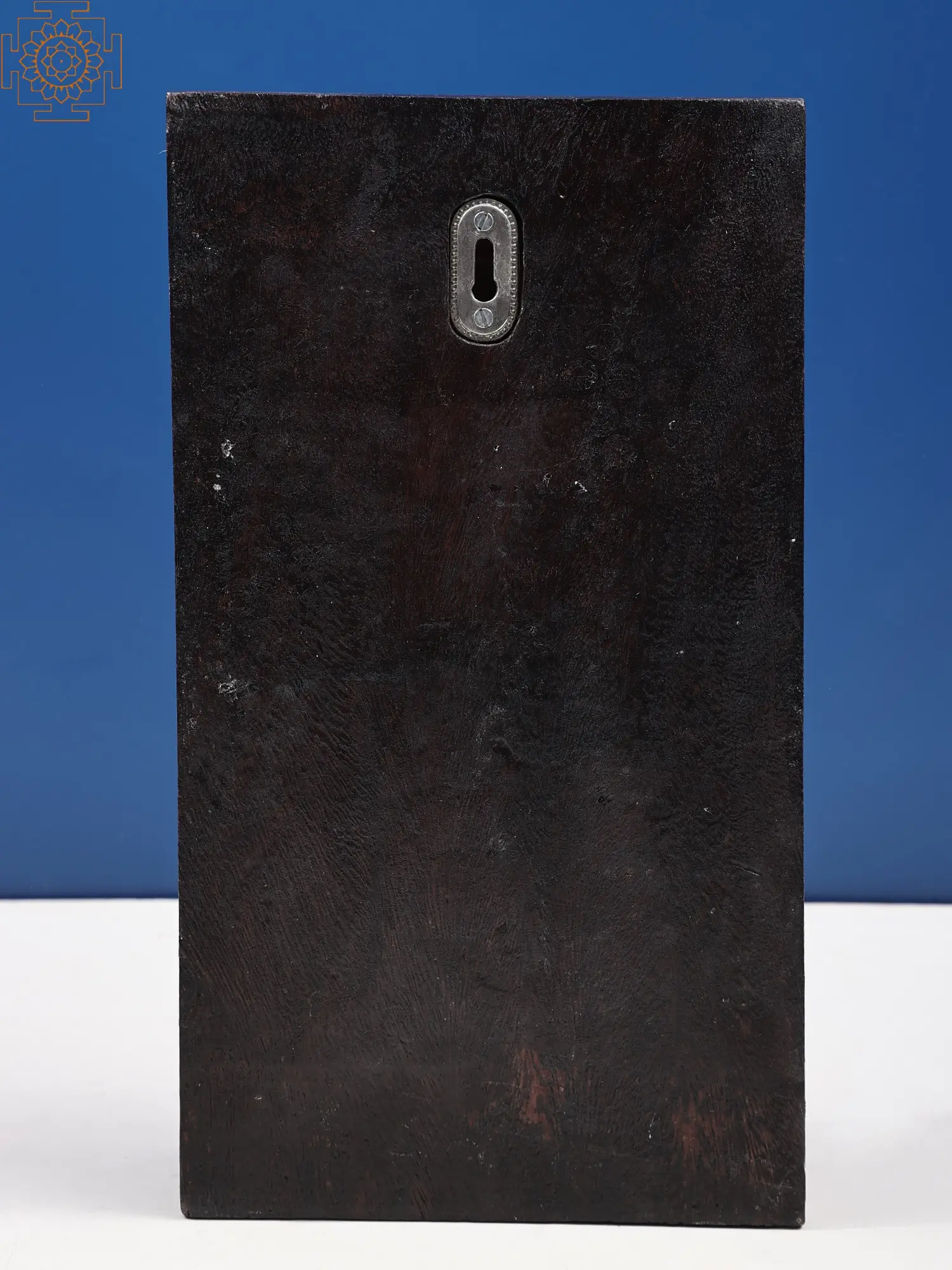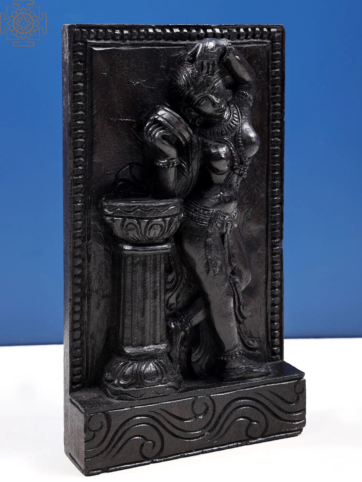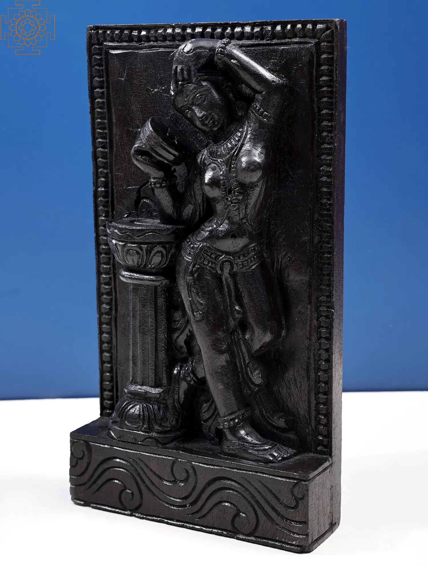 She stands tall and has an enticing figure. Her lover torso and décolletage are highlighted. The flow of her low waist fitted dhoti with traditionally styled kamarband that hangs from the front and sides accentuates her magnificent beauty. The jewels she is adorned with are uniformly placed on her bodice and match the gorgeous crown that adorns her head. Apart from its essence, the sculptor has paid close attention to the way it is carved, and the inky black coloured texture of the wood adds to its allure.