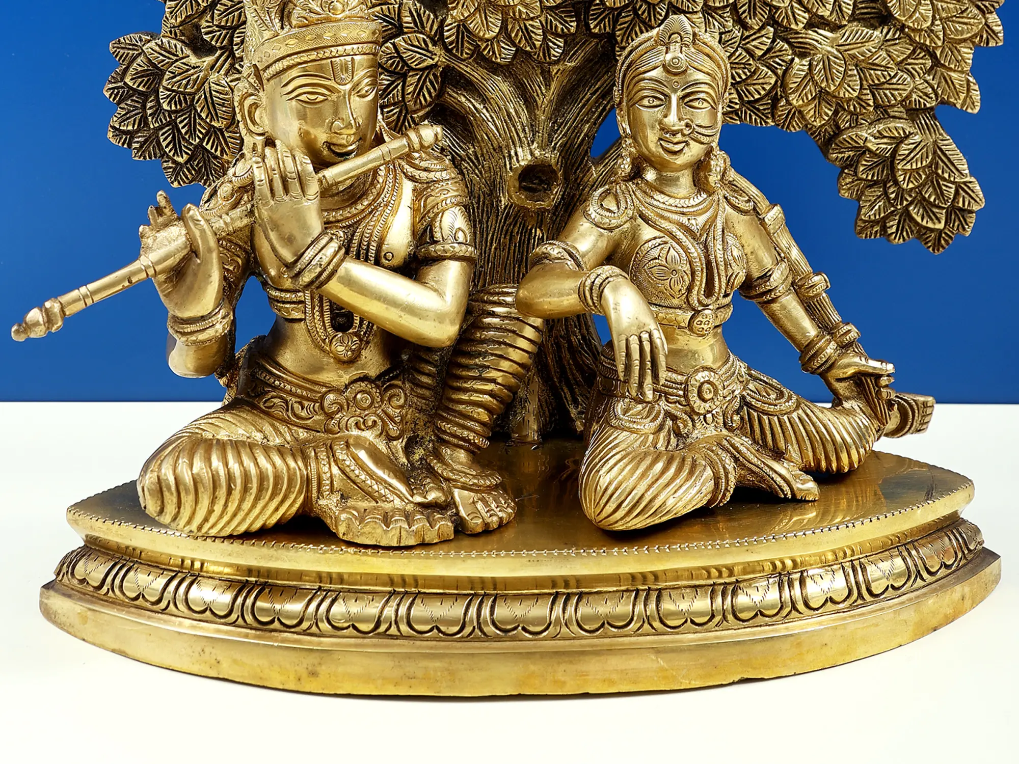 This exquisite brass statue captures a timeless moment of divine love and harmonious music, depicting Lord Krishna playing his enchanting flute for his beloved Radha. Crafted with meticulous detail by skilled artisans in India, this piece embodies the essence of spiritual devotion and artistic mastery. The lustrous brass, polished to a warm sheen, lends a sense of enduring beauty and sacredness to the rendition. The scene unfolds beneath the sheltering branches of a magnificent tree, its leaves intricately rendered, suggesting a tranquil grove in Vrindavan where Krishna's divine pastimes unfolded. Lord Krishna, the divine cowherd, is depicted in his characteristic pose, eyes closed in blissful concentration as the melody flows from his flute. His delicate fingers are poised, as if coaxing celestial notes that would draw the hearts of all beings, especially Radha, towards him. The divine sound of Krishna's flute, the *Venu*, is believed to have the power to captivate the soul, awaken dormant spiritual longings, and even influence the very elements. Beside him, Radha, the epitome of selfless love and devotion, is seated gracefully. Her gaze is fixed upon Krishna, her expression filled with adoration and rapturous joy. Her posture and attire reflect the traditional depiction of a Gopi, adorned with ornaments that speak of her earthly beauty intertwined with her divine essence. The story of Radha and Krishna is not merely a romantic tale; it is a profound allegory for the soul's yearning for the divine, the ultimate union of the individual spirit with the Universal Consciousness. Their love transcends earthly boundaries, representing the purest form of *Bhakti* or devotional service. The base of the statue is ornately carved, providing a stable and elegant foundation for this divine tableau. The entire composition is a testament to the rich cultural heritage of India and its deep spiritual traditions. This handmade creation is more than just an object of art; it is a conduit to the divine, a reminder of the omnipresent nature of love and music in the spiritual journey. It serves as a powerful symbol of devotion, peace, and the eternal love that binds the devotee to the divine. ––––––––––––––––––