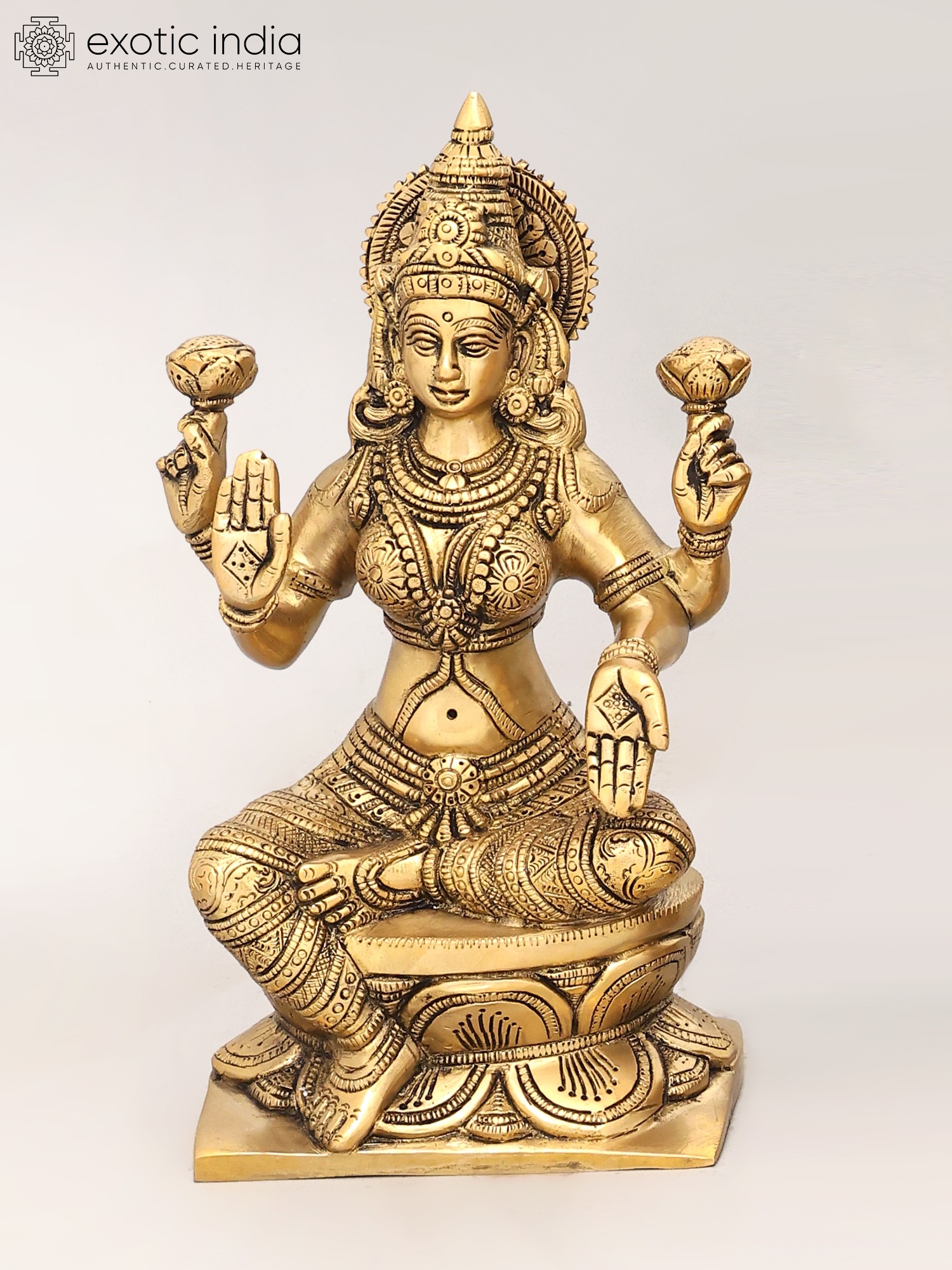 The transcendental form of Mother Lakshmi is extremely beautiful. She is the emblem of beauty and mercy. She sees every individual soul as her own child and whoever approaches her with faith and devotion, certainly gets the mercy of Lakshmi Devi. She is often depicted wearing a red saree and holding different items in her four arms. She holds a lotus flower in each of her two upper arms. With one of her lower hands, she holds a pot full of gold coins (representing wealth) while the other hand stays in a mudra that signifies charity.