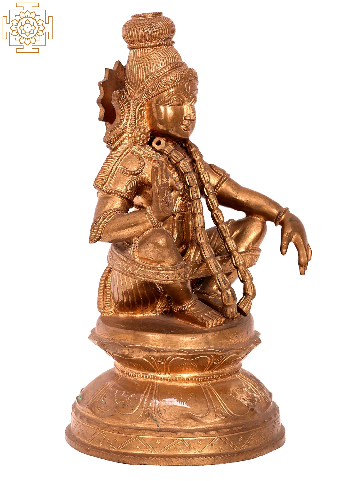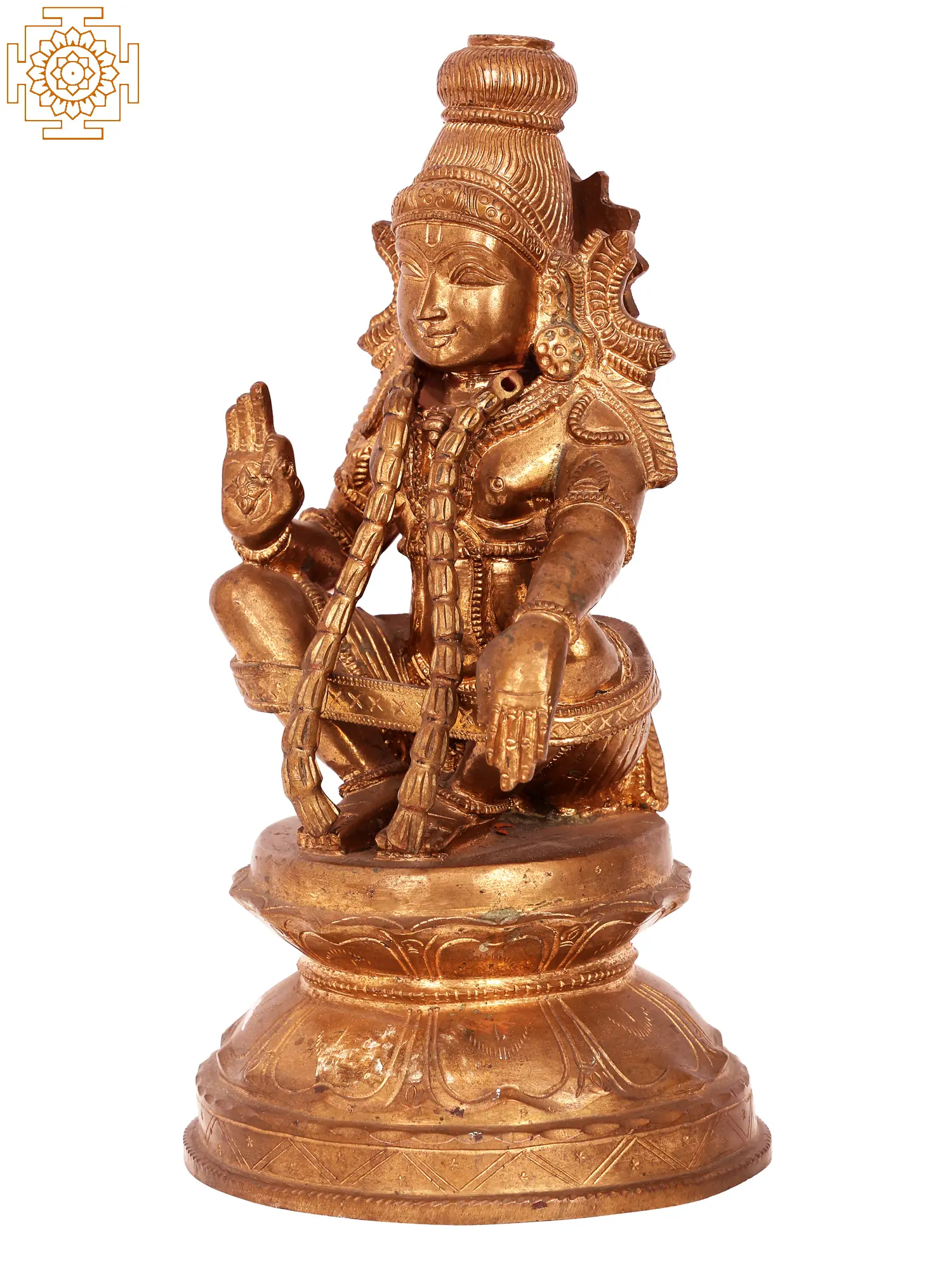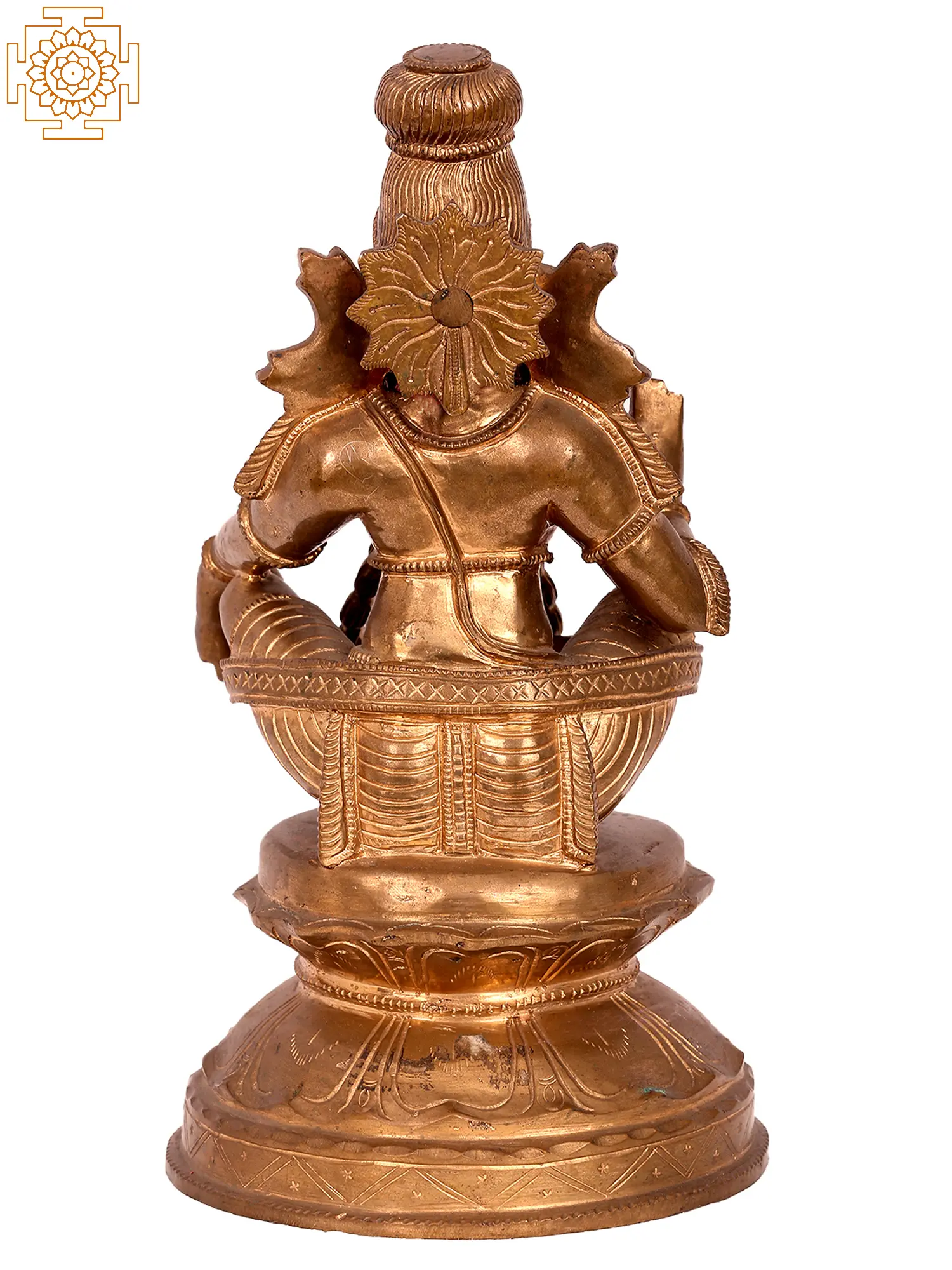 This exquisite bronze idol captures the divine essence of Lord Ayyappan, a revered deity in Hinduism known for his wisdom, strength, and compassion. Seated in a serene meditative posture, this figure is a testament to the ancient art of "Madhuchista Vidhana," a sophisticated lost-wax casting technique perfected in Swamimalai, a region renowned for its bronze casting traditions. The Panchaloha composition, a sacred alloy of five metals—gold, silver, copper, tin, and iron—imparts a unique luminescence and durability to the idol, reflecting centuries of artisanal mastery and spiritual significance. The intricate detailing of this sculpture speaks volumes about the skill of the artisans. From the serene expression on Lord Ayyappan's face, conveying a sense of inner peace and profound understanding, to the elaborate ornamentation adorning his form—the ornate headdress, the sacred thread, and the finely crafted jewelry—every element is rendered with meticulous care. The posture, with his legs folded and one hand raised in a gesture of blessing or assurance, invites contemplation and spiritual connection. This depiction often symbolizes Lord Ayyappan's role as a dispeller of fear and a bestower of boons, a protector of dharma, and a guide on the path to spiritual enlightenment. ––––––––––––––––––