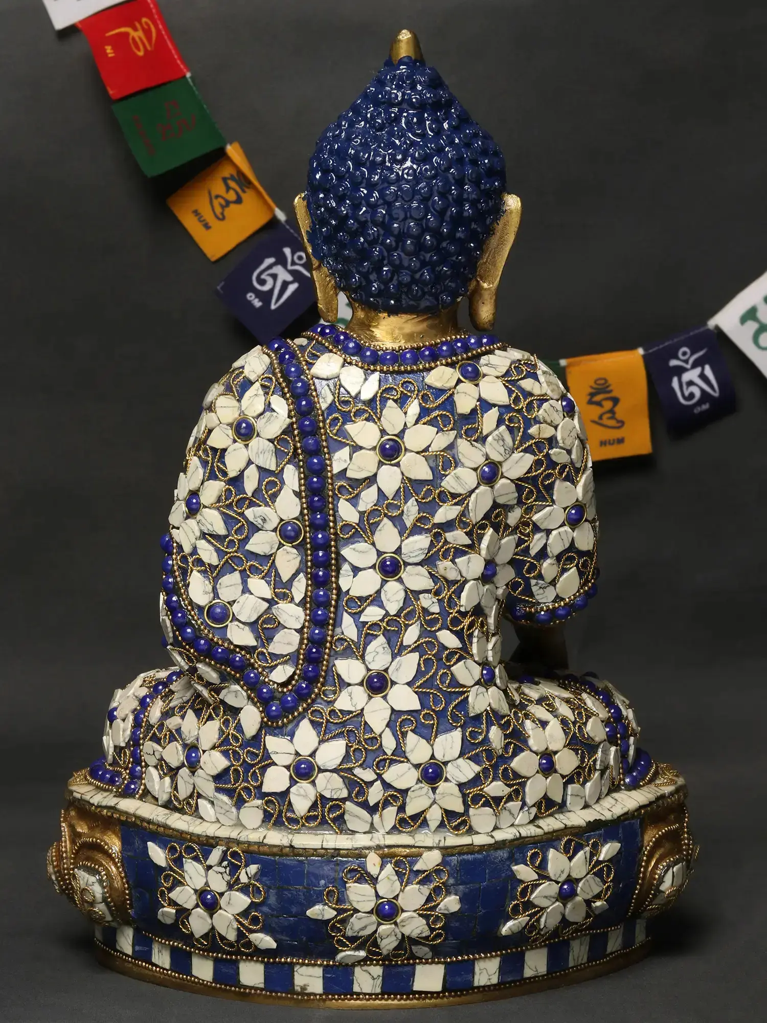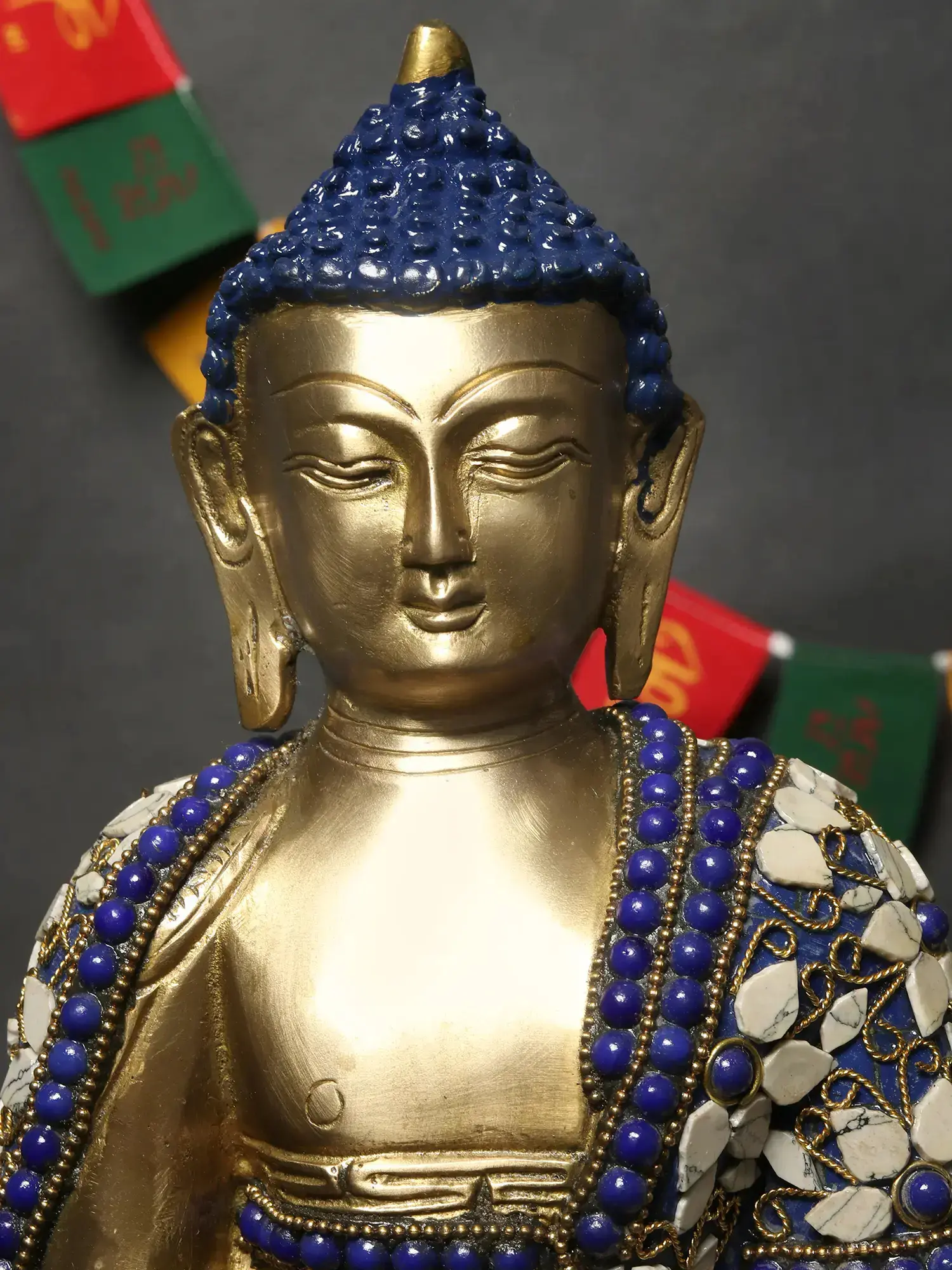 11" Bhumisparsha Shakyamuni Buddha Idol in an Adorable Stone Studded Robe | Handmade Brass Statue