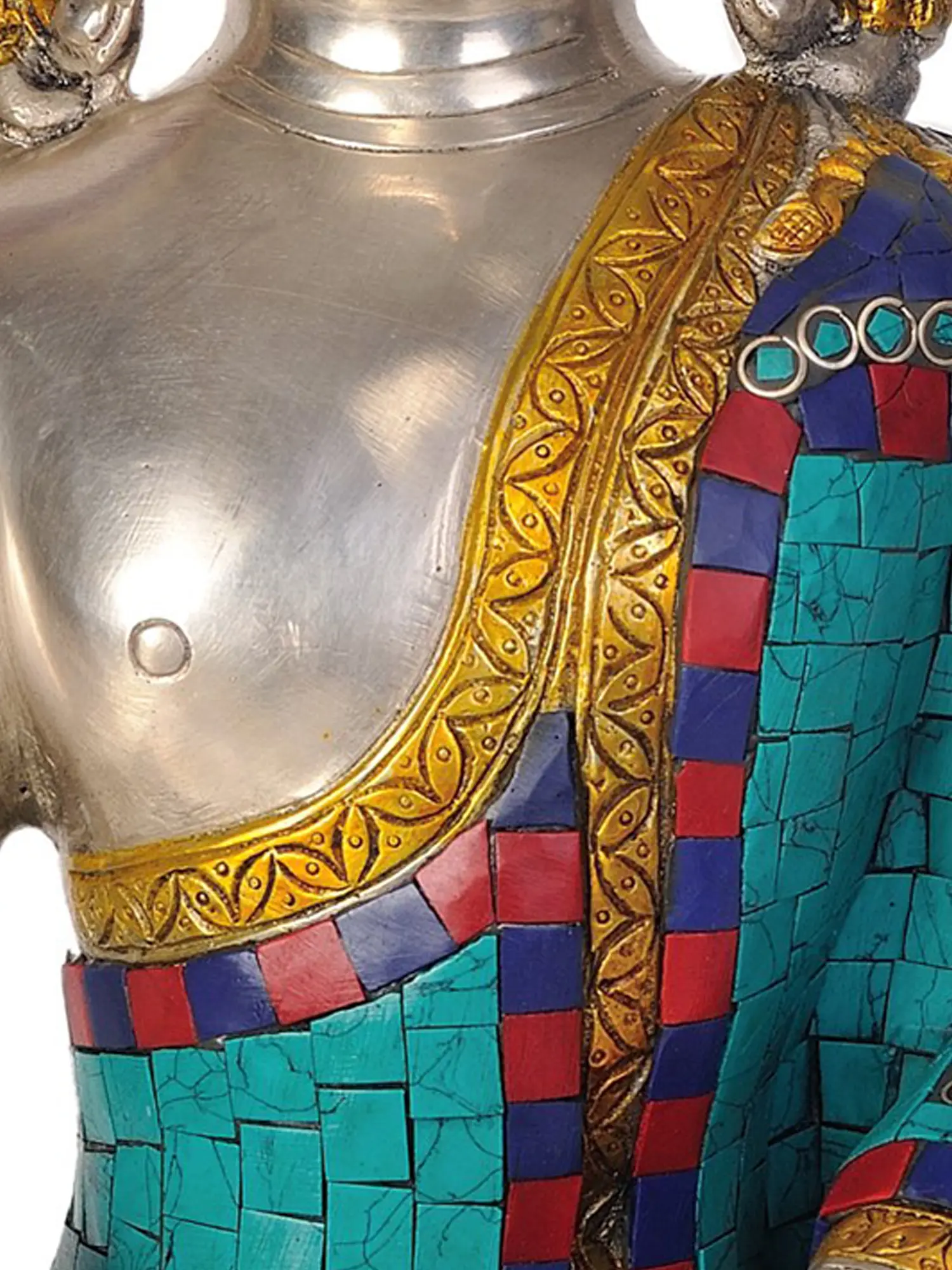 This magnificent brass statue captures Lord Buddha in the powerful Bhumisparsha Mudra, a gesture of profound significance in Buddhist iconography. Known as the "Earth-touching gesture," this mudra symbolizes the moment of Buddha's enlightenment under the Bodhi tree, where he called upon the Earth goddess to bear witness to his attainment and refute the temptations of Mara. With his right hand gracefully resting on his right knee, fingers pointing downwards towards the earth, and his left hand in his lap, this posture embodies unwavering resolve, grounding, and the triumph of wisdom over ignorance. The intricate inlay work adorning the robe and seat of the Buddha adds an unparalleled layer of beauty and symbolism. Vibrant tesserae of turquoise, lapis lazuli, and carnelian are meticulously set into the brass, creating a rich tapestry of color that evokes the celestial and the earthly realms. The turquoise hues speak of clarity and communication, while the deep blues of lapis lazuli represent wisdom and truth. The warm reds of carnelian symbolize vitality and courage. These precious stones, often associated with protective qualities and spiritual connection in various cultures, enhance the meditative and devotional appeal of the statue.