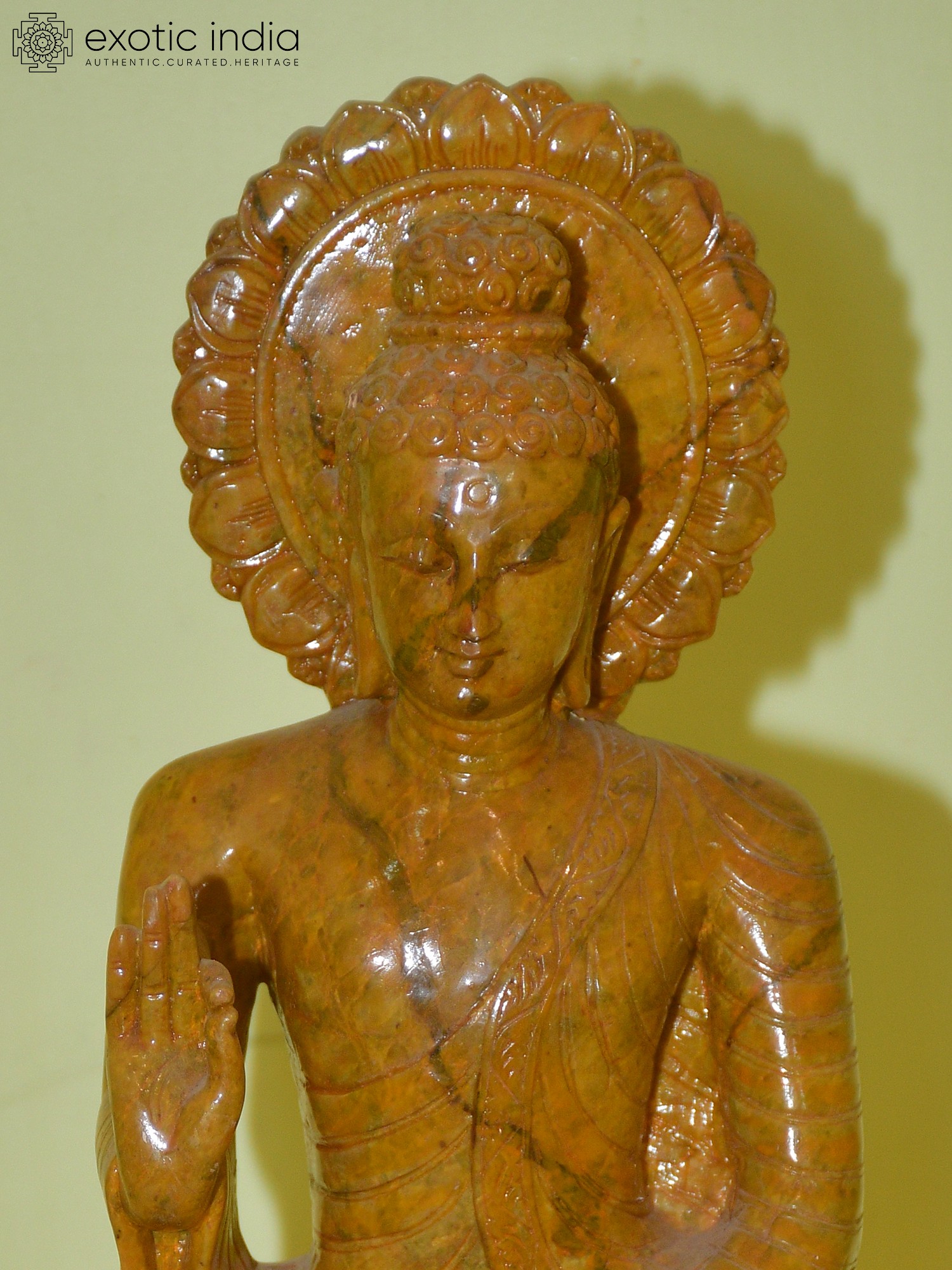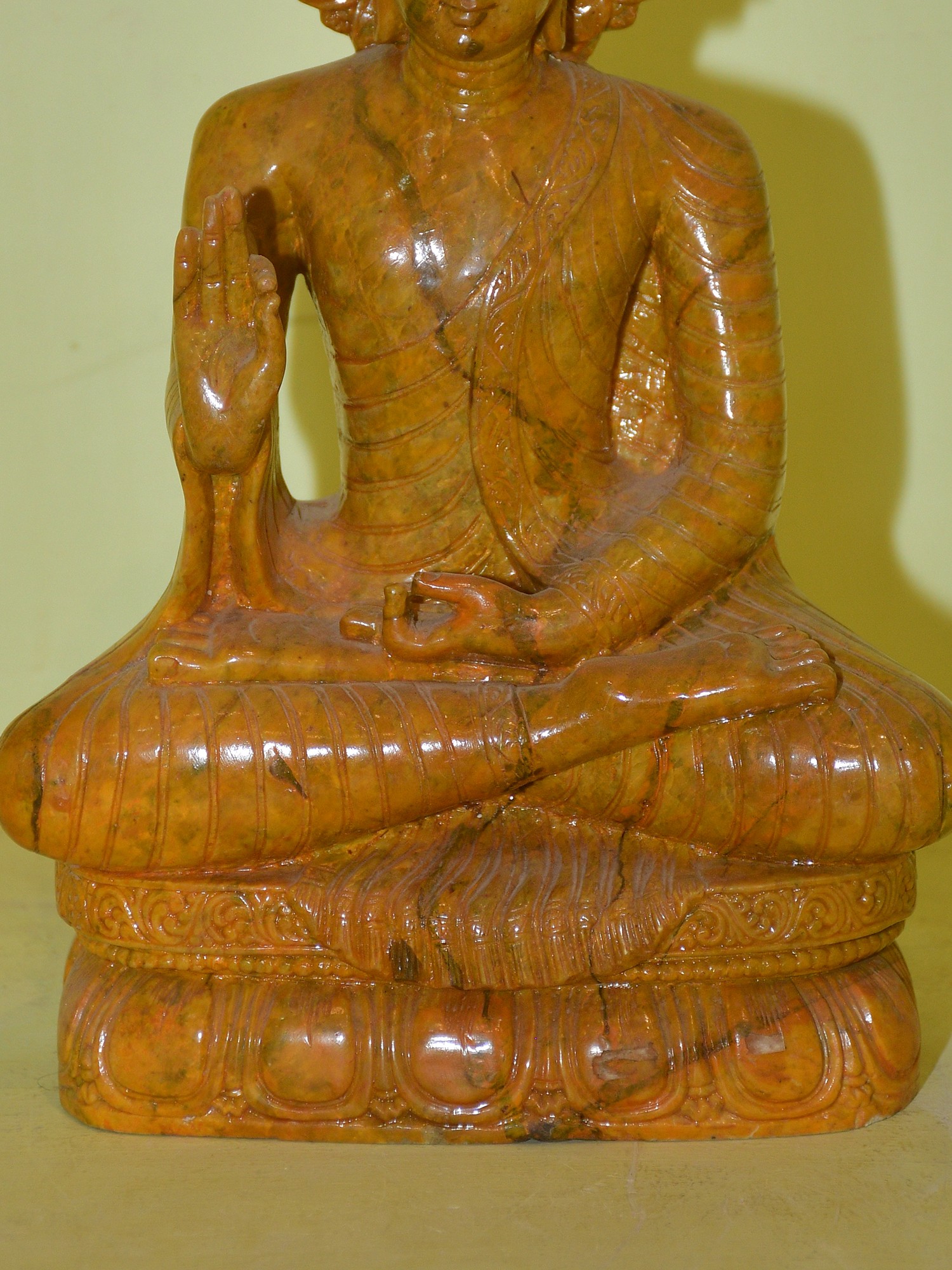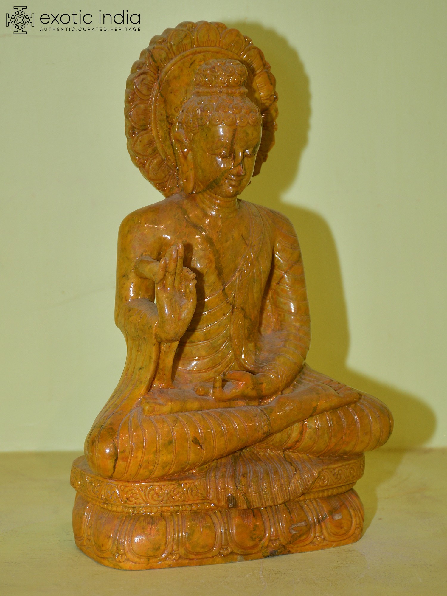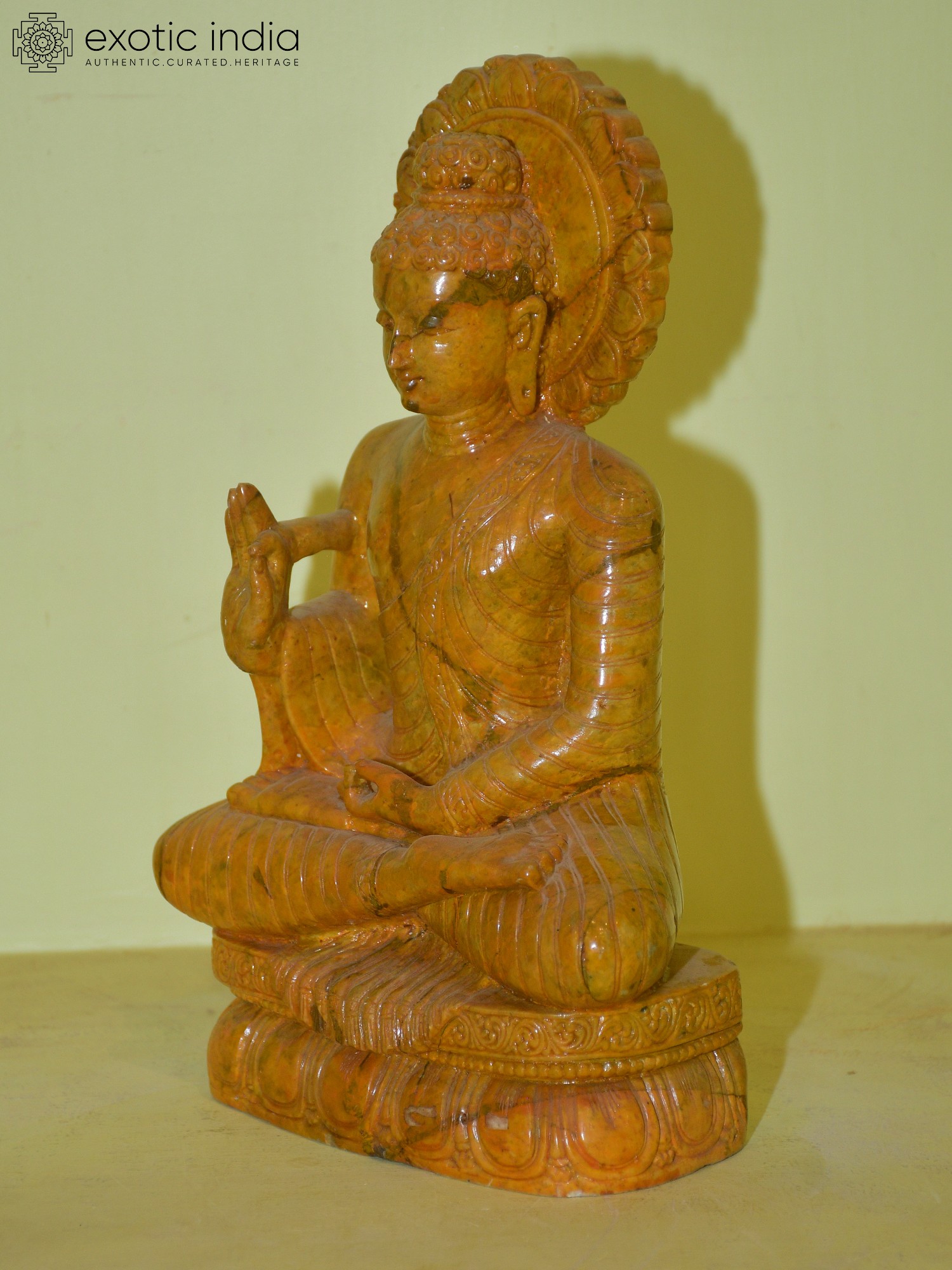 This exquisite statue depicts Lord Buddha in the Vitarka Mudra, a gesture of argumentation, discussion, and the transmission of Buddhist teachings. It is a powerful representation of the Buddha as a spiritual guide, inviting contemplation and wisdom. The stone, sourced from the mineral-rich lands of Orissa, boasts a warm, earthy hue that enhances the serene presence of the deity. Each subtle vein and natural marbling within the stone tells a story of its geological journey, making each sculpture a unique masterpiece. The delicate carving details, from the flowing robes to the serene facial expression, are a testament to the exceptional skill of the artisans.